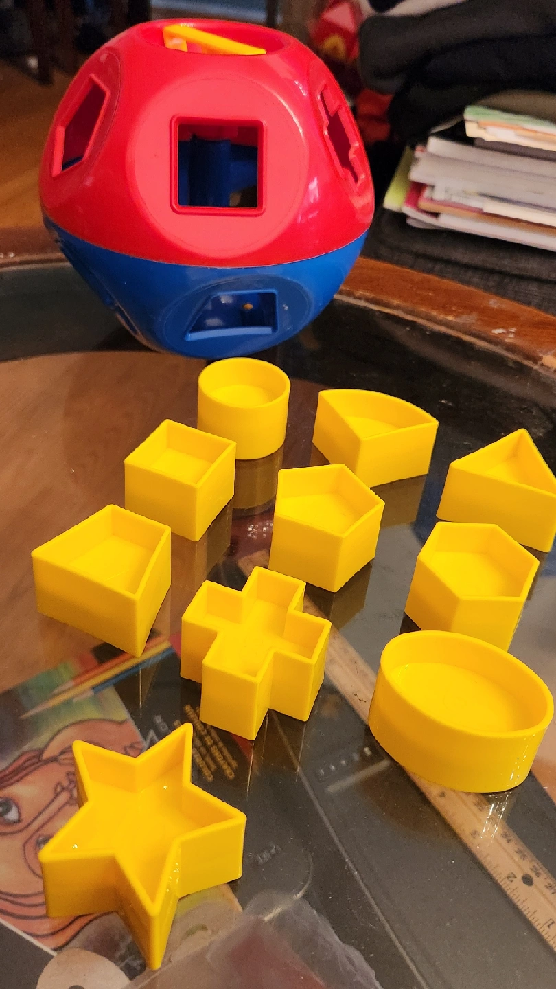 Shape sorter toy with a red and blue ball and yellow blocks! It includes various shapes like squares, circles, triangles, stars, and more. Porch pick up in Lindenhurst, IL Cash, Zelle or credit card accepted