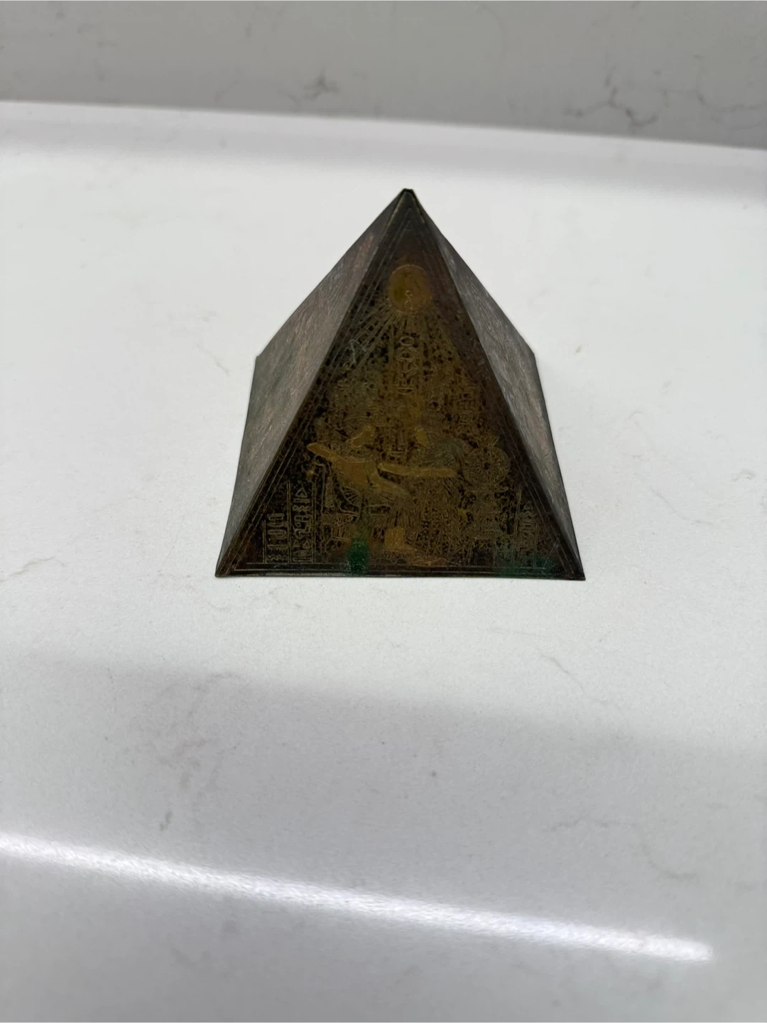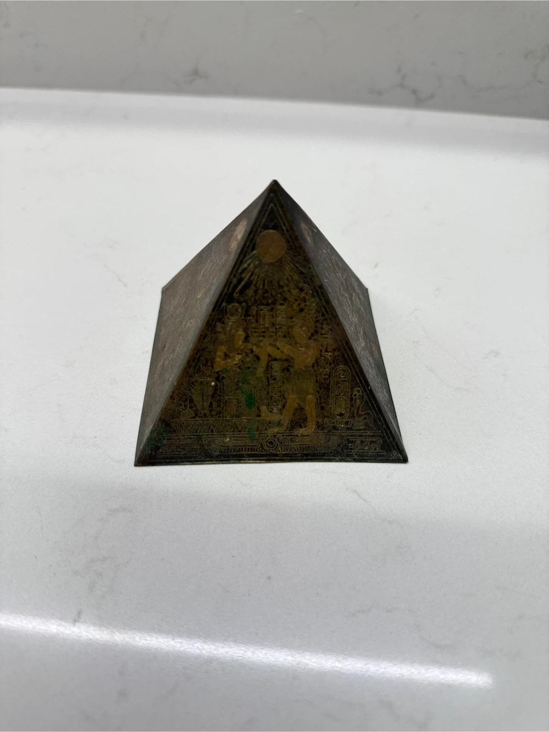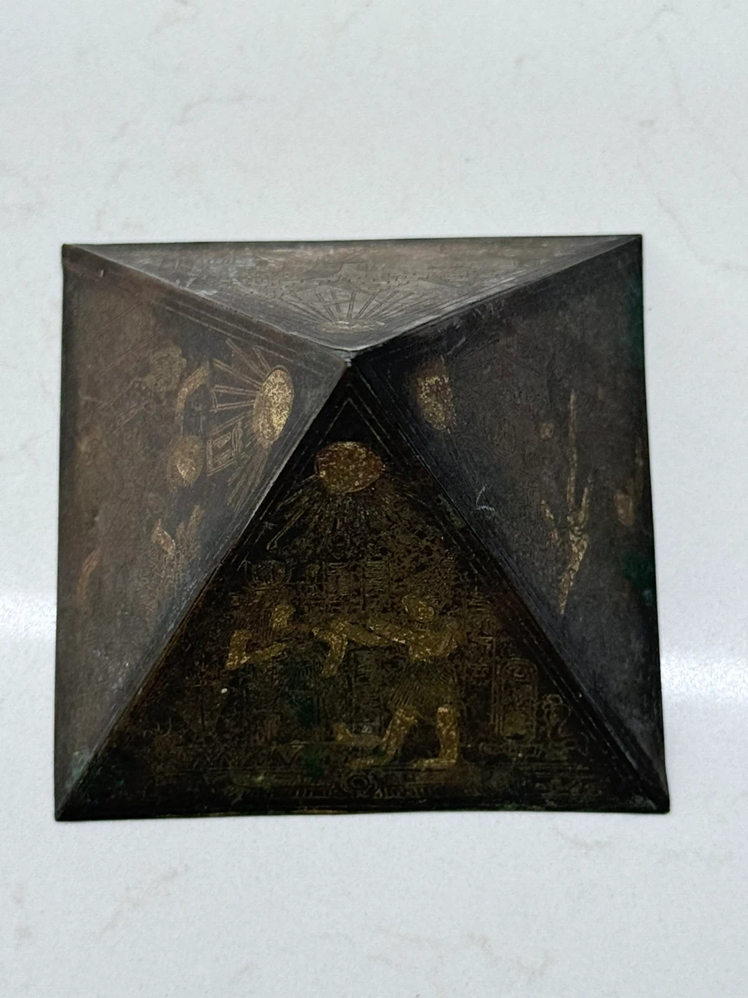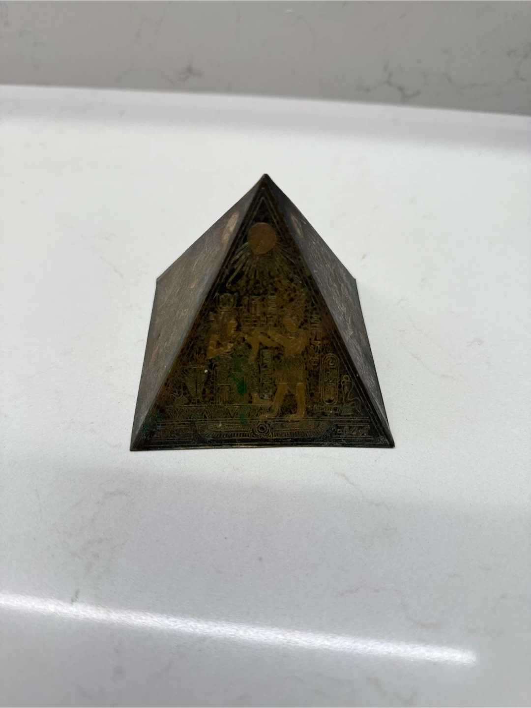 1000+Vintage brass Egyptian-themed pyramid decoration. It features detailed engravings of Egyptian figures and symbols on each side. Beautifully handcrafted piece. Iโm selling all my collectibles and gifts to find a new home! ๐