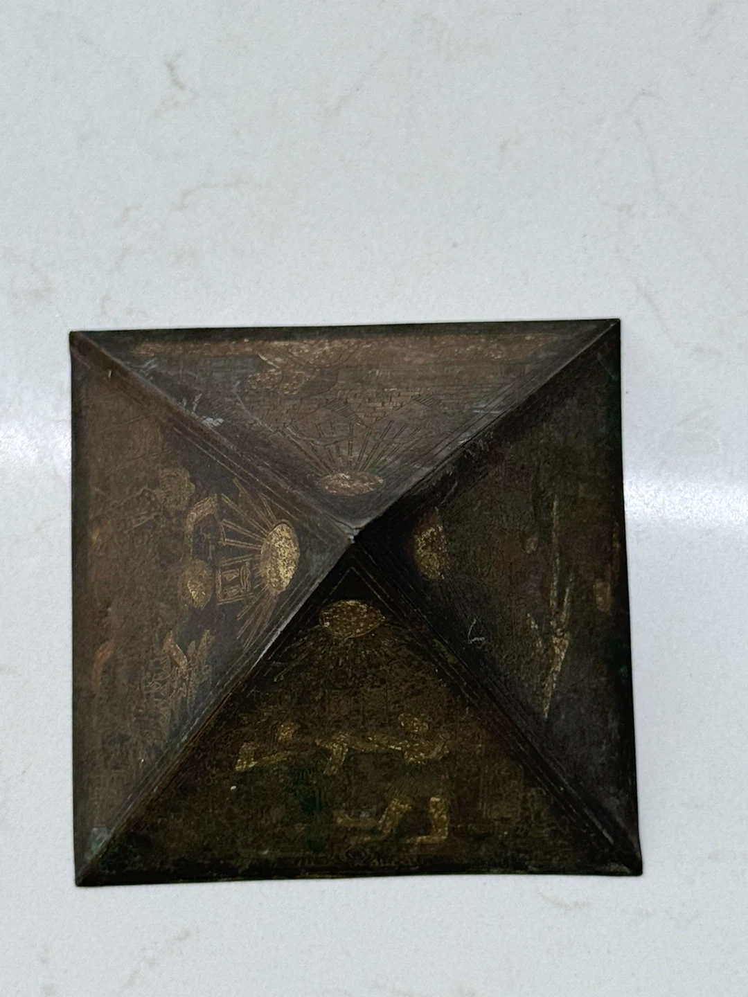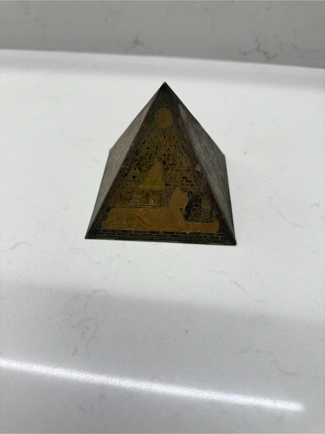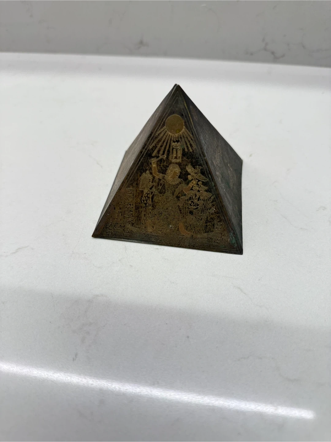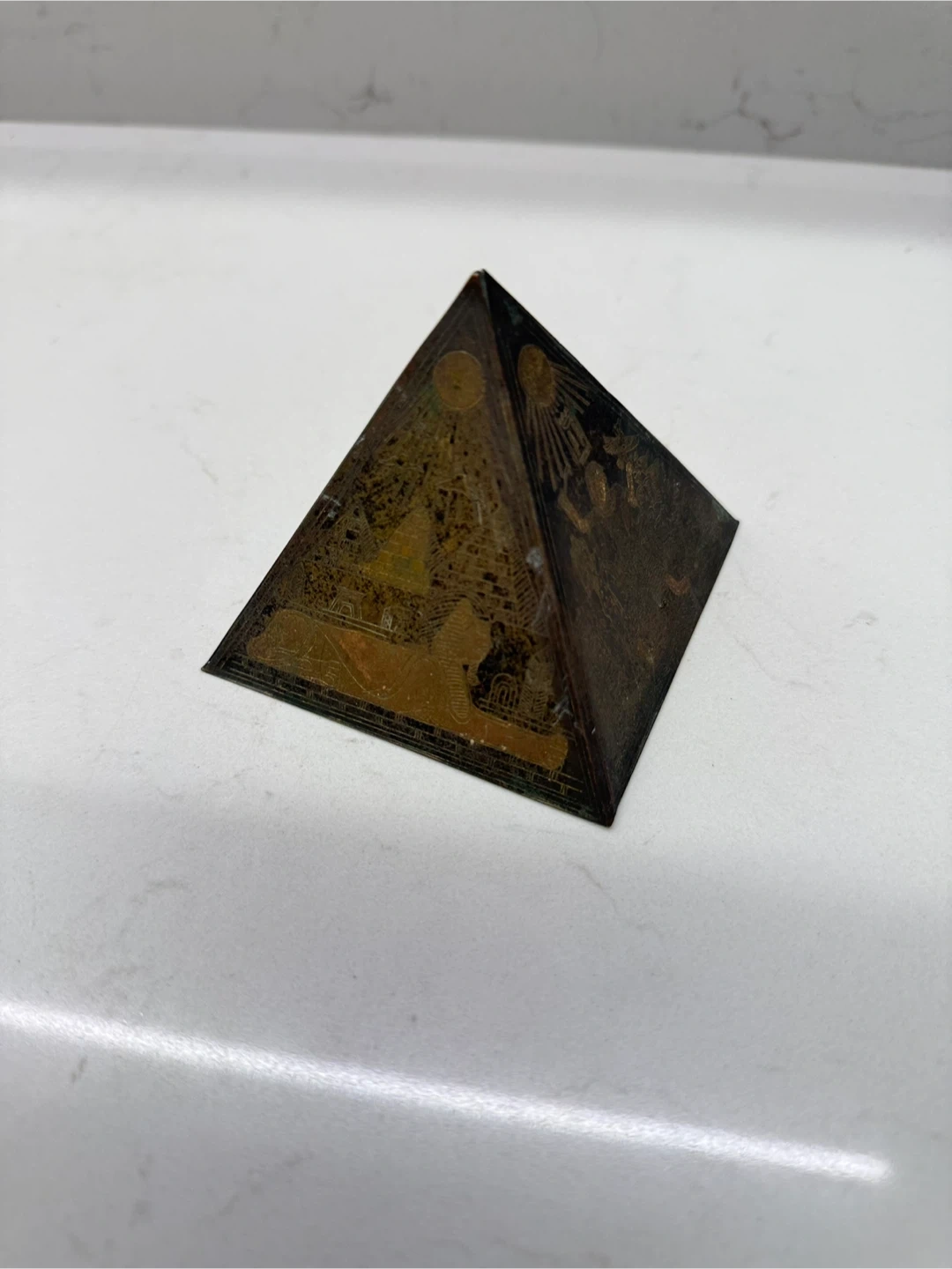 1000+Vintage brass Egyptian-themed pyramid decoration. It features detailed engravings of Egyptian figures and symbols on each side. Beautifully handcrafted piece. Iโm selling all my collectibles and gifts to find a new home! ๐