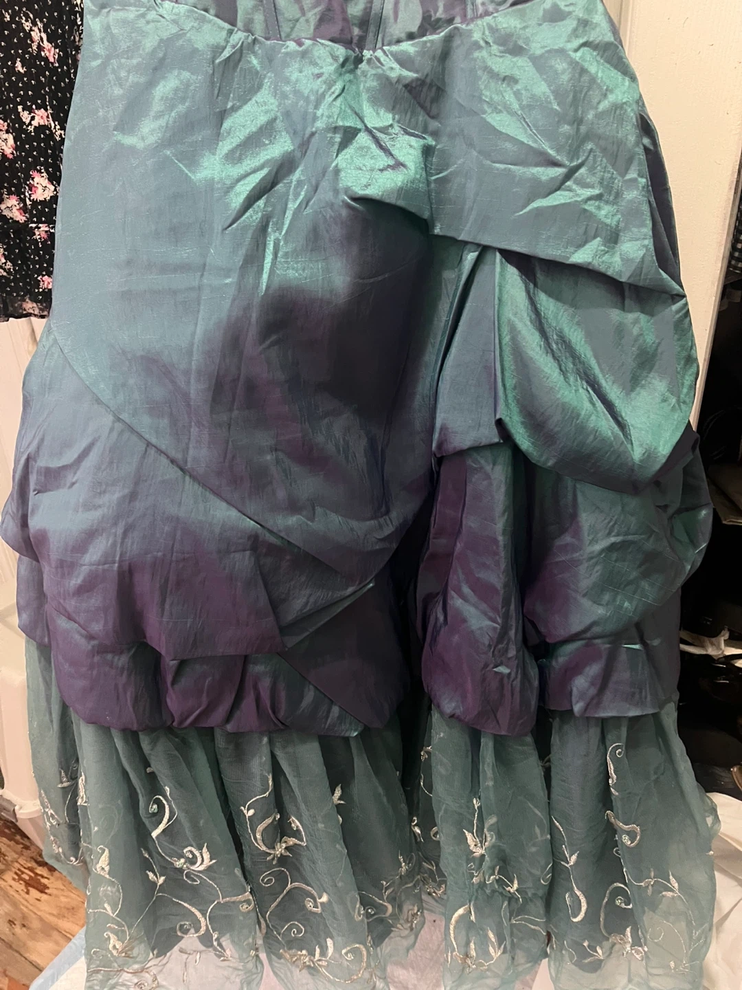 33Beautiful green and purple formal dress with intricate detailing on the bodice and skirt. The dress features a strapless design and layered ruffles, making it perfect for a special occasion. It's in great condition and ready to make someone's night! Size 12