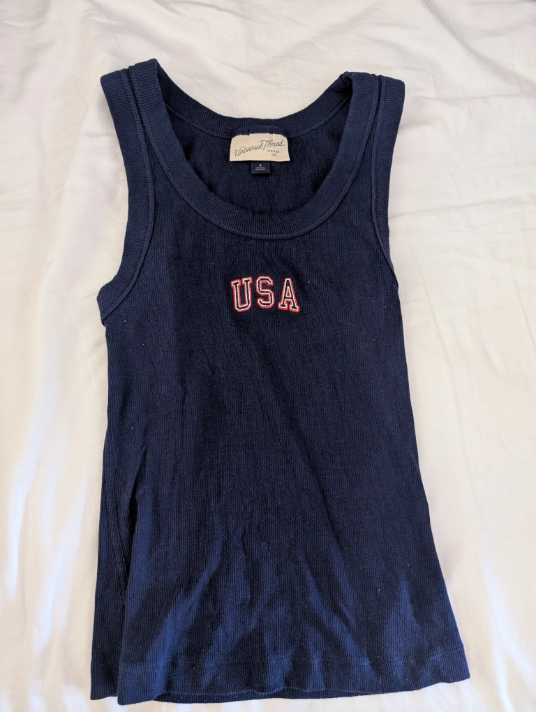 Selling a Universal Thread navy blue tank top with 'USA' embroidered on the front. It's a size small and made in Vietnam. Perfect for casual wear!