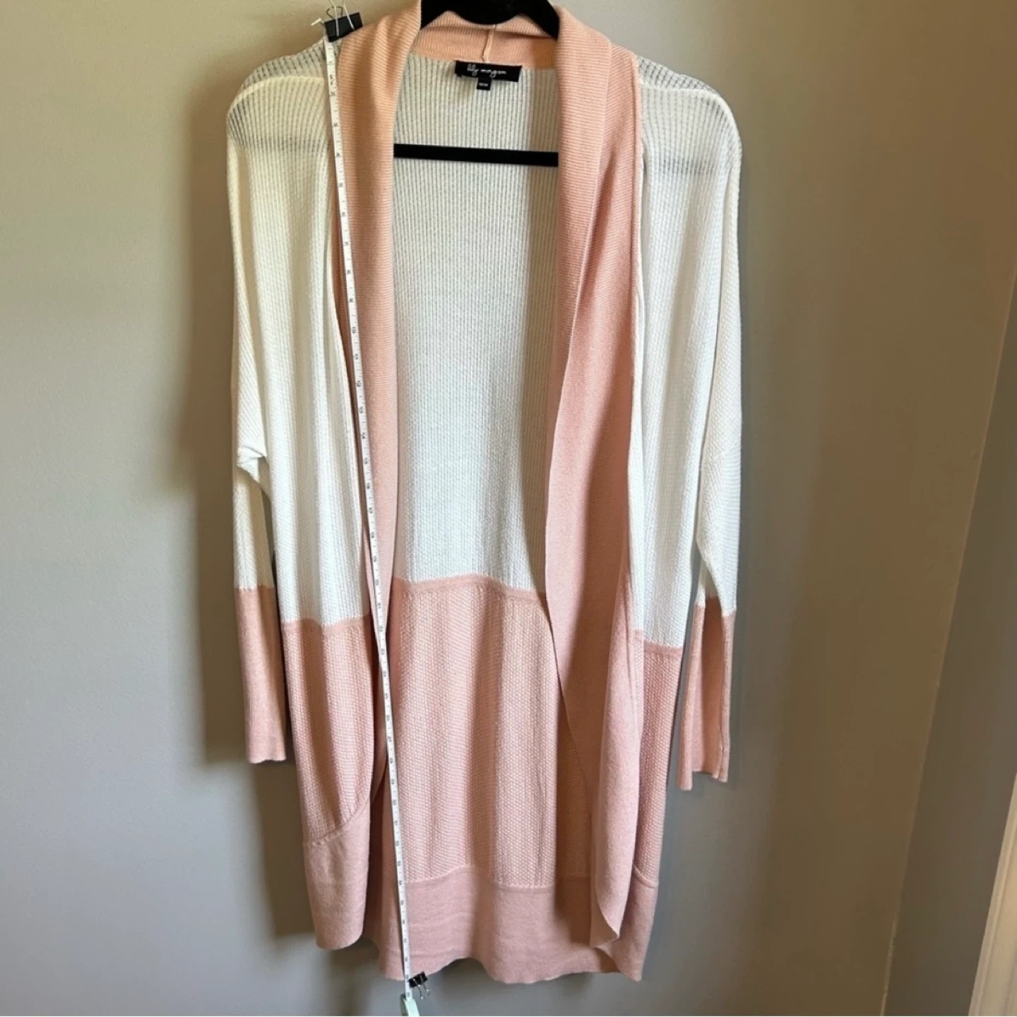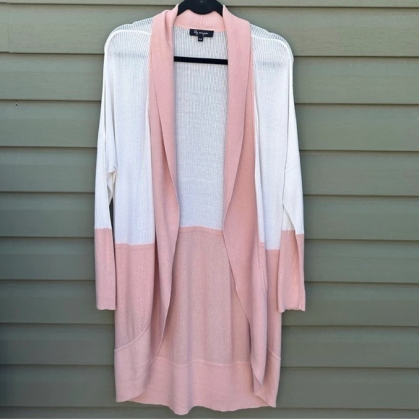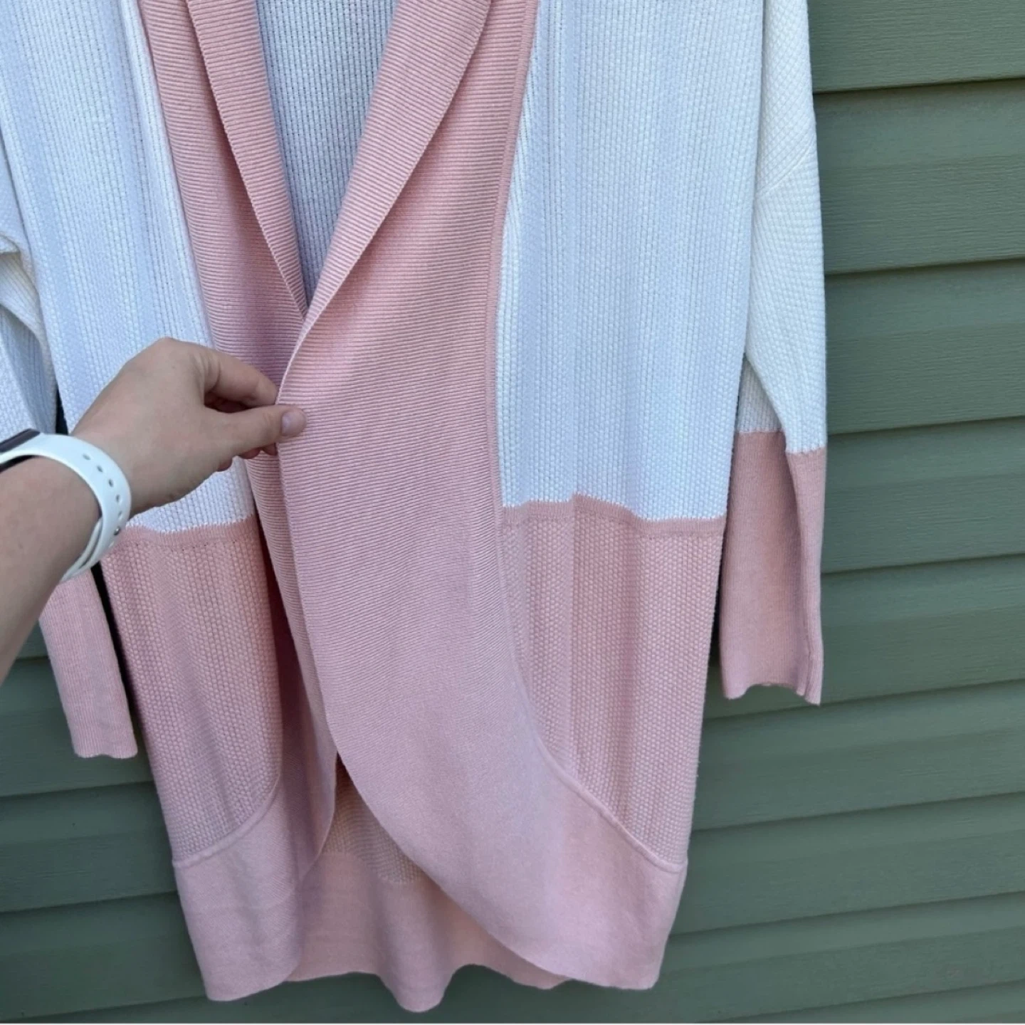 White and pink knit cardigan from Lily Morgan. White knit upper with pink ribbed bottom and sleeve cuffs. Longer midi length. Hardly worn. Women’s size M. See photos for measurements. Cross posted.