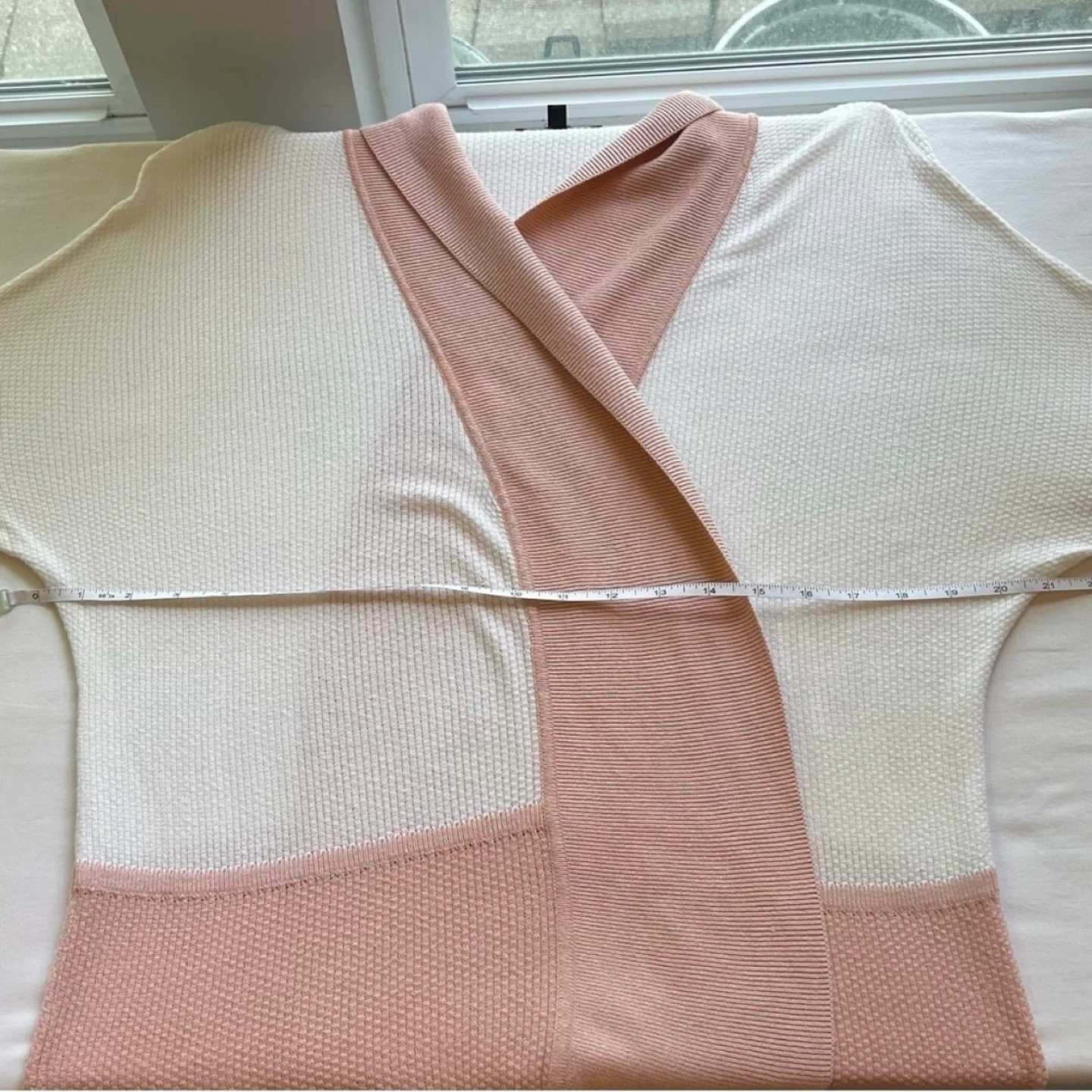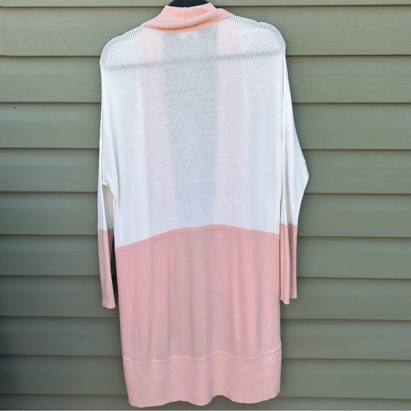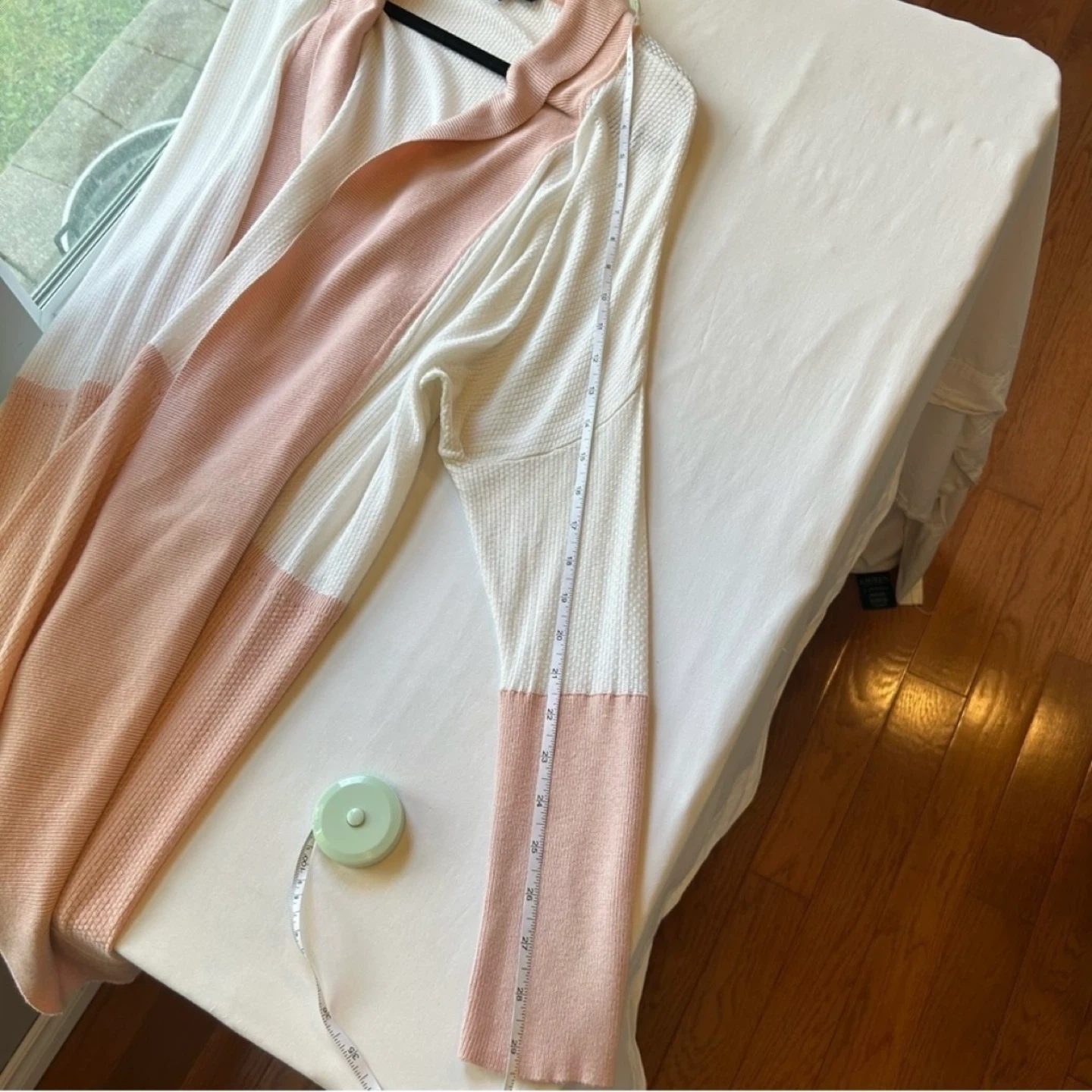 White and pink knit cardigan from Lily Morgan. White knit upper with pink ribbed bottom and sleeve cuffs. Longer midi length. Hardly worn. Women’s size M. See photos for measurements. Cross posted.