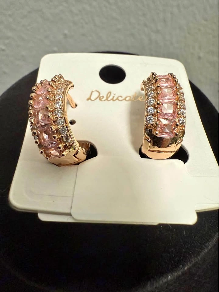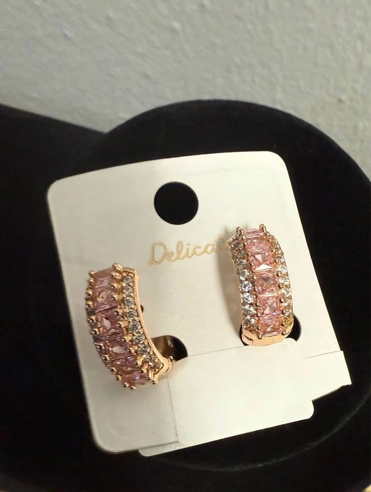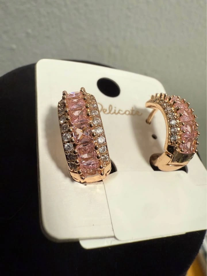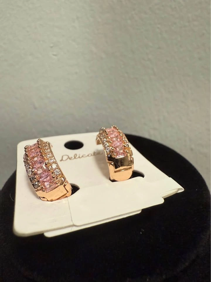 18K Gold fill rose gold Huggies with pink and white cubic zirconia stones. Great gift! Tarnish-proof and waterproof, you can rock it all day. Perfect for any occasion Safe For All Skin Types the product is hypoallergenic and nickel free, making it perfect for those with sensitive skin. Shipping available!