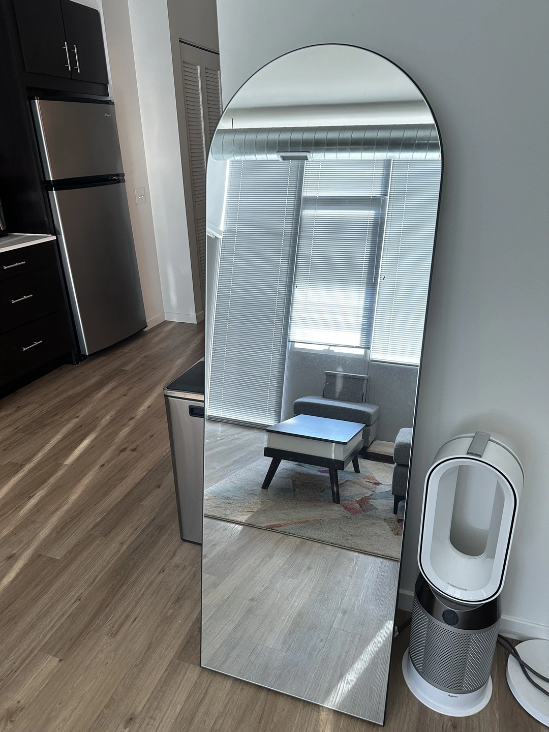 63Solid full length floor mirror with a thin black frame. Can stand with a bracket, lean against the wall, or be hung up. Size: 65" tall x 22" wide. Great for bedroom, living room, or entryway. Condition: Gently used, less than 2 years old Original Price: $136. Asking Price: $90 OBO Pickup: Local pickup only in Lake View East / Wrigleyville. The mirror is solid and heavy, recommended for two people or a strong person to move safely. Payment: Cash or Venmo