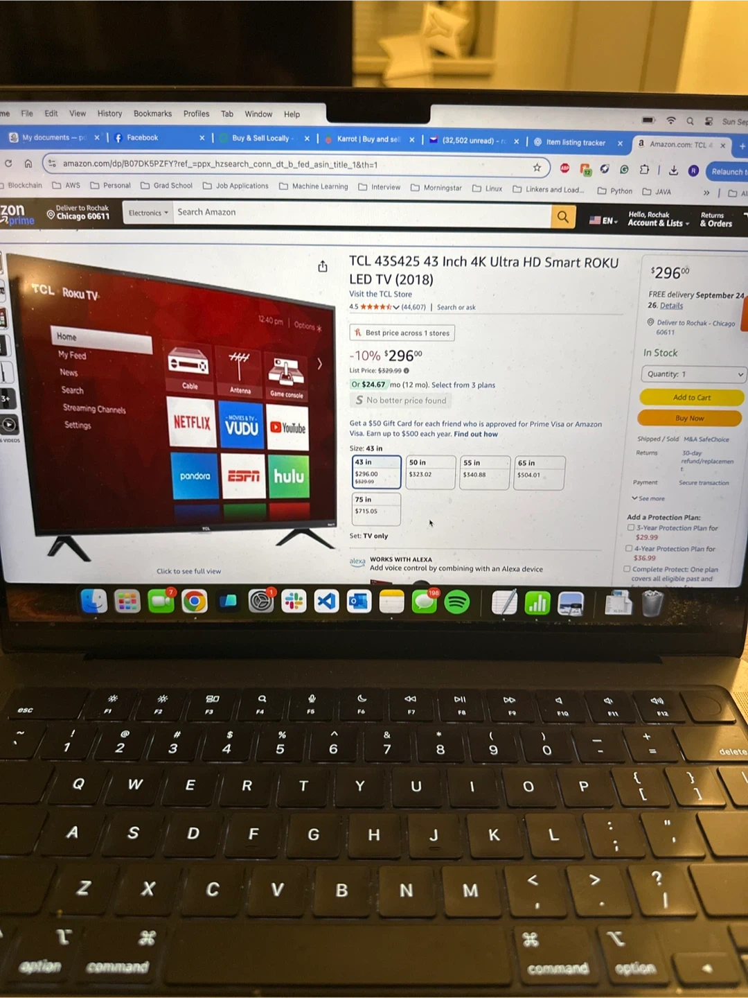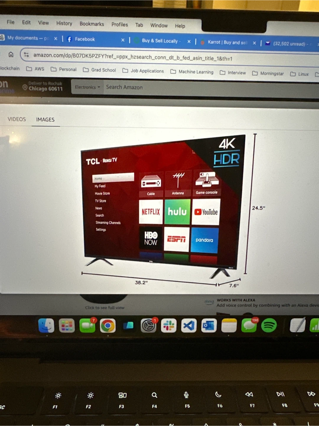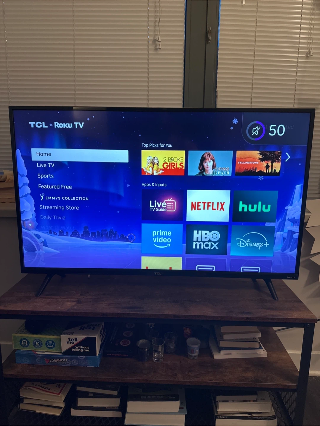Selling a TCL 43-inch 4K Ultra HD Roku LED TV, model 43S425. This TV delivers stunning picture quality with vibrant colors and sharp details. Enjoy easy access to your favorite streaming services like Netflix, Hulu, and more with the Roku platform built right in. The dimensions are 38.2" x 24.5" x 7.6".