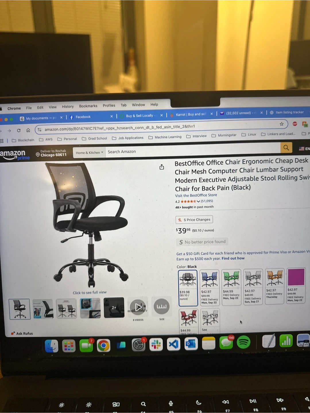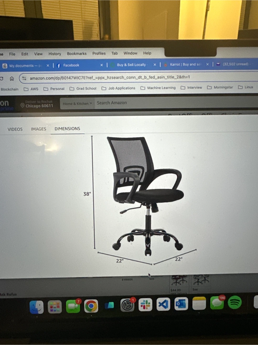Selling a BestOffice ergonomic mesh office chair in black. This chair offers lumbar support and has a modern executive adjustable stool design. It's great for back pain! Dimensions are 38" height and 22" width.