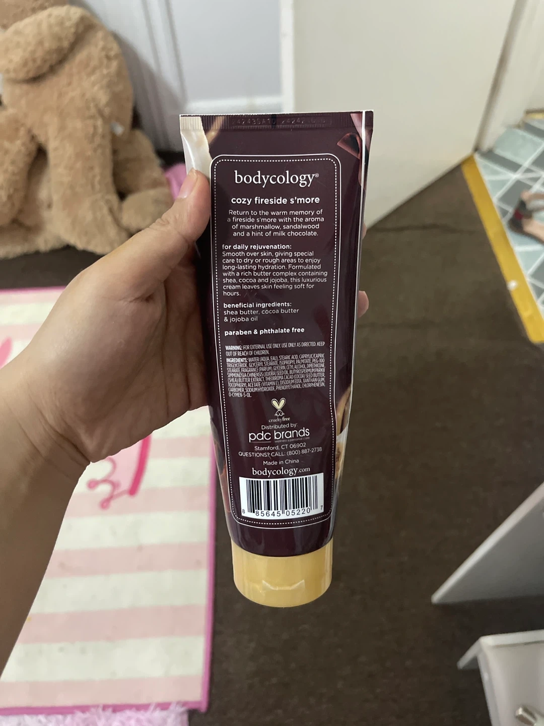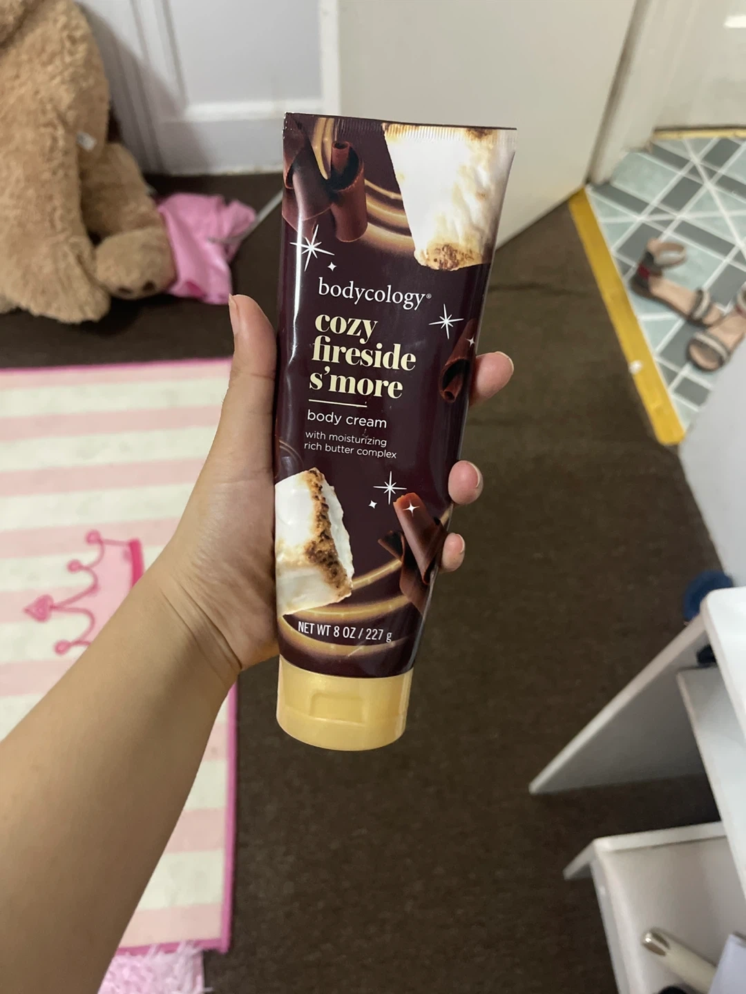 90Selling a Bodycology Cozy Fireside S'more body cream! It's a body cream with moisturizing rich butter complex. It has the aroma of toasted marshmallow, and a hint of milk chocolate. Net WT 8 oz / 227 g