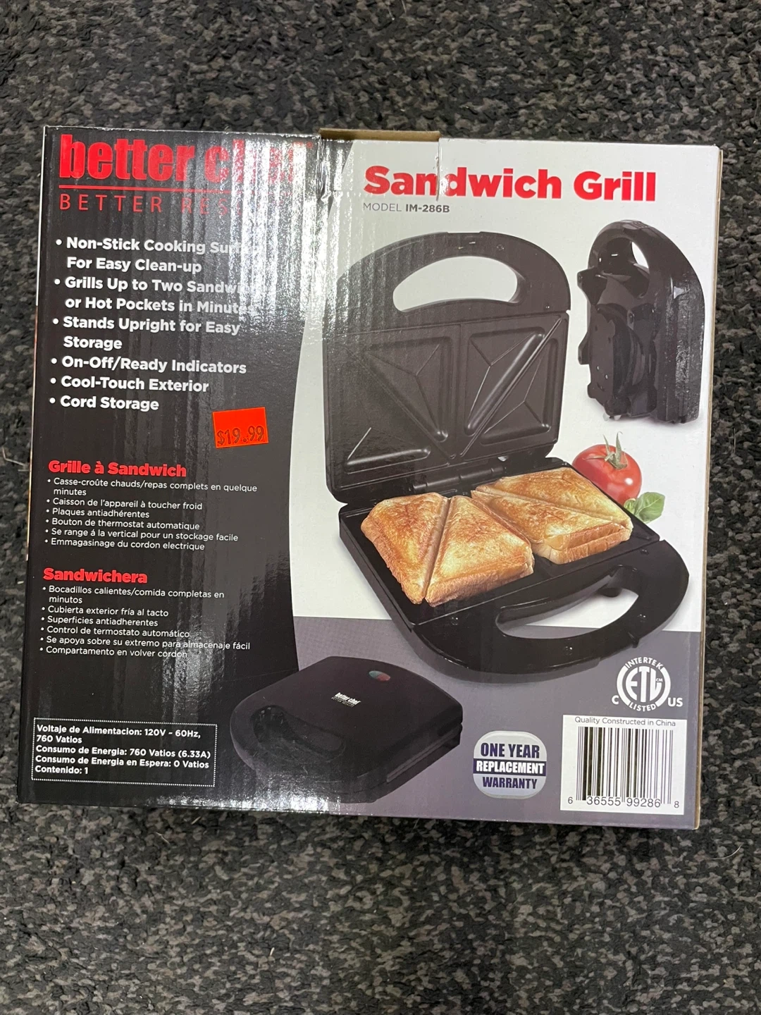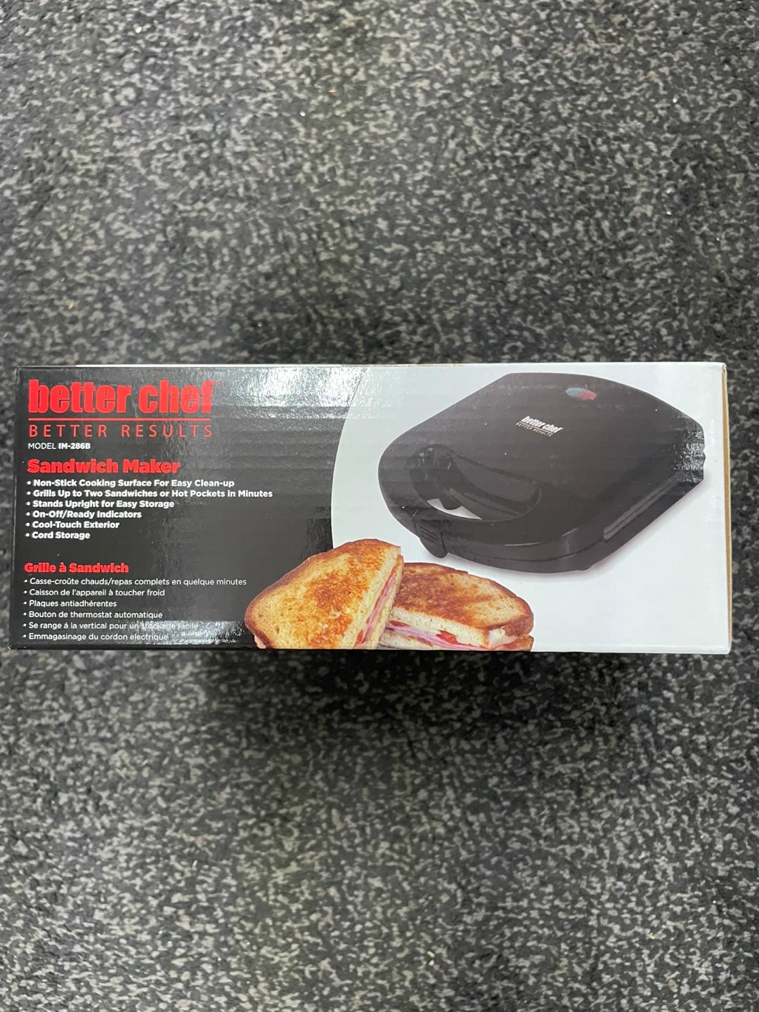 Brand new box pack ! I'm selling a Better Chef Sandwich Grill, model IM-286B! This grill has a non-stick cooking surface for easy clean-up. It grills up to two sandwiches or hot pockets in minutes and stands upright for easy storage. It also has on/off ready indicators, a cool-touch exterior, and cord storage. The box is included!