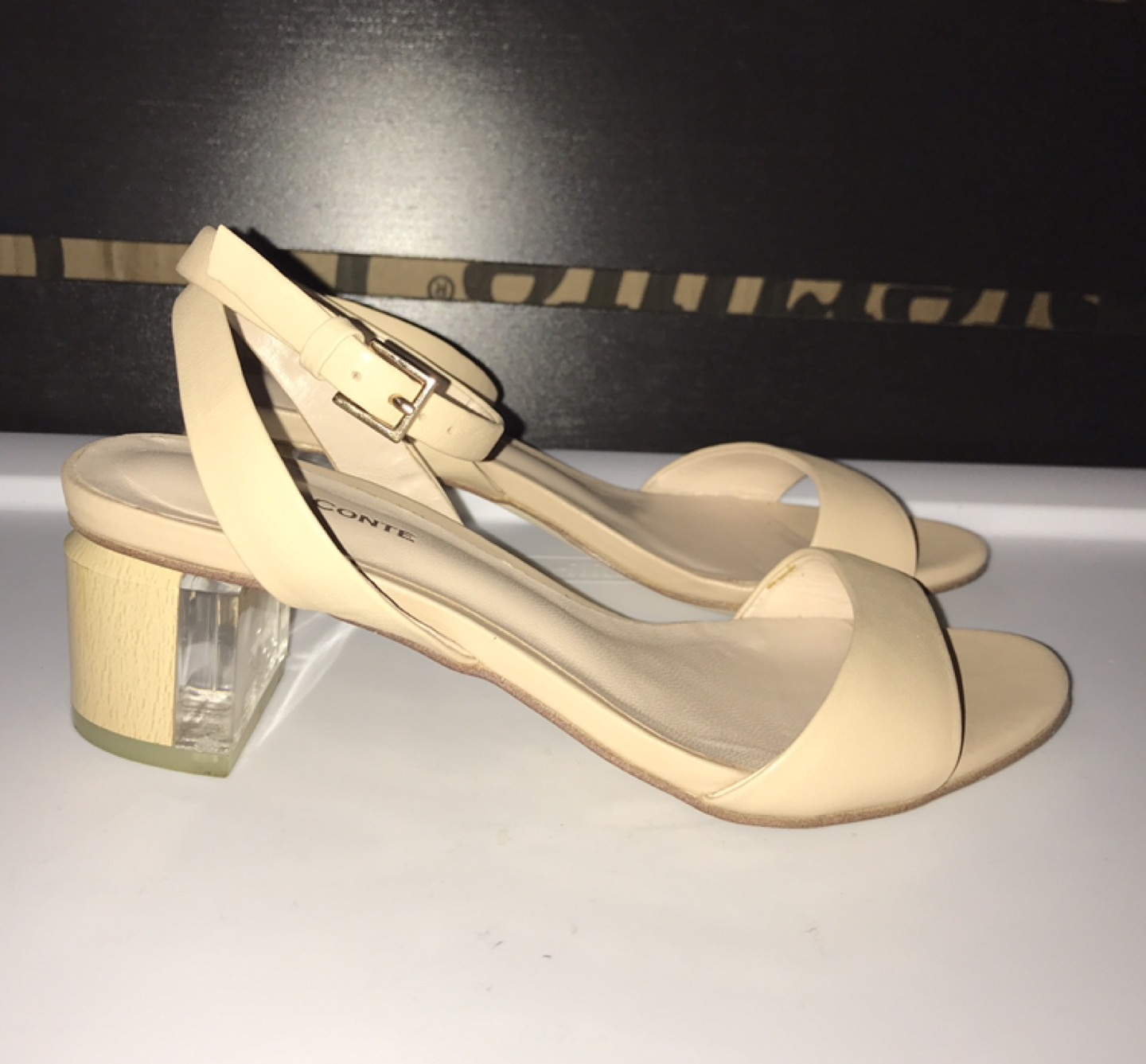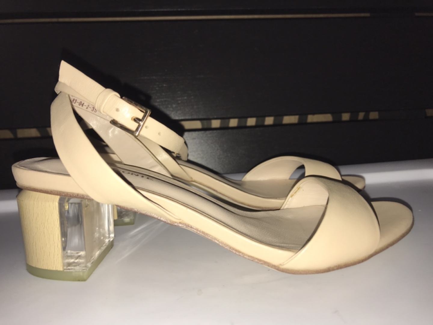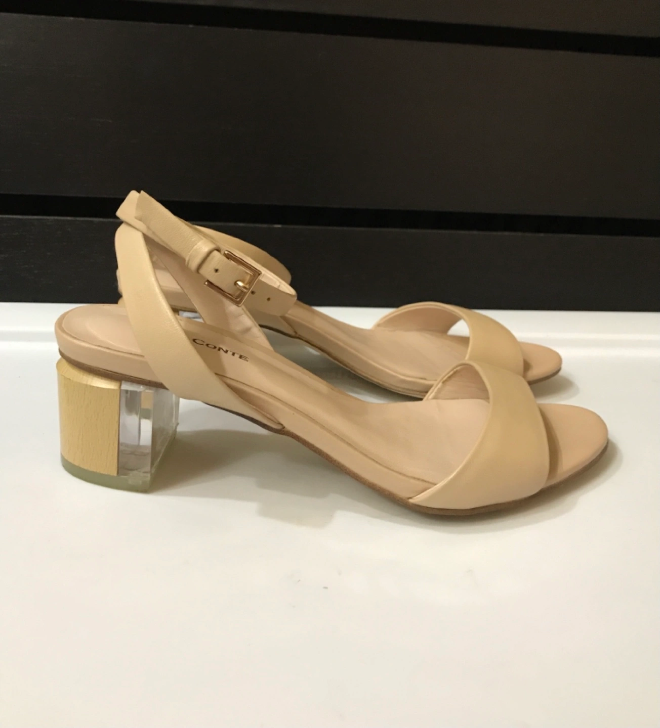 Almost new, very comfortable. Wooden heel with clear plastic insertion. Adjustable strap
