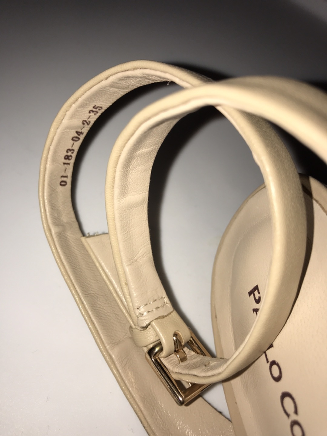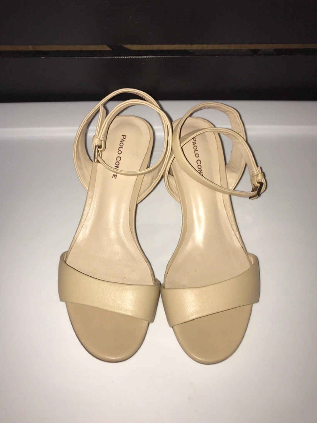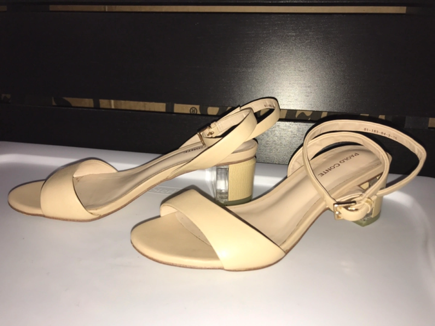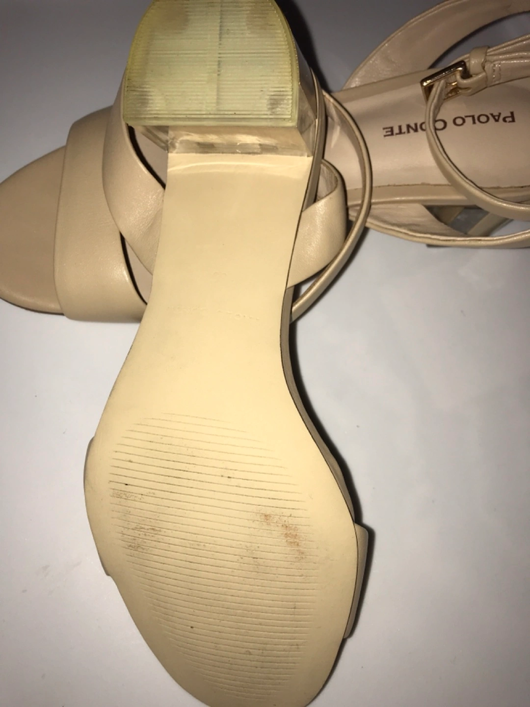 Almost new, very comfortable. Wooden heel with clear plastic insertion. Adjustable strap