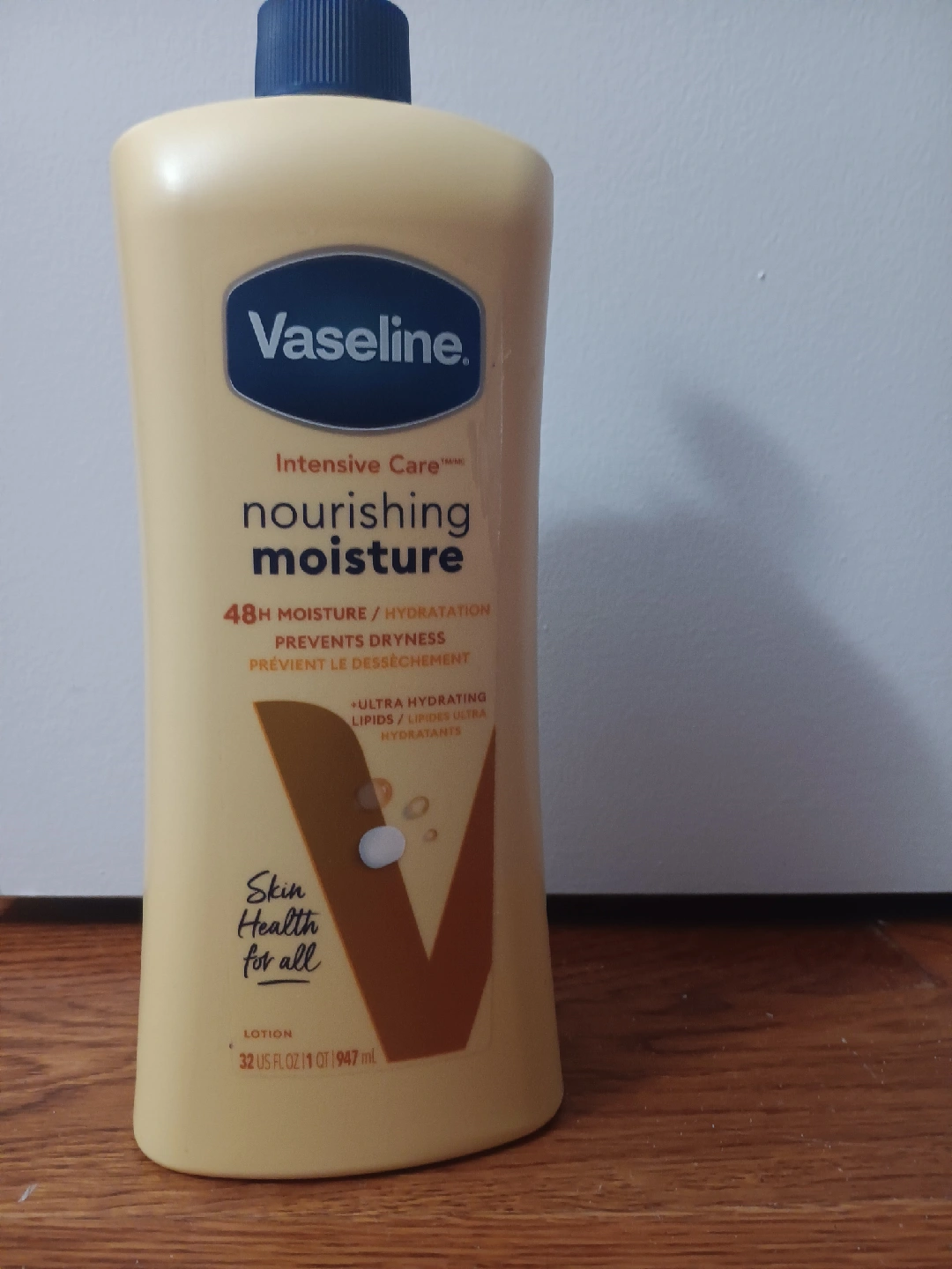 754Selling a bottle of Vaseline Intensive Care Nourishing Moisture lotion. It's a 32 fl oz (1 qt / 947 ml) bottle. This lotion provides 48H moisture and helps prevent dryness. It also contains ultra hydrating lipids.