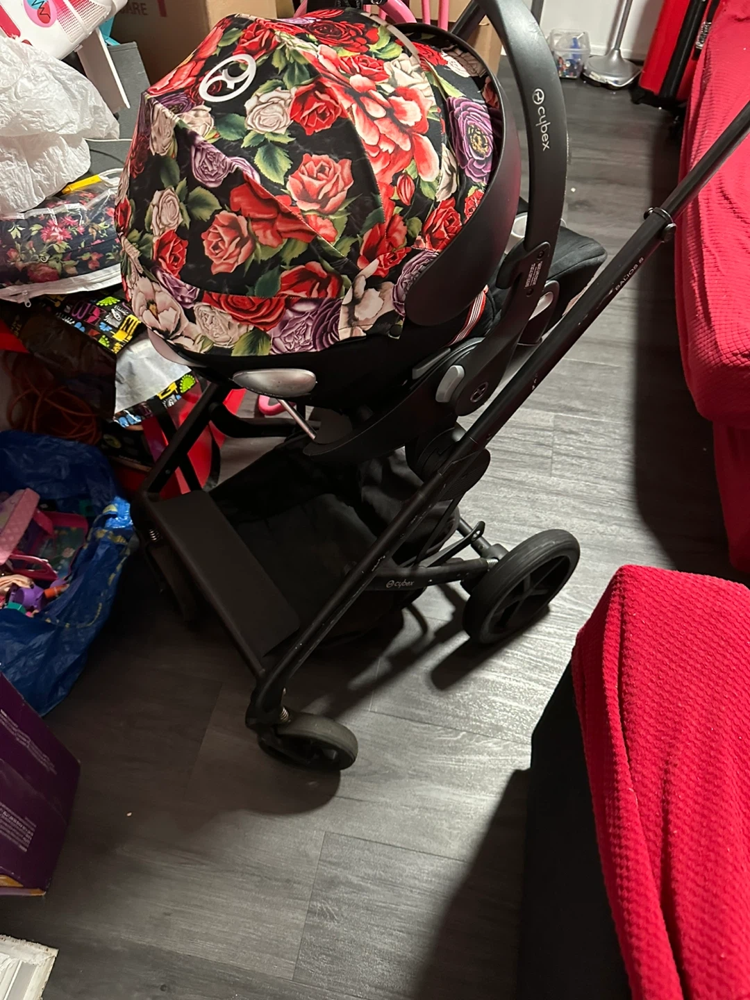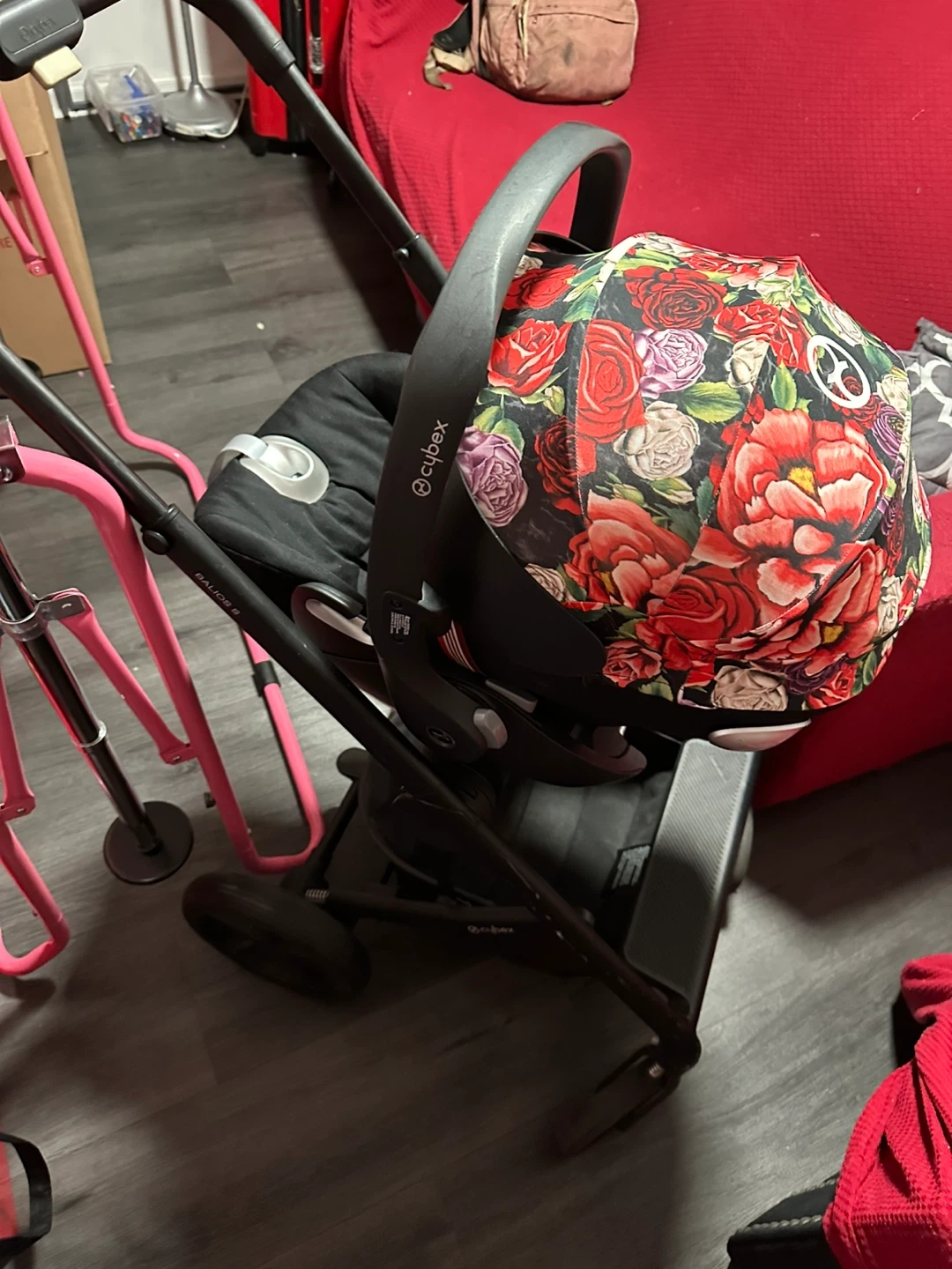 Selling a Cybex Balios S stroller with an infant car seat. The stroller is black and the infant car seat has a floral patterned canopy. Great for getting around with your little one!