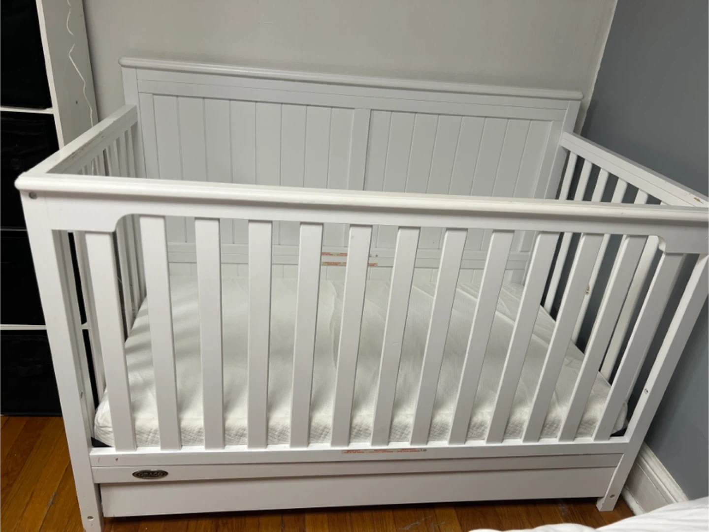 Selling a white Graco baby crib. It's in good condition and ready for a new home. Perfect for your little one's nursery!