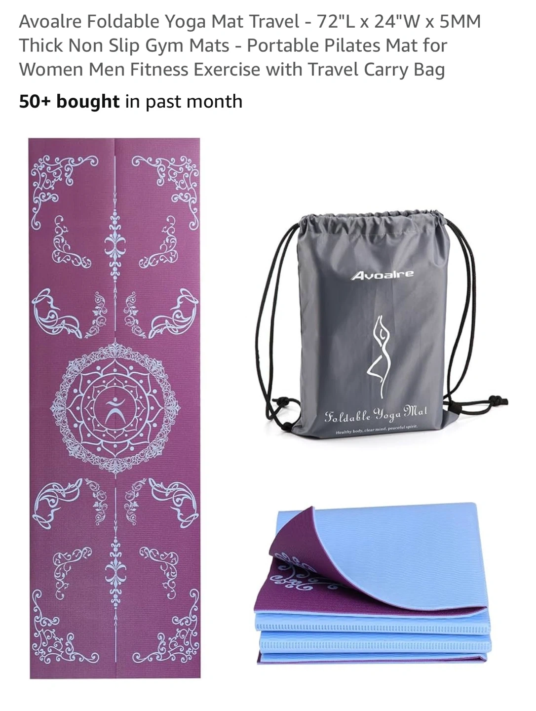 Selling an Avoalre Foldable Yoga Mat! It measures 72"L x 24"W x 5MM. This thick, non-slip gym mat is perfect as a portable pilates and yoga mat for women and men's fitness exercises. It also comes with a travel carry bag! Only used twice, selling because I got a new one.