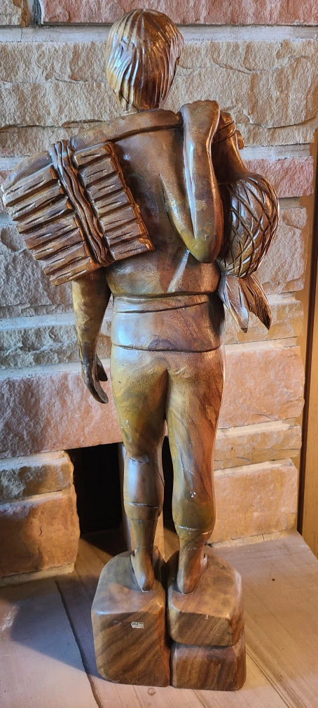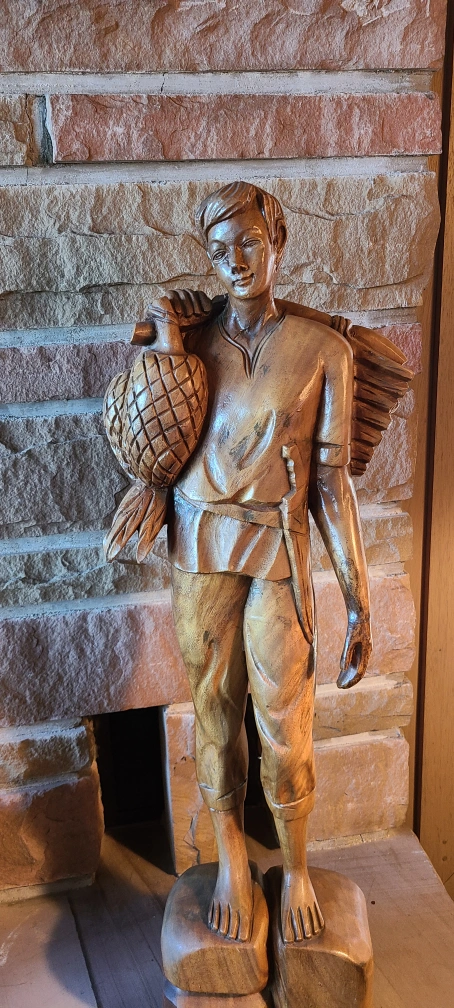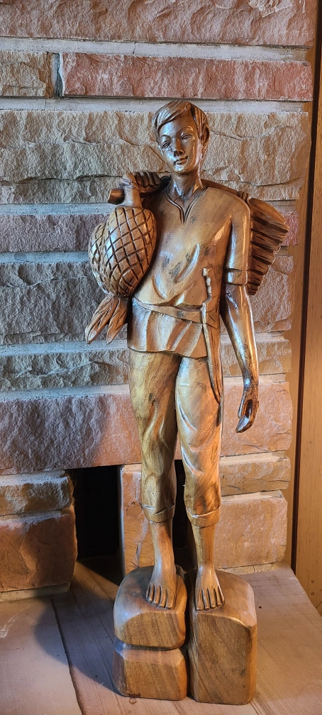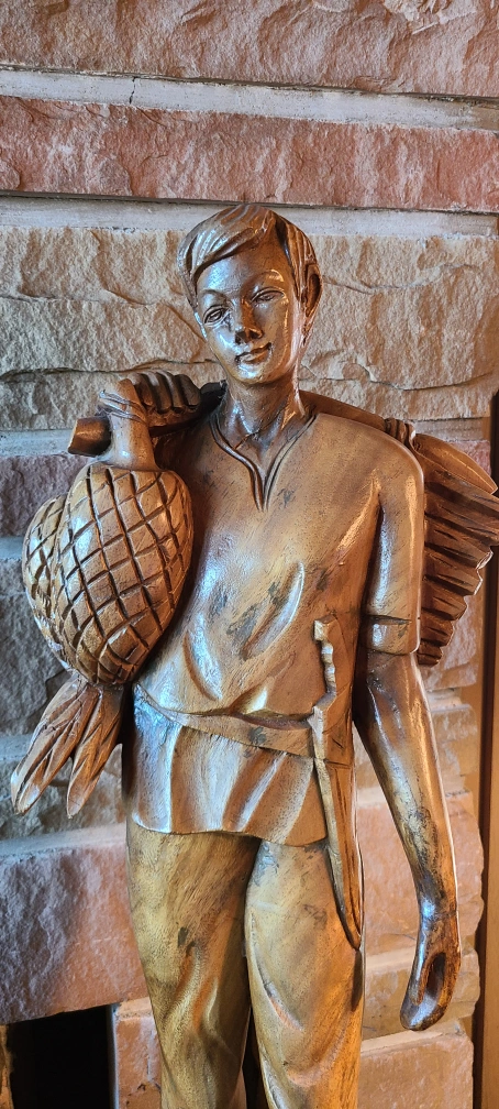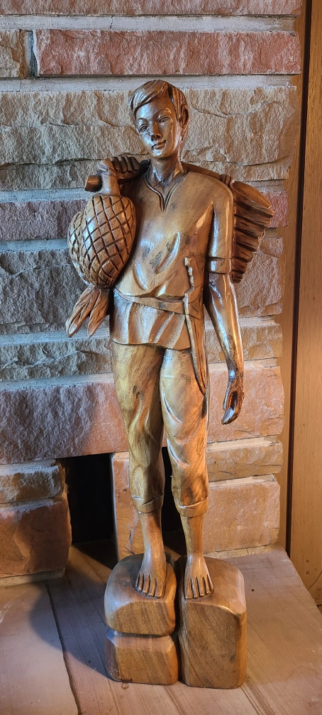 Here's a wooden statue of a boy carrying pineapples. ! It's a unique piece that would look great in any home