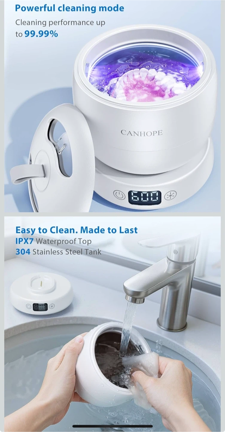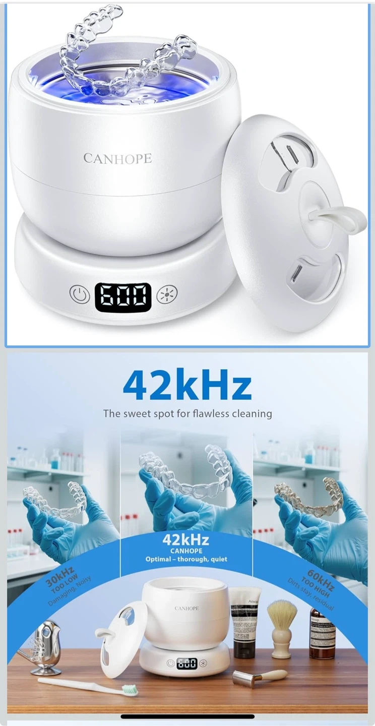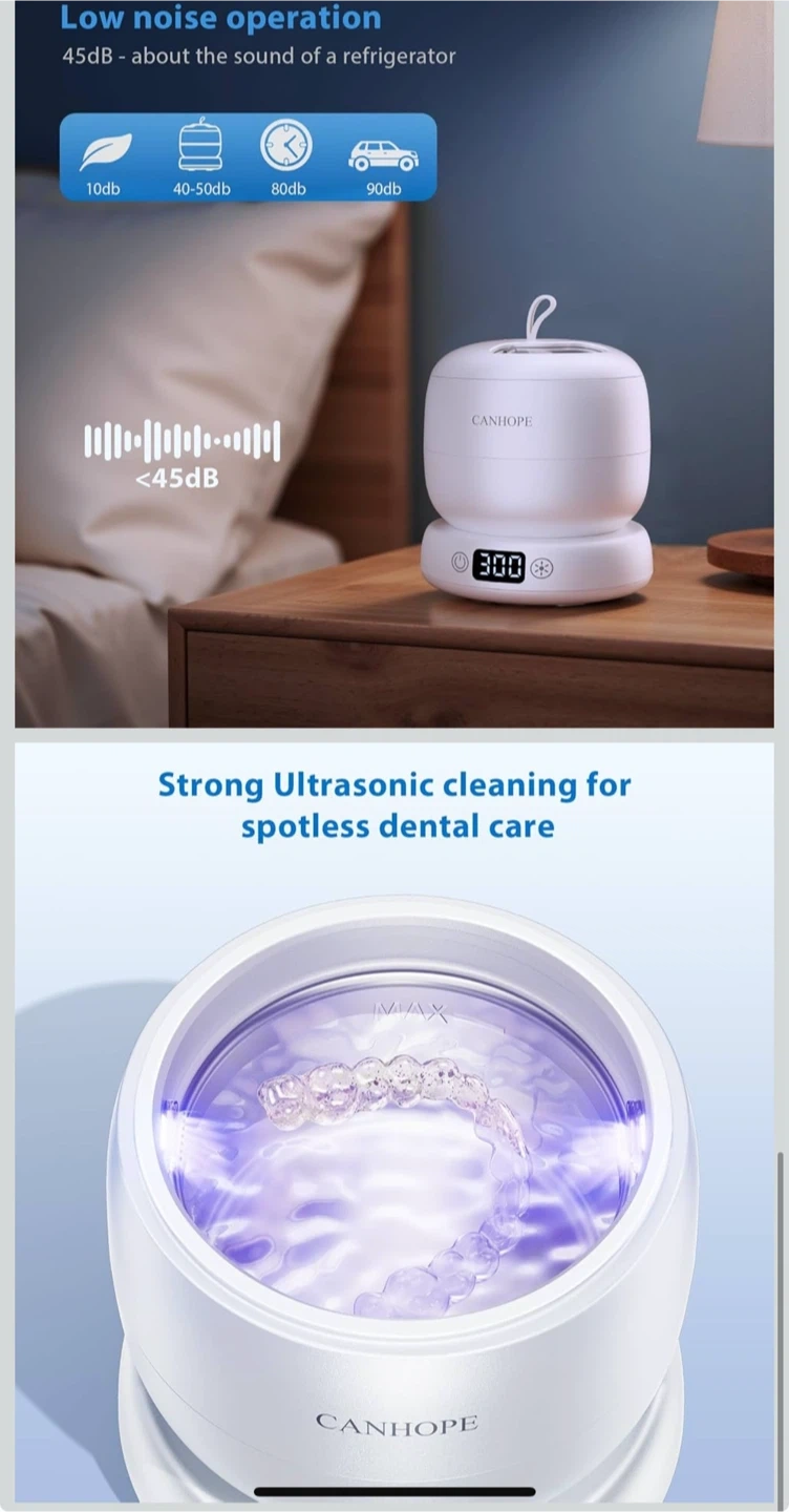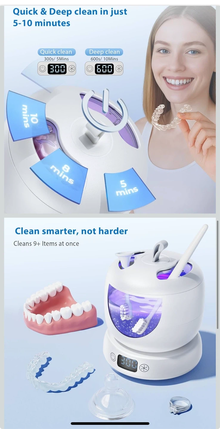 Ultrasonic Retainer Cleaner Machine, 42kHz Professional for Dentures, Aligners, Mouth Guards, Jewelry - IPX7 Waterproof Durable Removable Base and Top Cover, 3 Timer Settings, Quiet White
