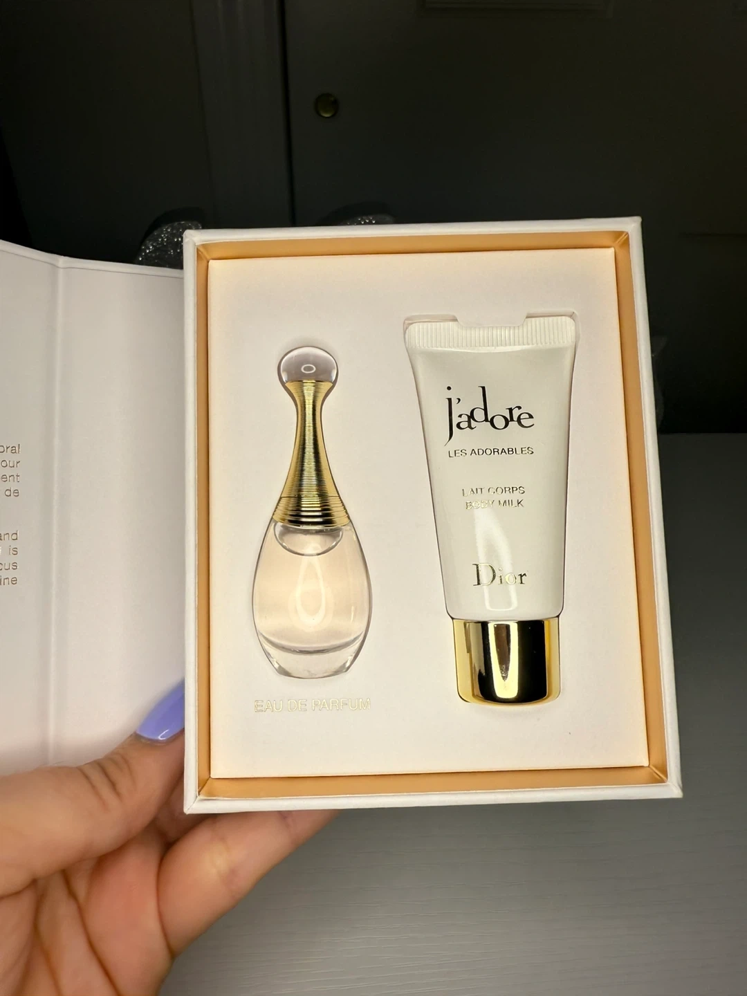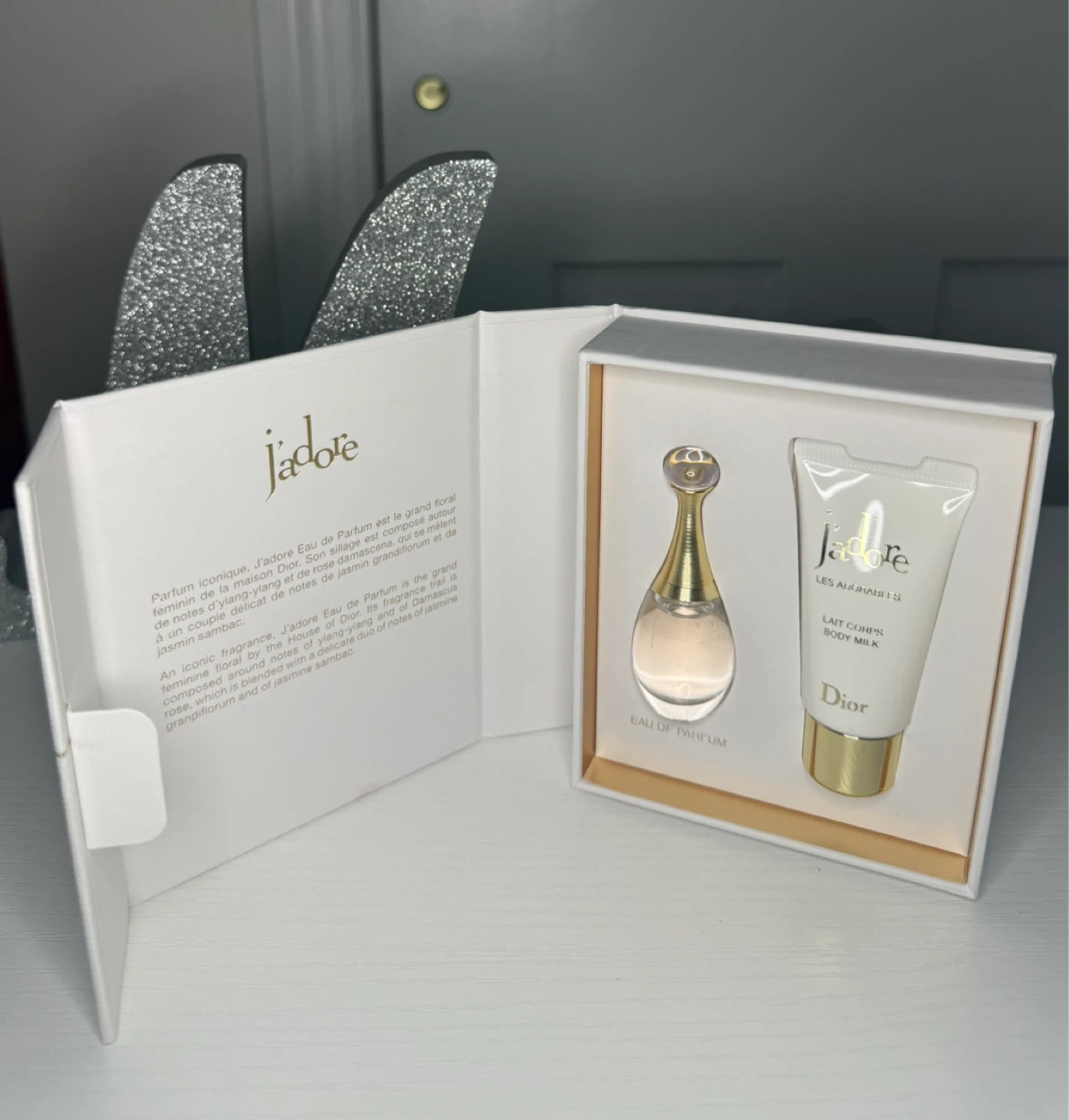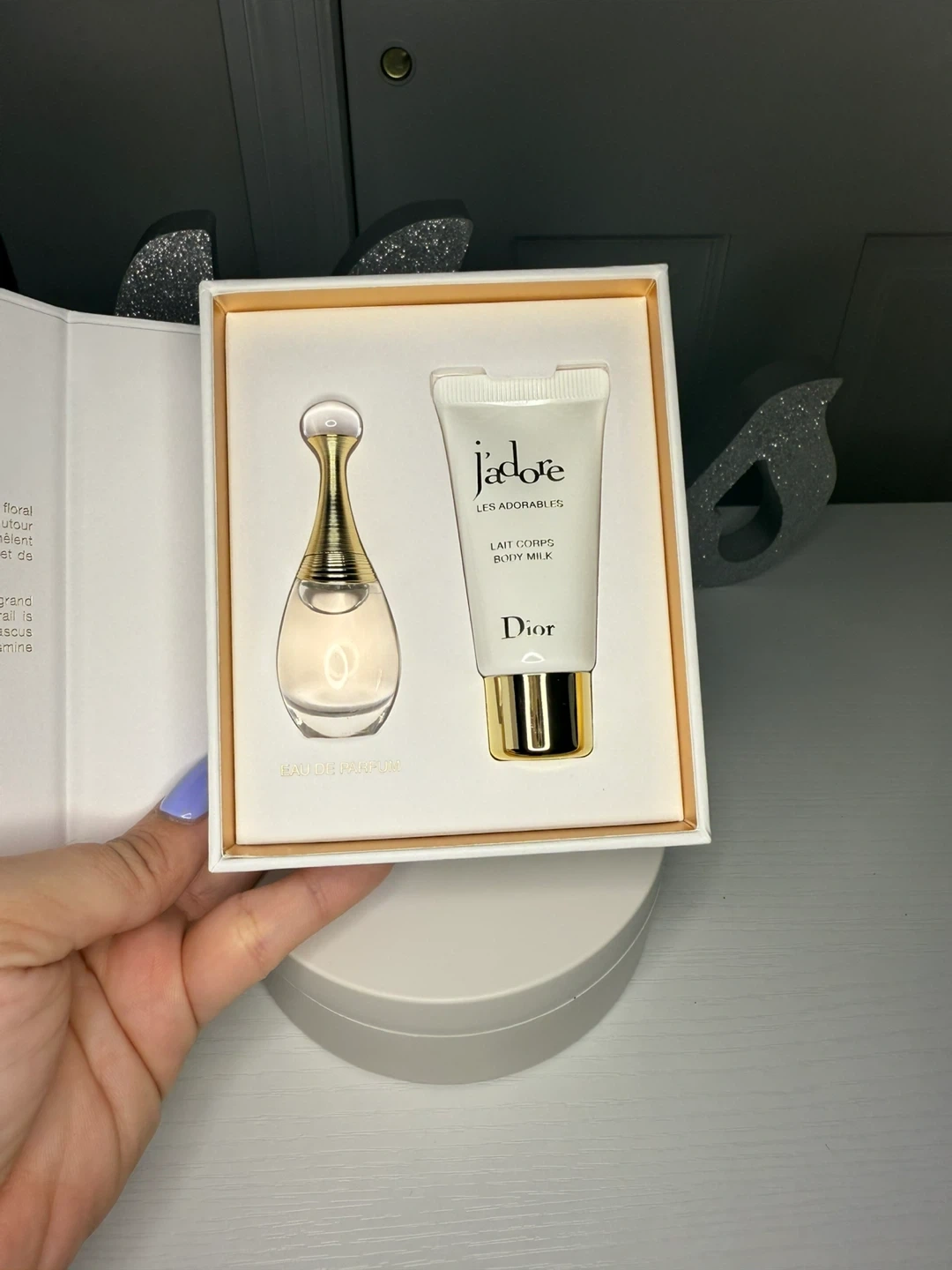 82Luxurious Dior J'adore set. Includes elegant fragrance and body milk. Features gold and white design. 5ml mini perfume 20ml body milk Free Pick up Manhattan near Bryant Park on Weekday except Friday Brooklyn near Bayparkway anytime pick up shipping to around US - $5 to $7