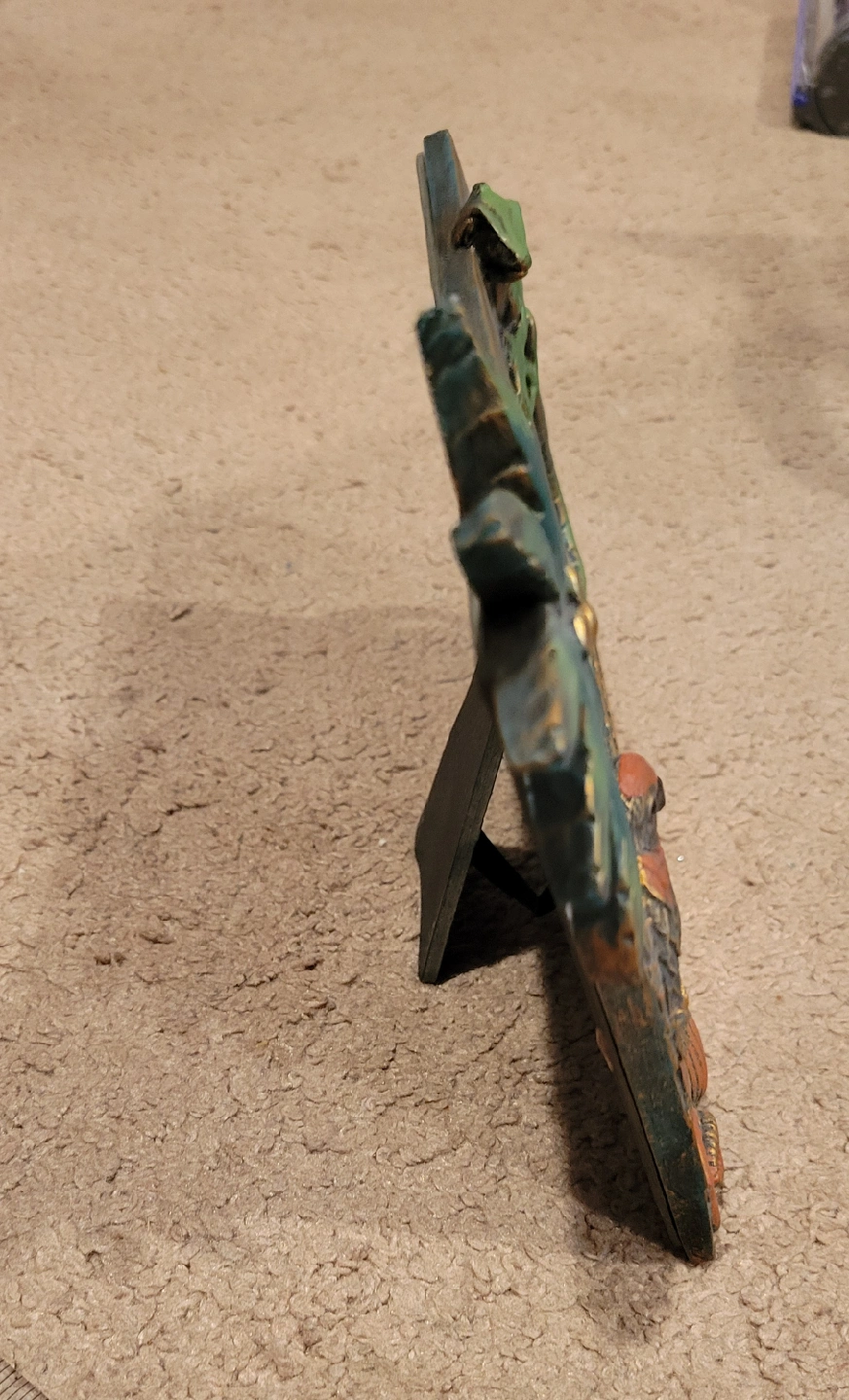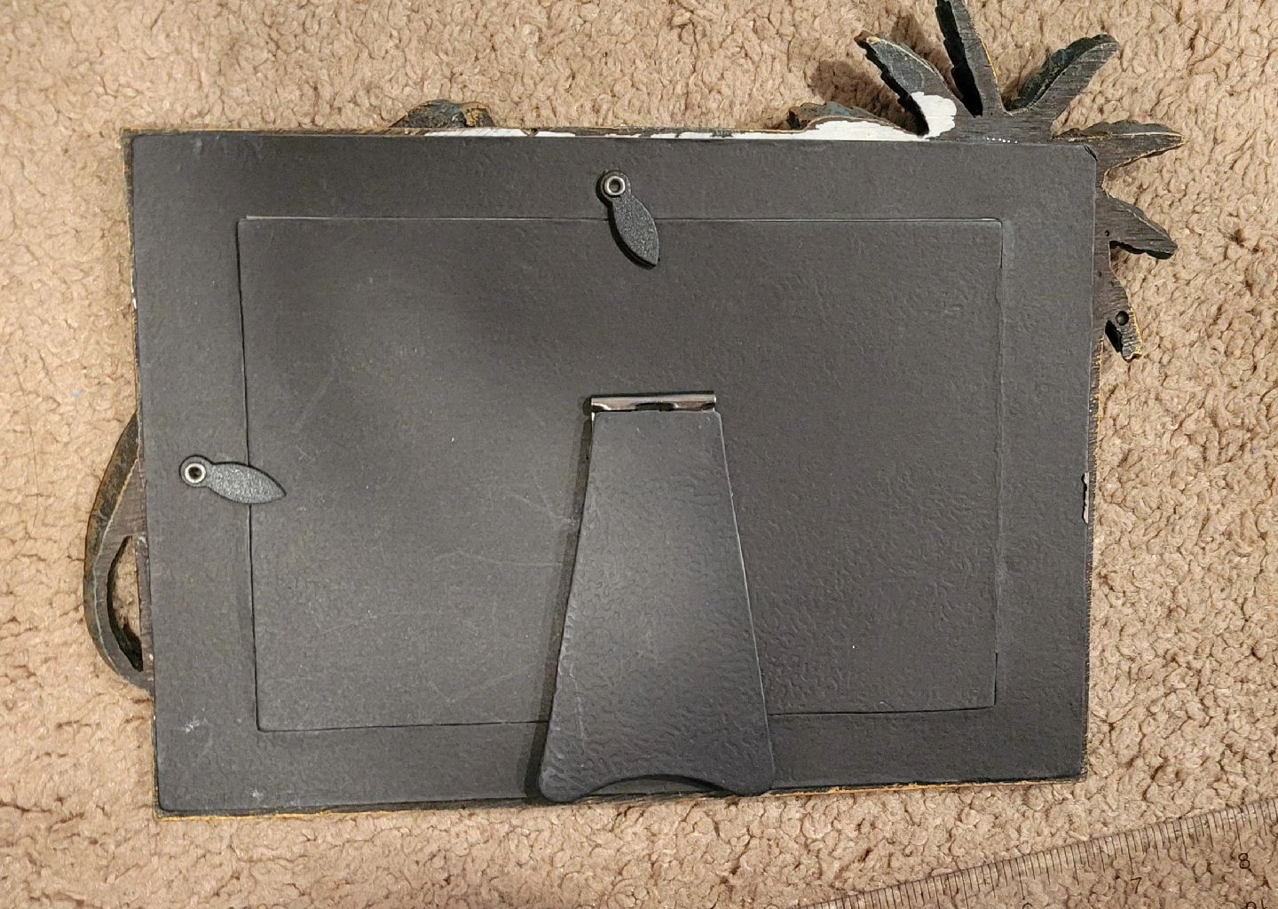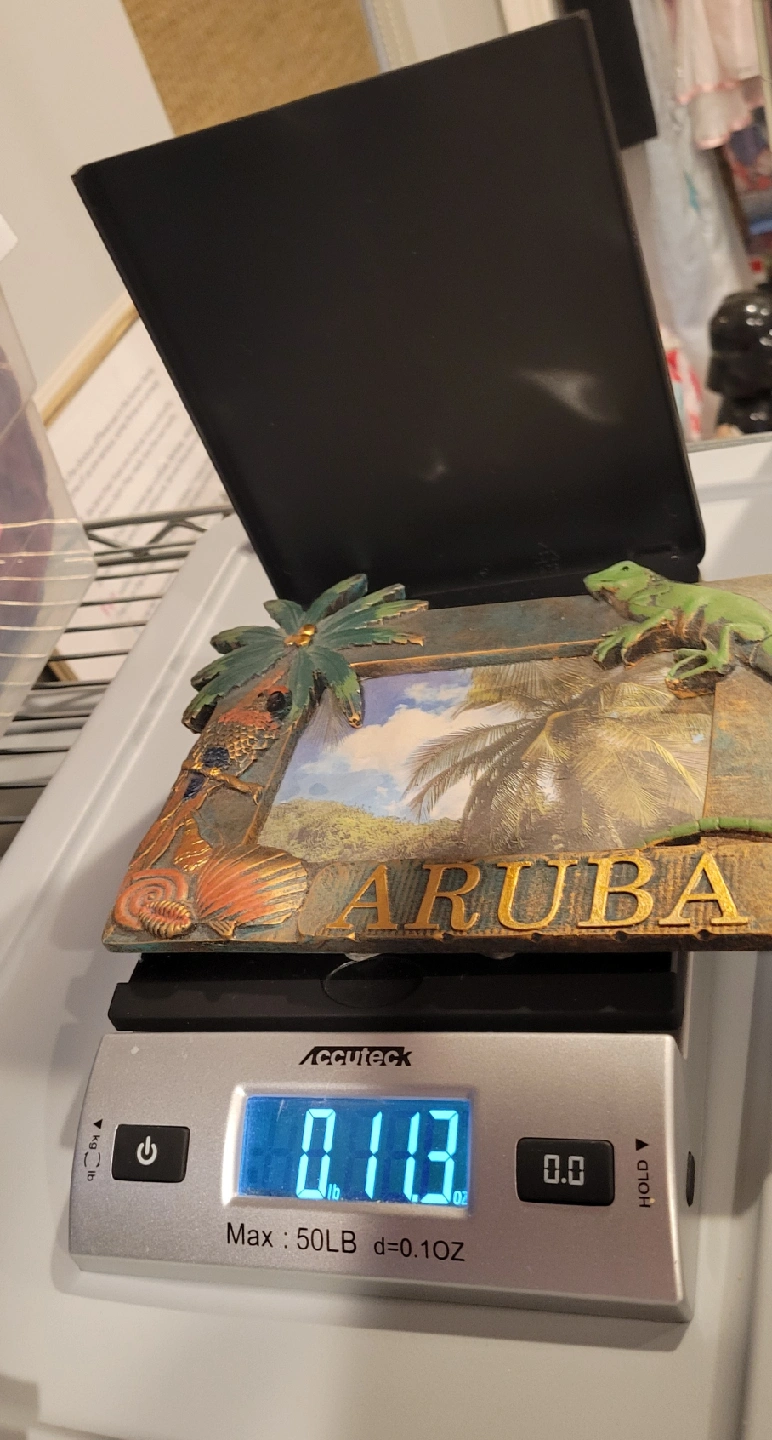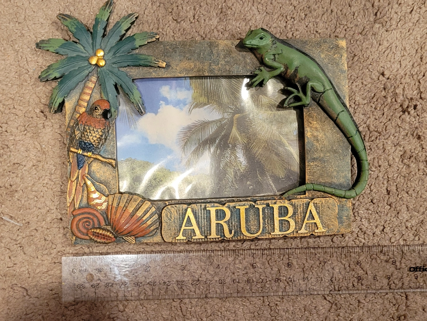 78Selling a unique Aruba themed picture frame! It features a palm tree, parrot, seashells, and an iguana.