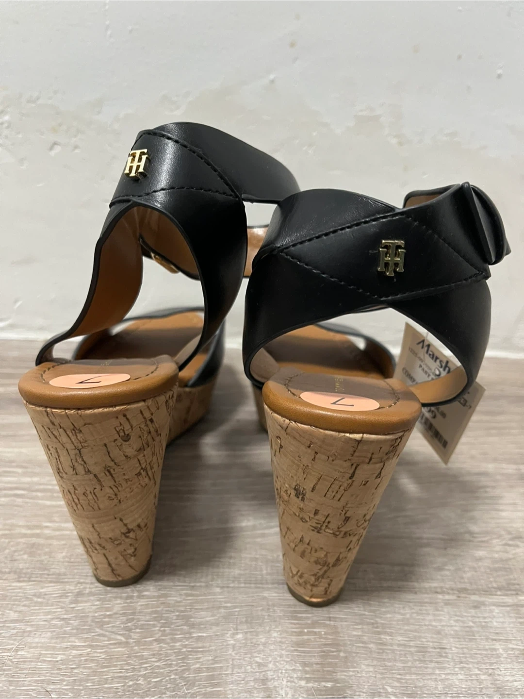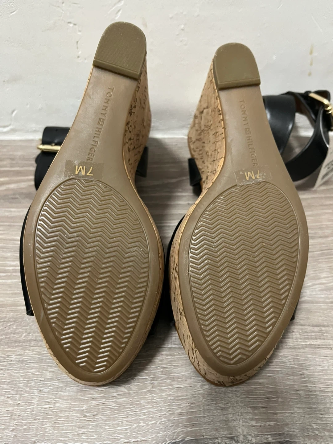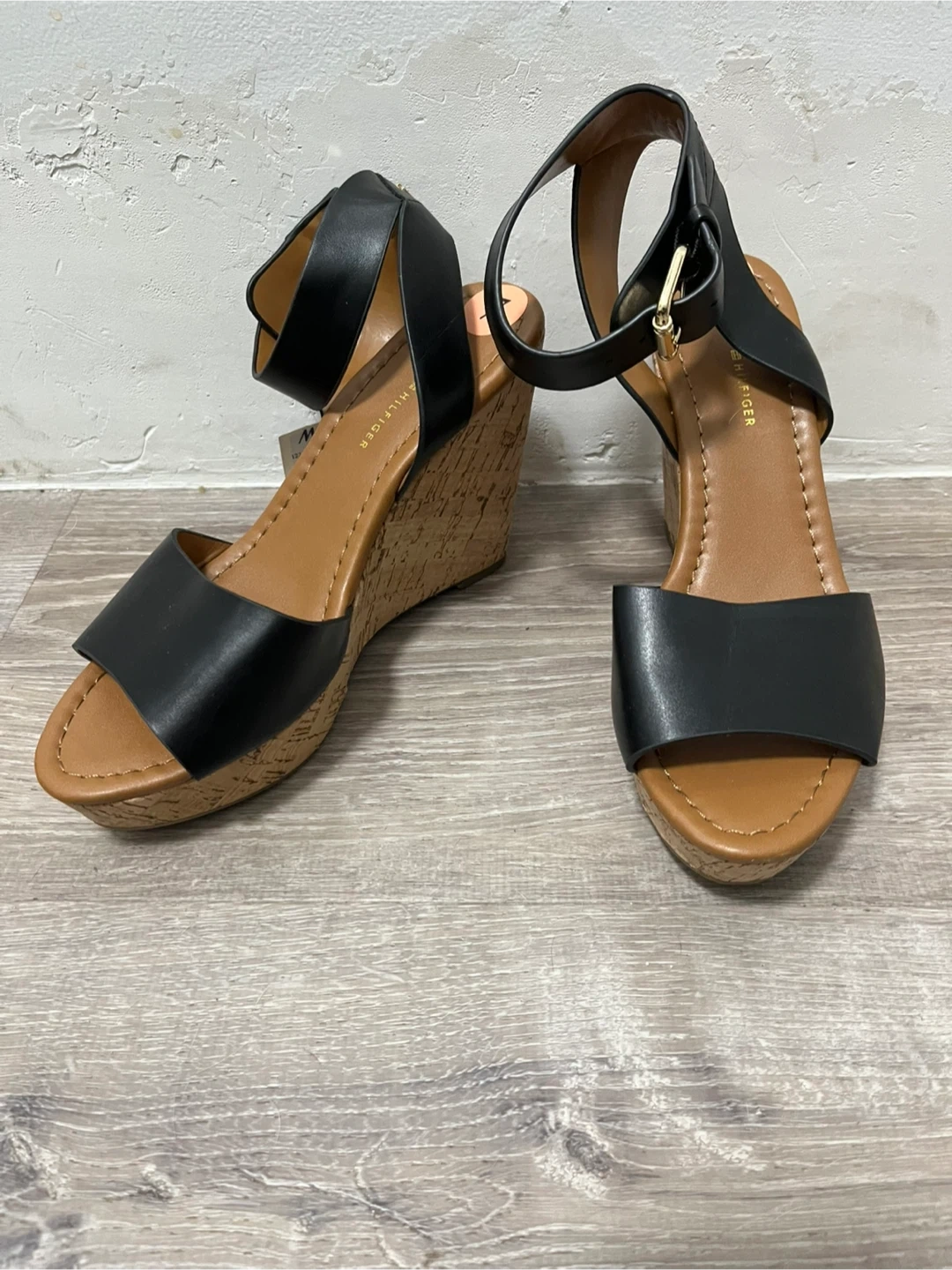 New Tommy Hilfiger black wedge sandals in a size 7. Cork- style wedge heel and an ankle strap with a gold buckle.