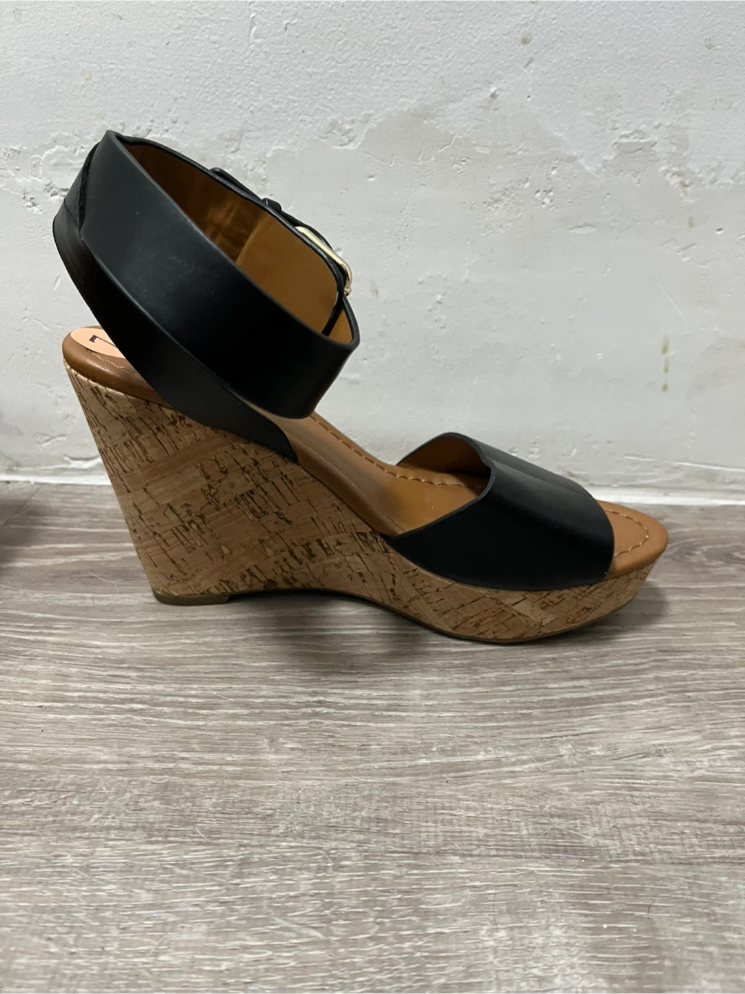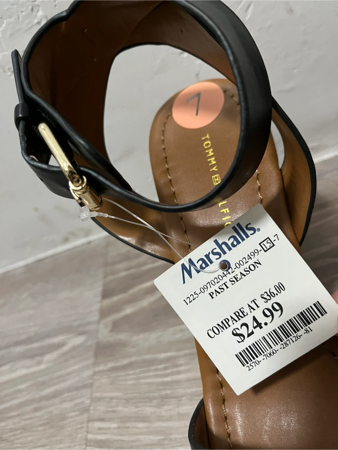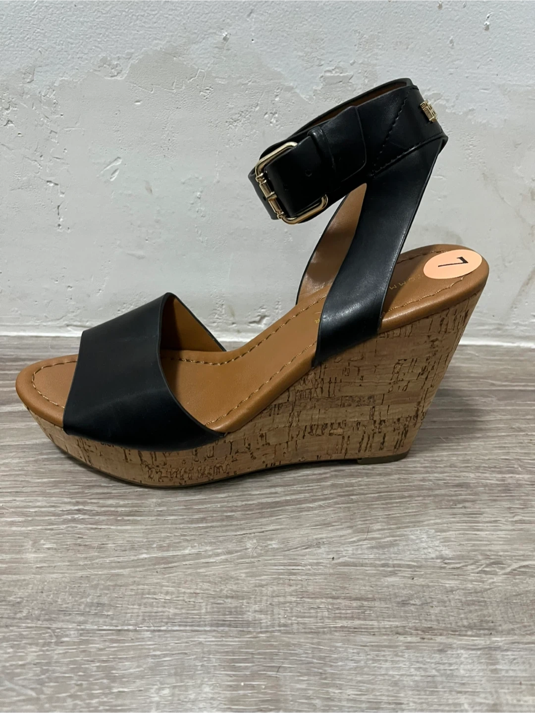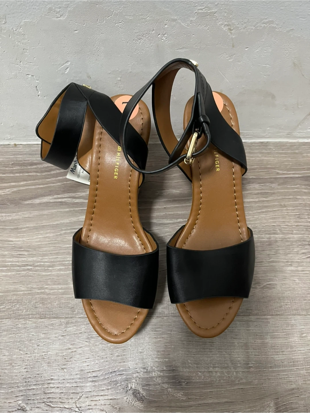 New Tommy Hilfiger black wedge sandals in a size 7. Cork- style wedge heel and an ankle strap with a gold buckle.