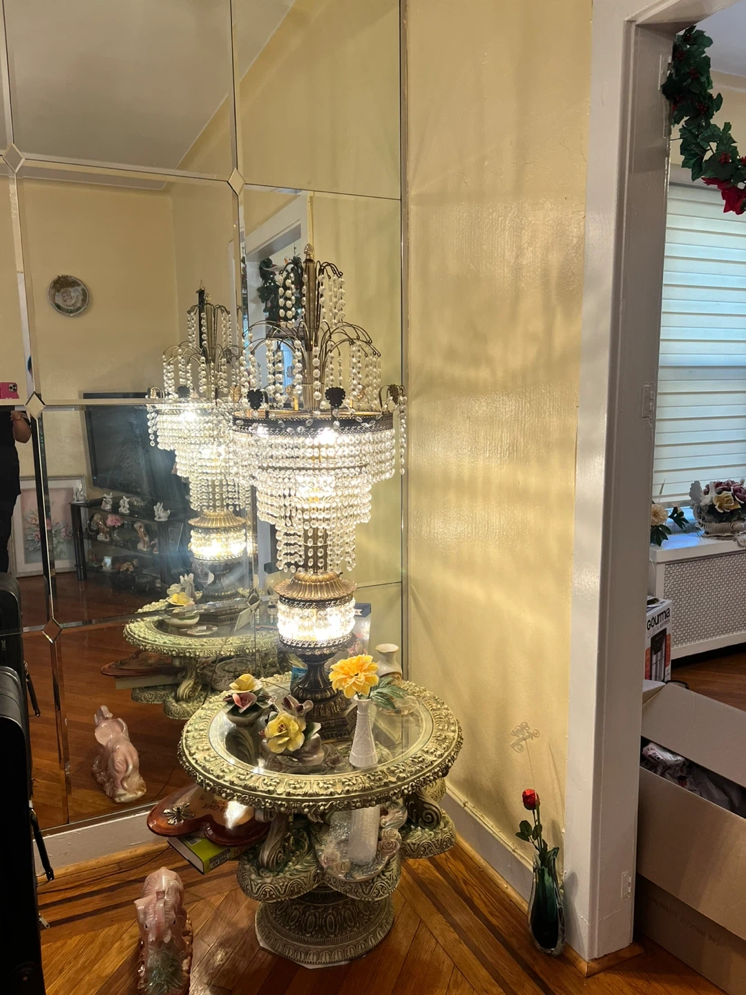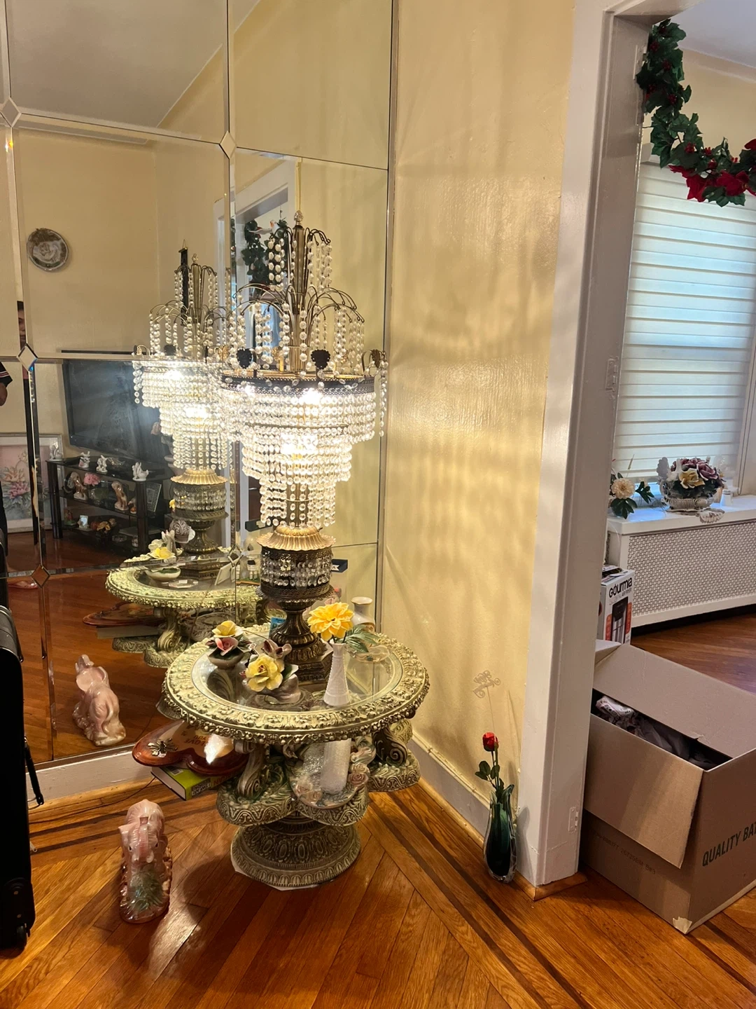 32Selling a beautiful vintage table lamp with a chandelier design. It features cascading crystals and an ornate base. It would be a great addition to any room! Two lamps available.