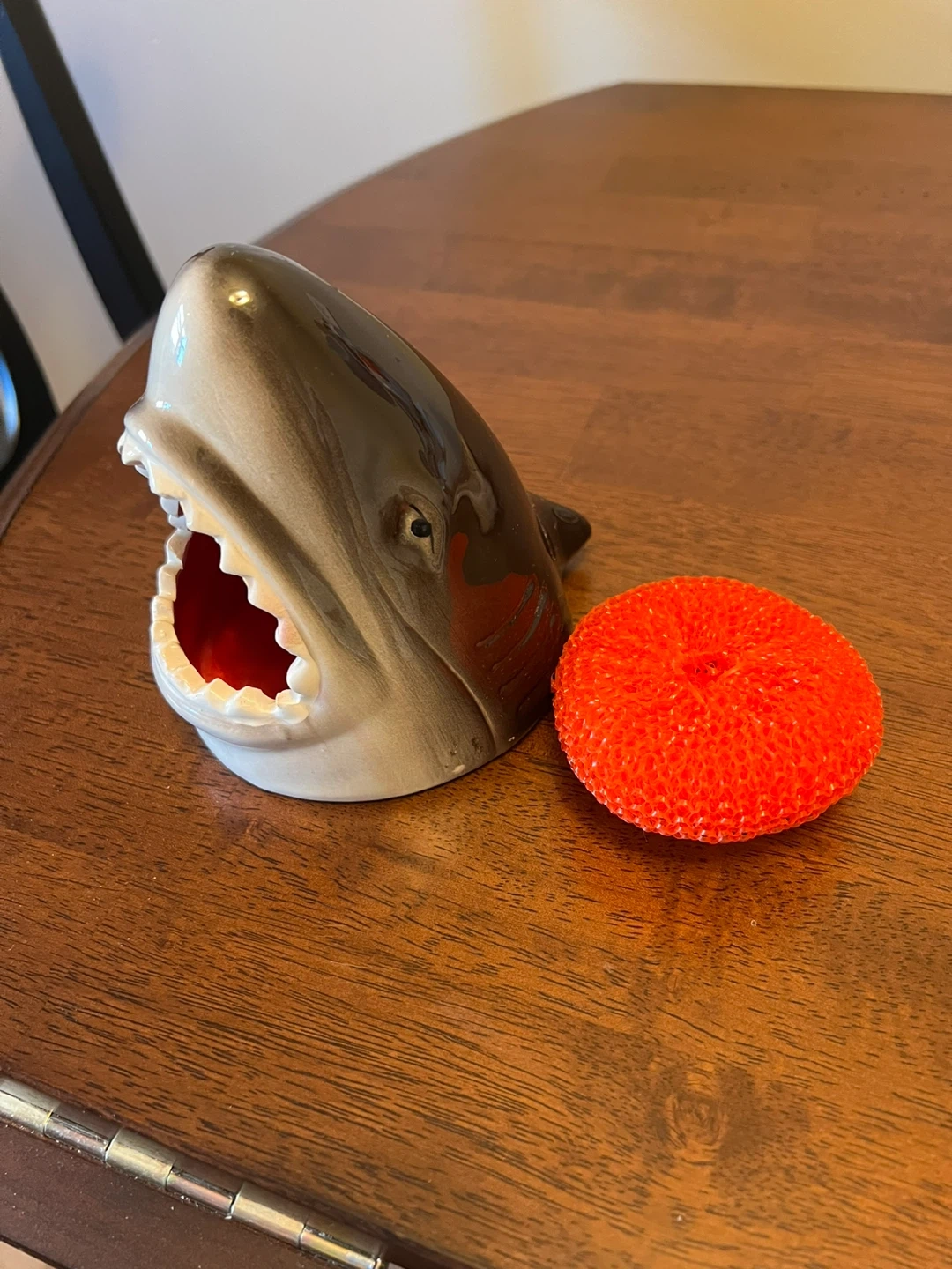 Here's a fun shark sponge holder for your kitchen! It's in great condition and ready to add some personality to your sink area.