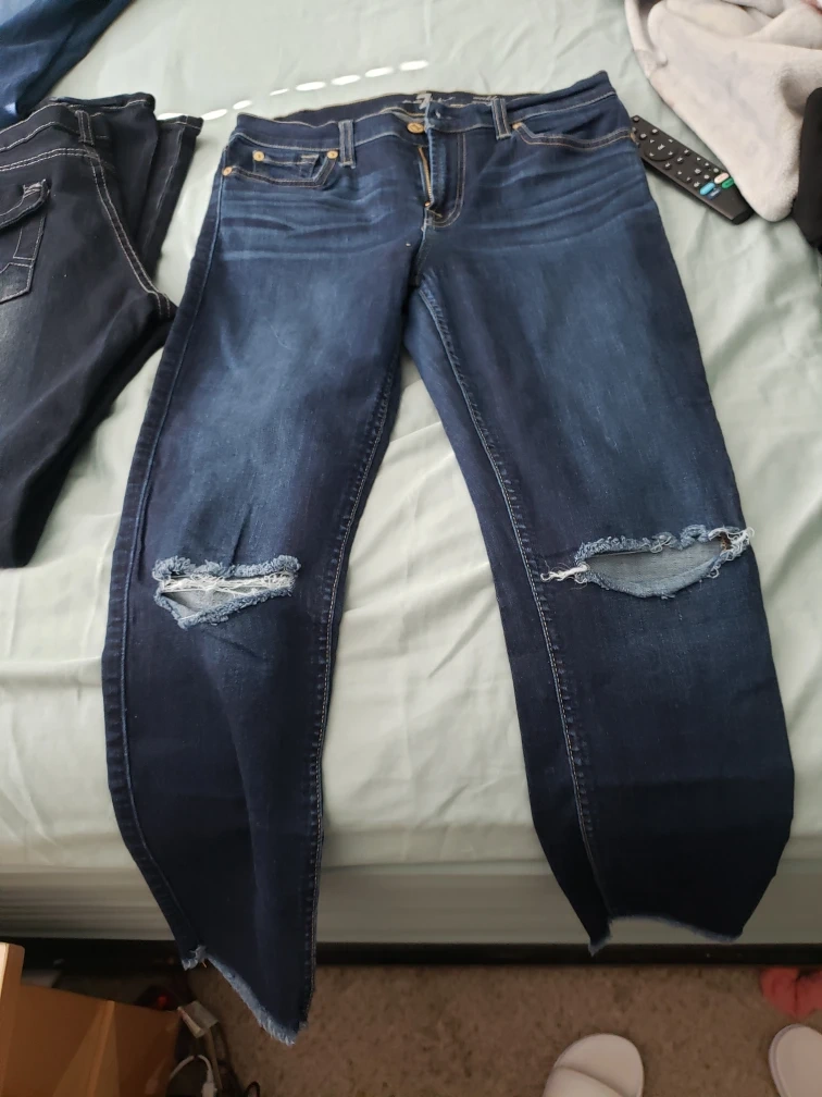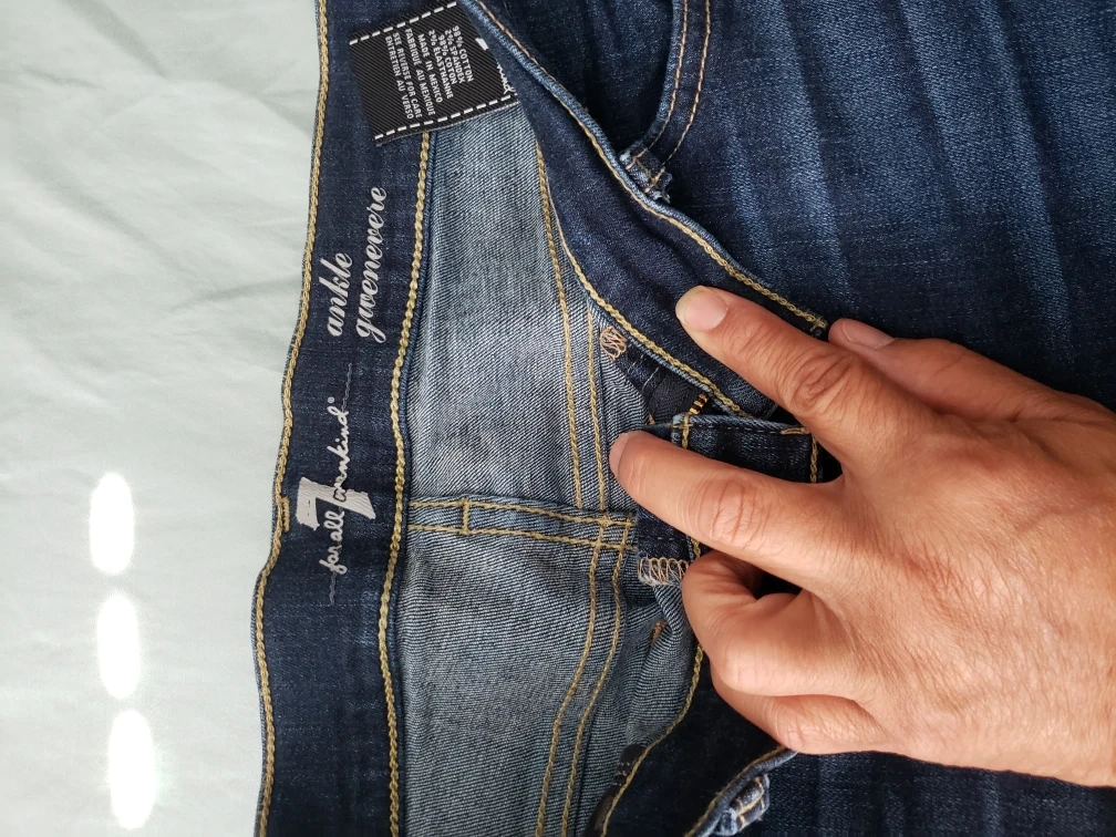 Selling a pair of 7 For All Mankind Ankle Gwenevere jeans. They are a dark wash denim with distressed knees. These jeans are in good condition and ready for a new home! never used