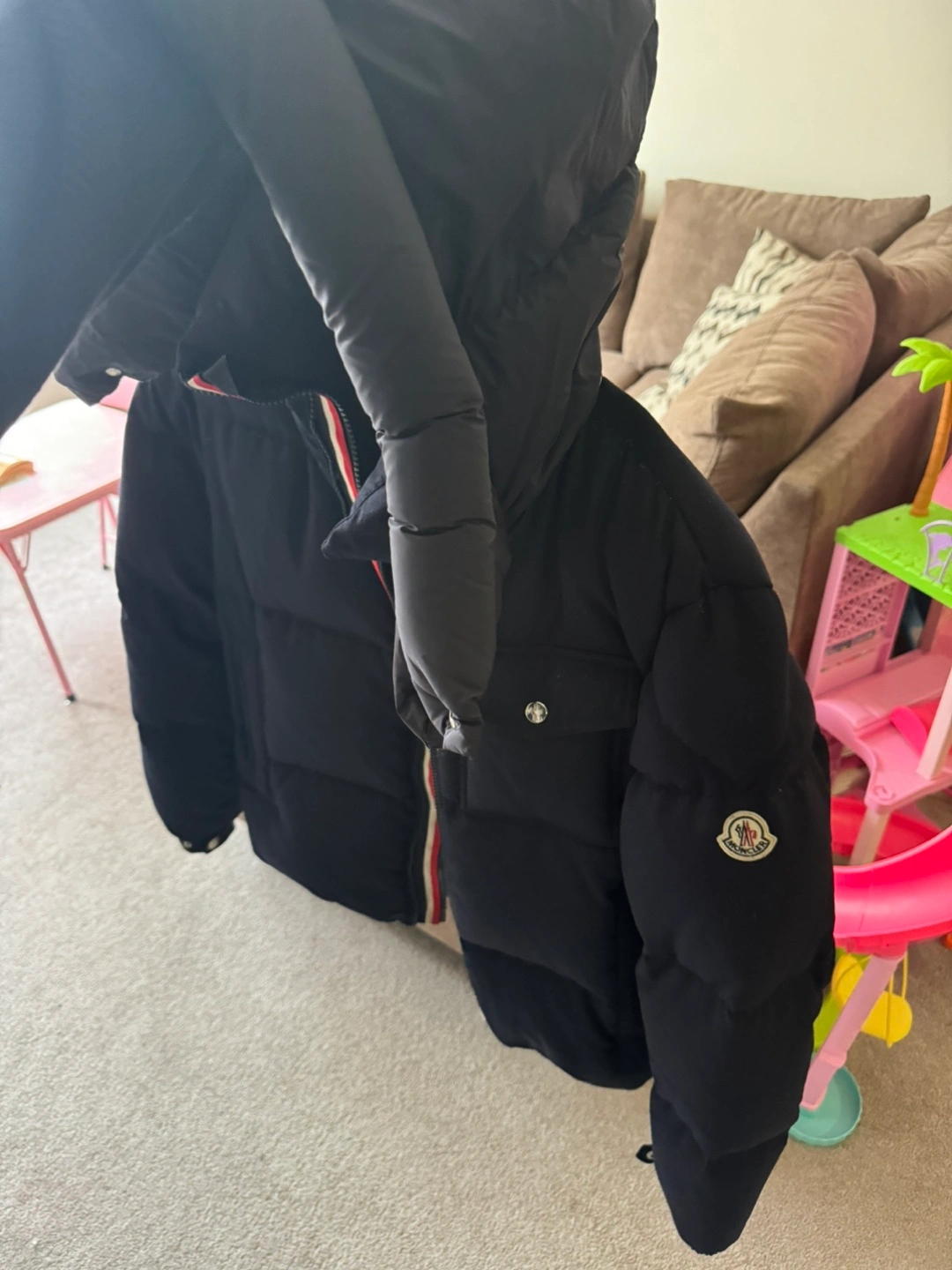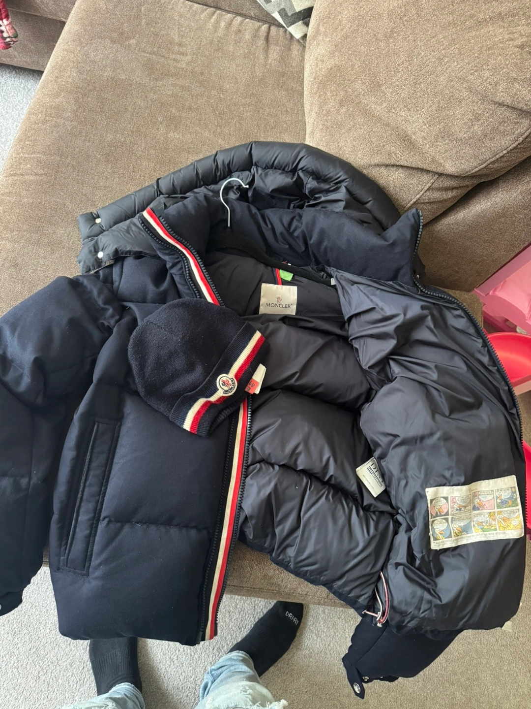 Selling a Moncler puffer jacket and hat set. The jacket features the iconic Moncler logo on the arm and a stylish red, white, and black stripe detail. The hat matches perfectly, completing the look! Great for staying warm and fashionable during the colder months