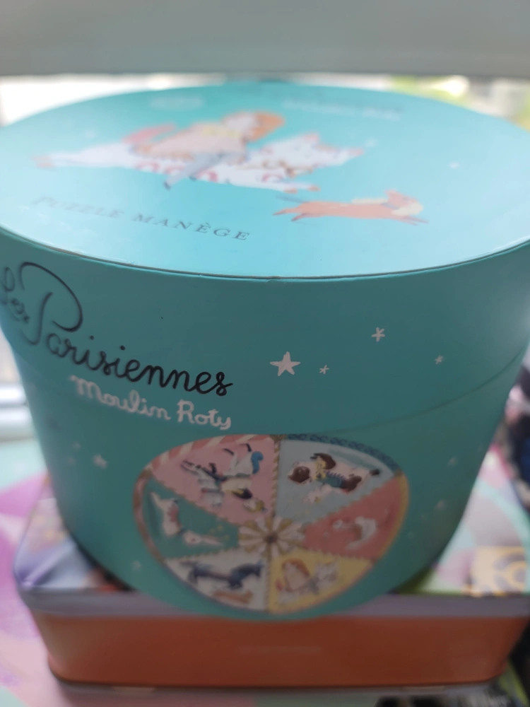 I'm selling a Moulin Roty Les Parisiennes Puzzle Manège with 45 pieces! It comes in a lovely round box, perfect for gifting or storing. The puzzle features charming illustrations from the Les Parisiennes collection. It's a delightful activity for kids and adults alike!