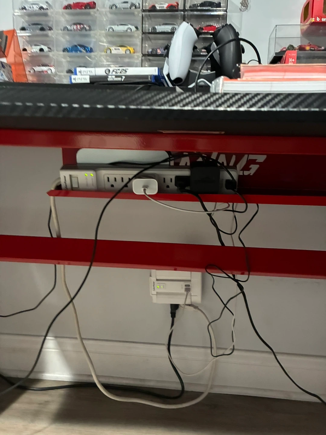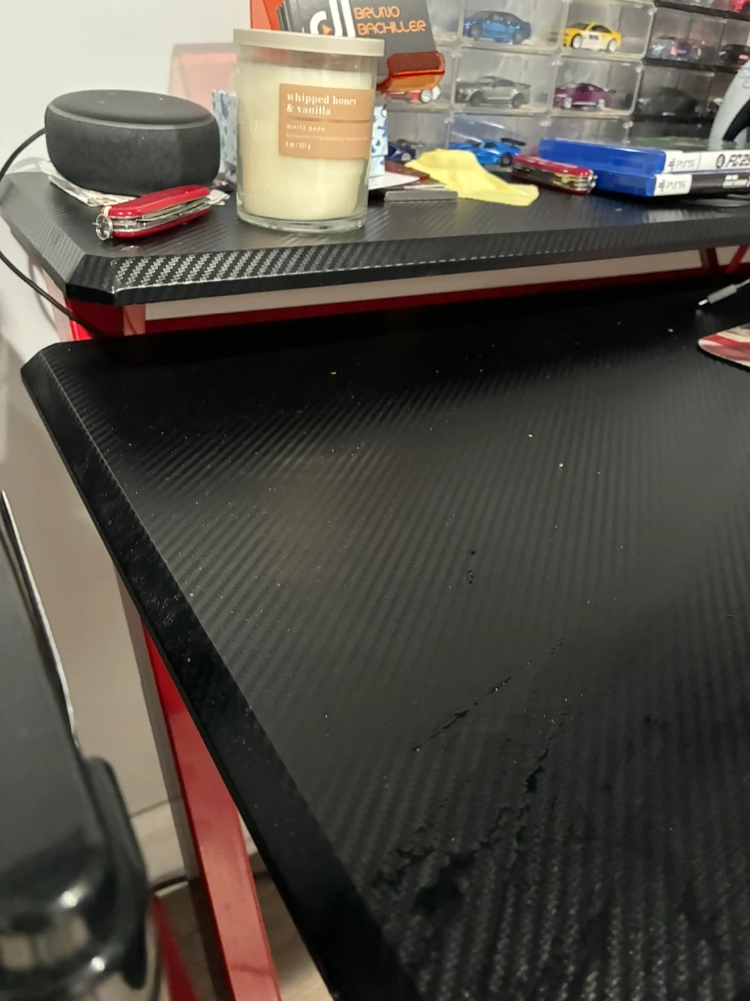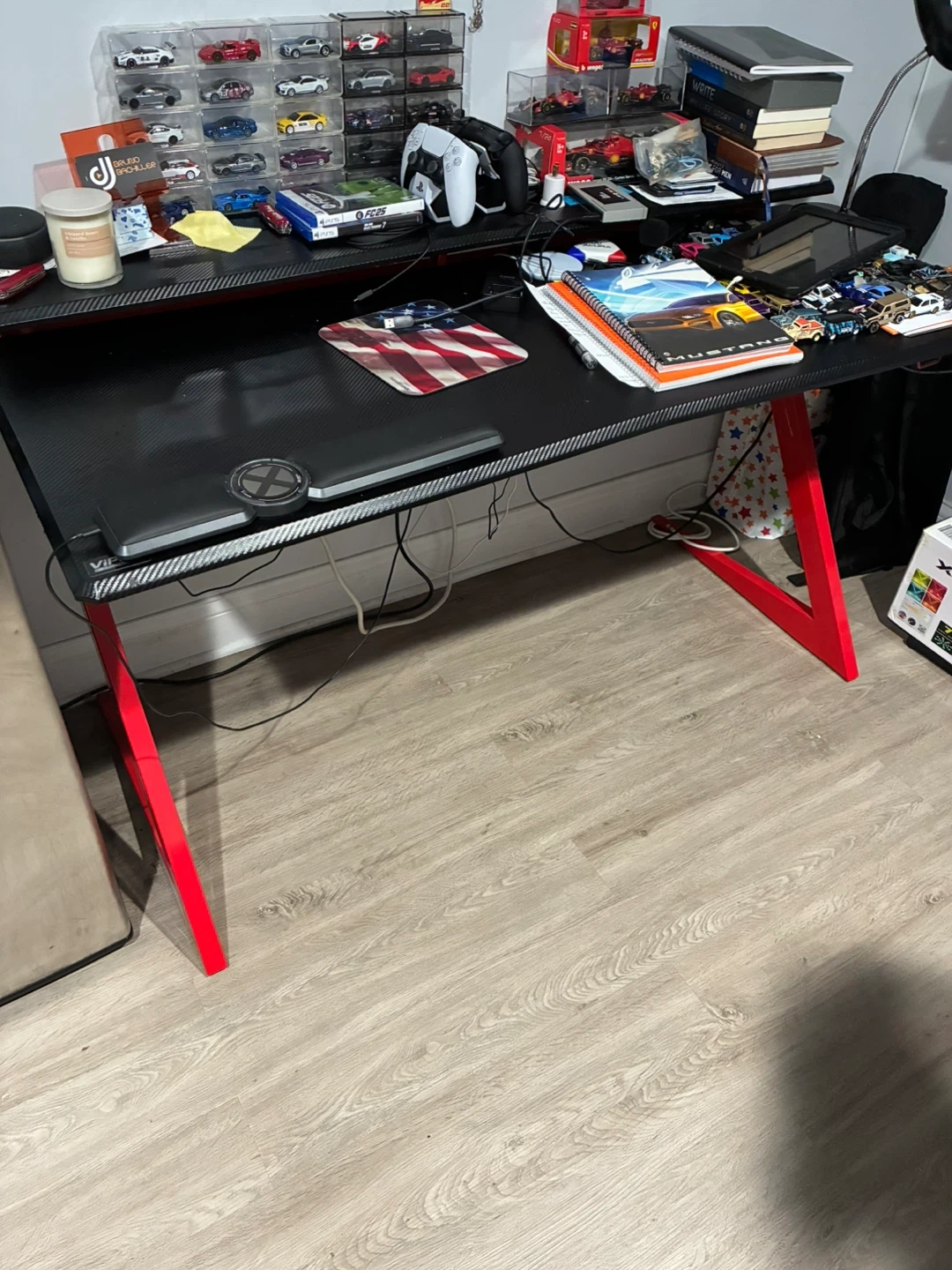 76Viper Ergonomic Gaming Desk Selling a Viper ergonomic gaming desk with a black carbon fiber top and red legs. The desk is about 30 inches deep. Pick up in Norridge