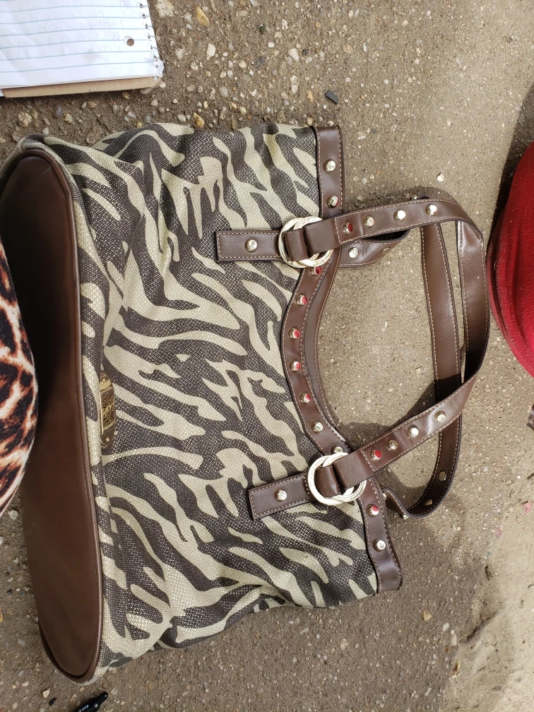Selling a Nine West shoulder bag with a cool zebra print! It features brown faux leather trim and studded accents. Perfect for adding a little flair to your outfit!