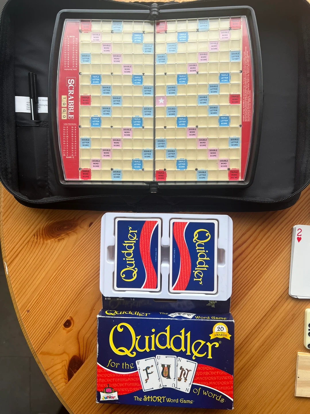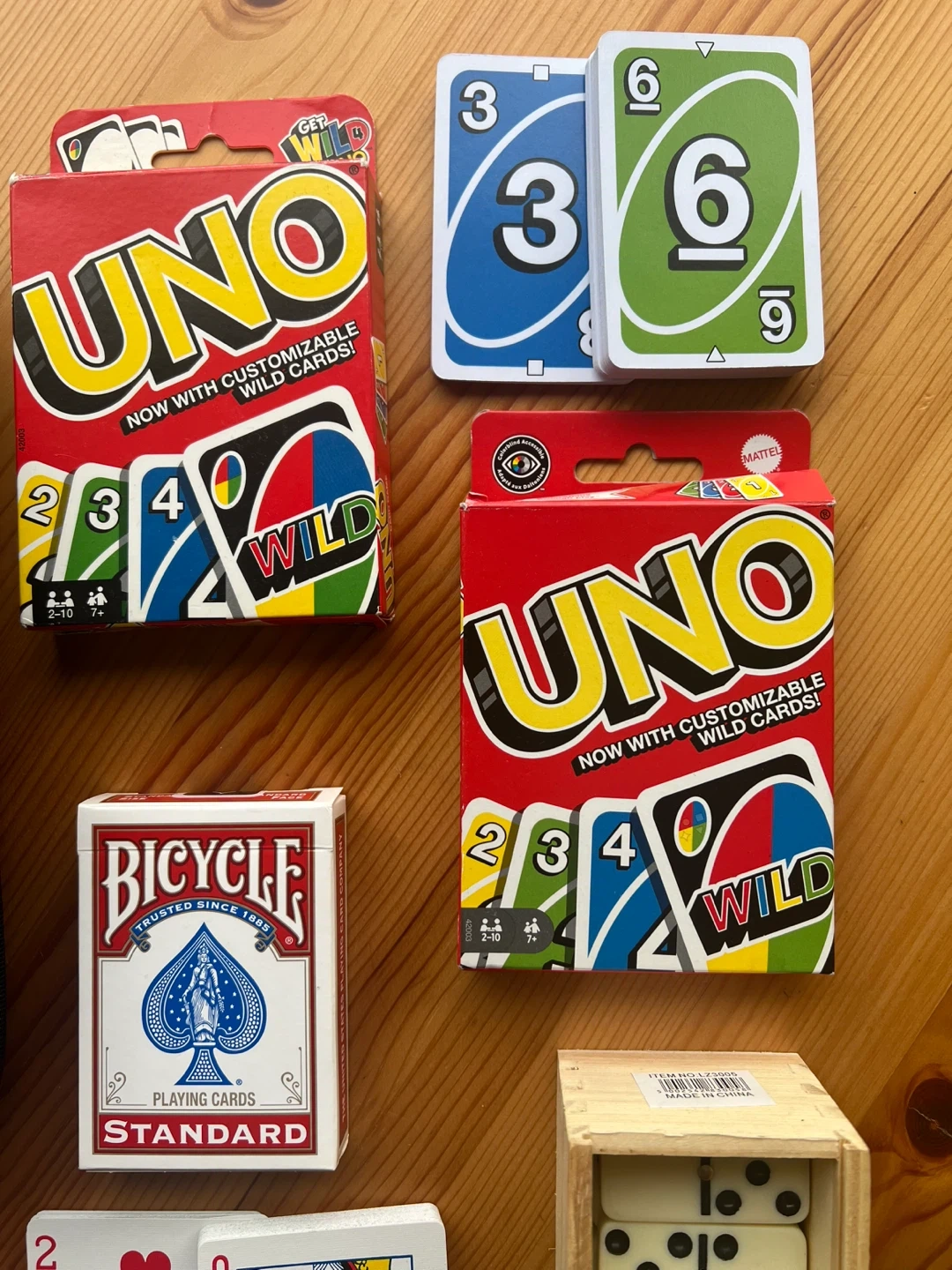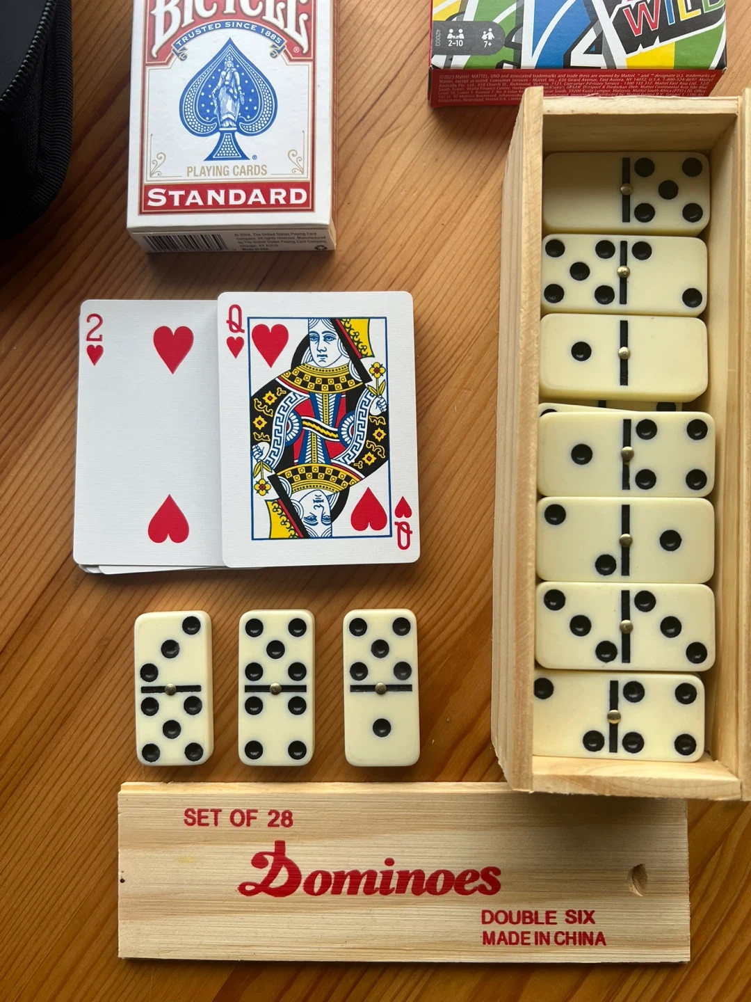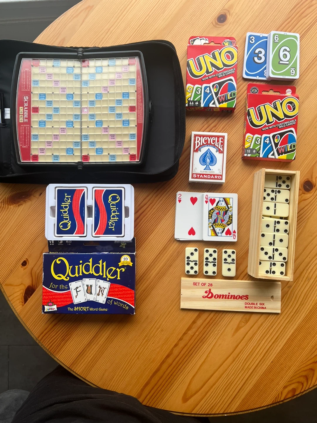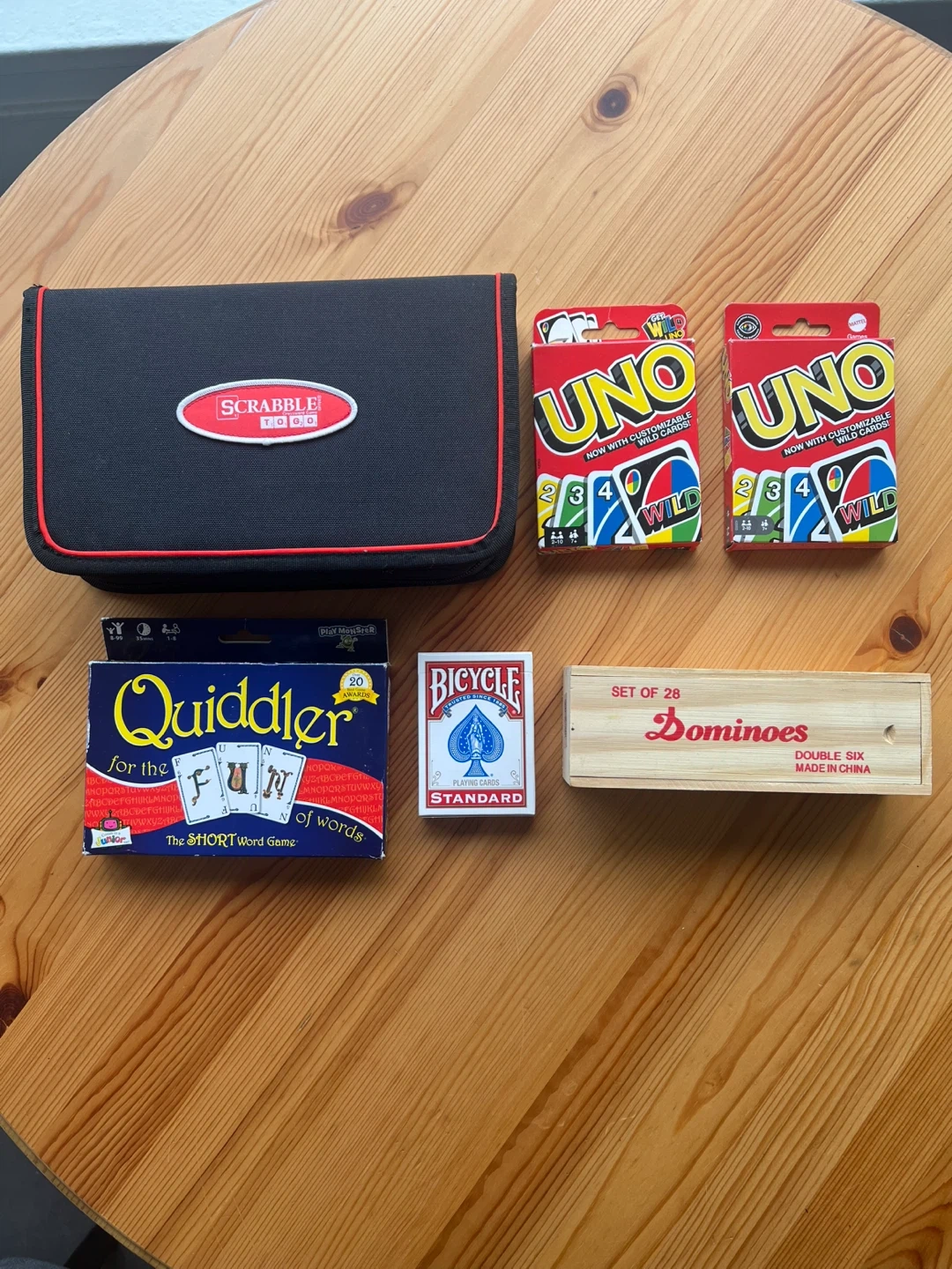 124Selling a bundle of fun games! Includes: - Scrabble To Go - Quiddler card game - Two packs of Uno cards - Bicycle Standard playing cards - Set of 28 Dominoes Or Selling separate $5 each
