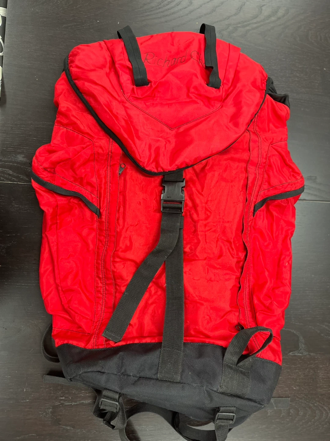 Red and black backpack with lots of straps and zippers. Good for hiking