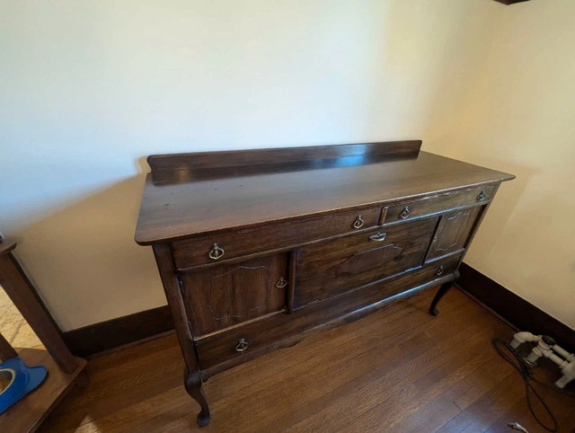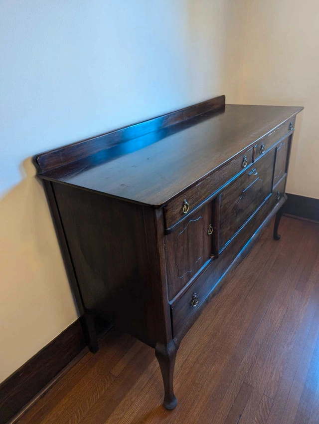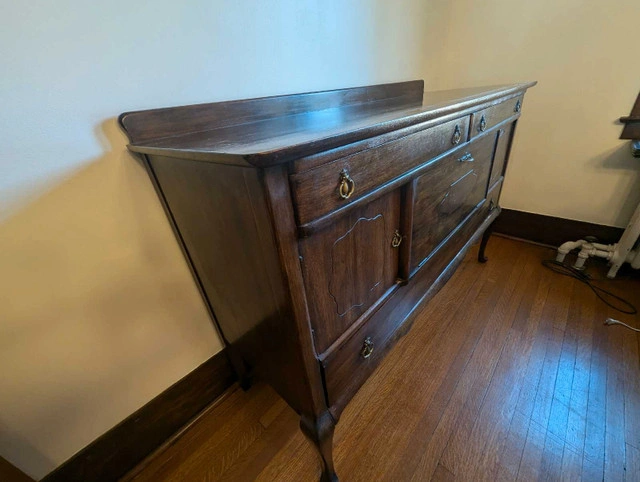 This antique buffet is a lovely piece of furniture, perfect for adding a touch of vintage charm to your dining room or living space. It features solid wood construction, ornate carvings, and ample storage space with drawers and cabinets. This piece has definitely seen some things, adding to its unique character and appeal. Some repairs may be required, but it's in good shape. Here are some details: * Solid wood construction * Ornate carvings * Multiple drawers and cabinets * Classic design Looking at similar buffets, a fair price for this would be $100. It's a bit of a steal, really! If the ad is up, it's available! I'm ready to pass on this beauty to someone who will appreciate its vintage soul.