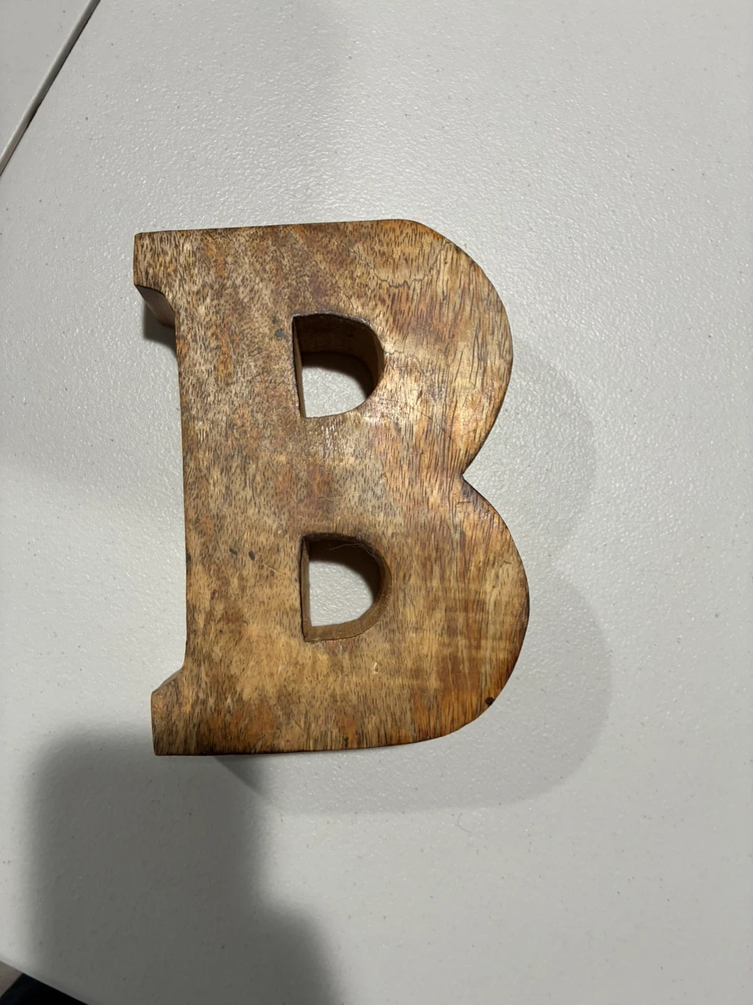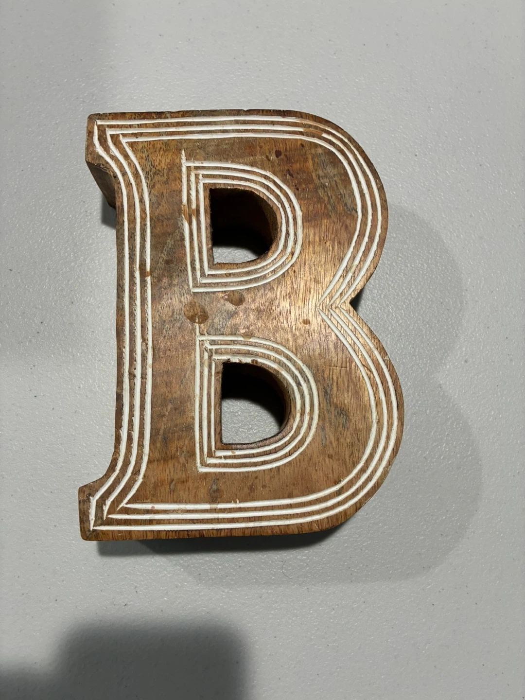 Wooden Letter B Here's a wooden letter B, perfect for adding a personal touch to your space or for crafting projects! It has a warm, natural wood tone with decorative white accents. Made in India! Pick up in Norridge