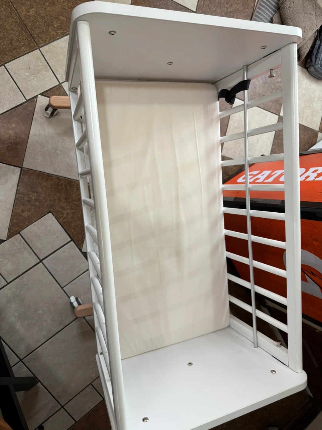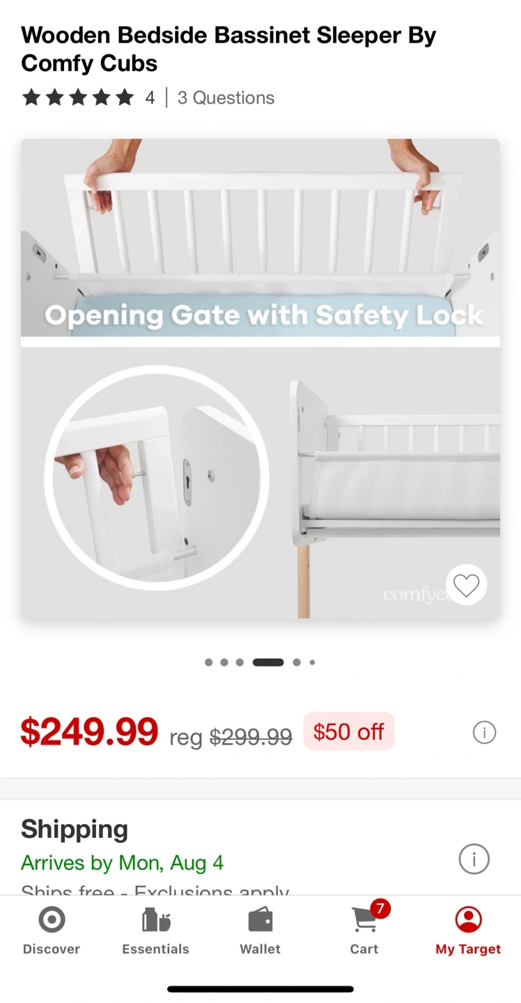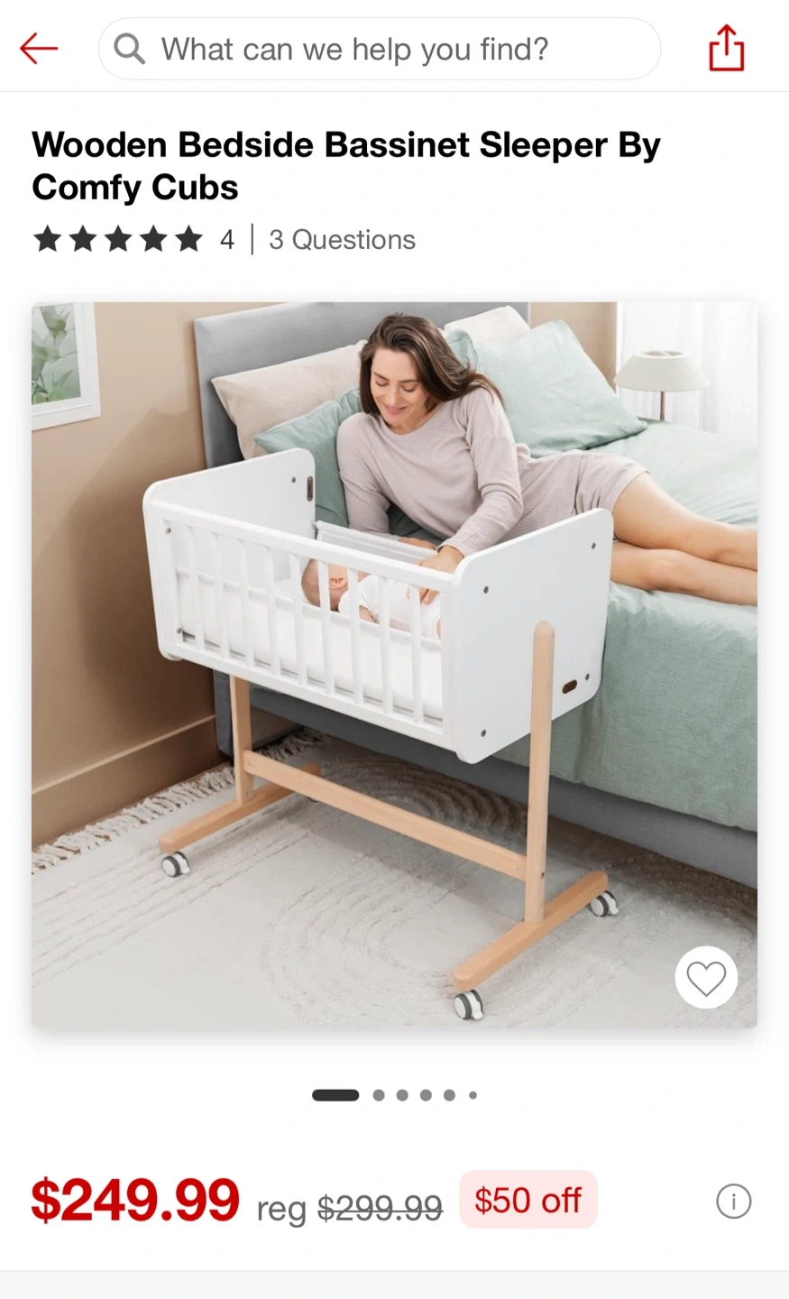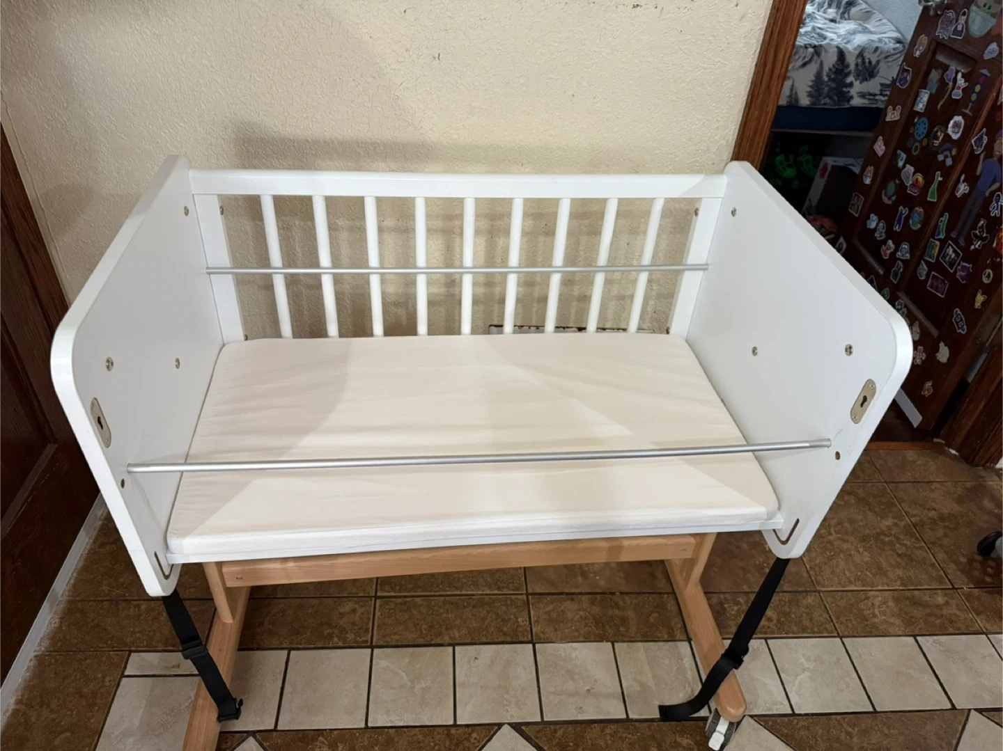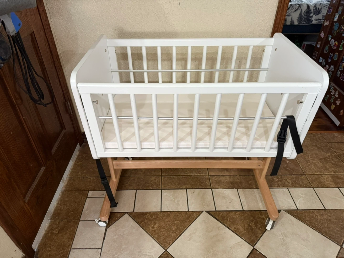 Selling a Comfy Cubs wooden bedside bassinet sleeper in white! This bassinet features an opening gate with a safety lock and 4 locking wheels for easy movement and stability. It also has 2 adjustable heights. Originally bought for $249.99
