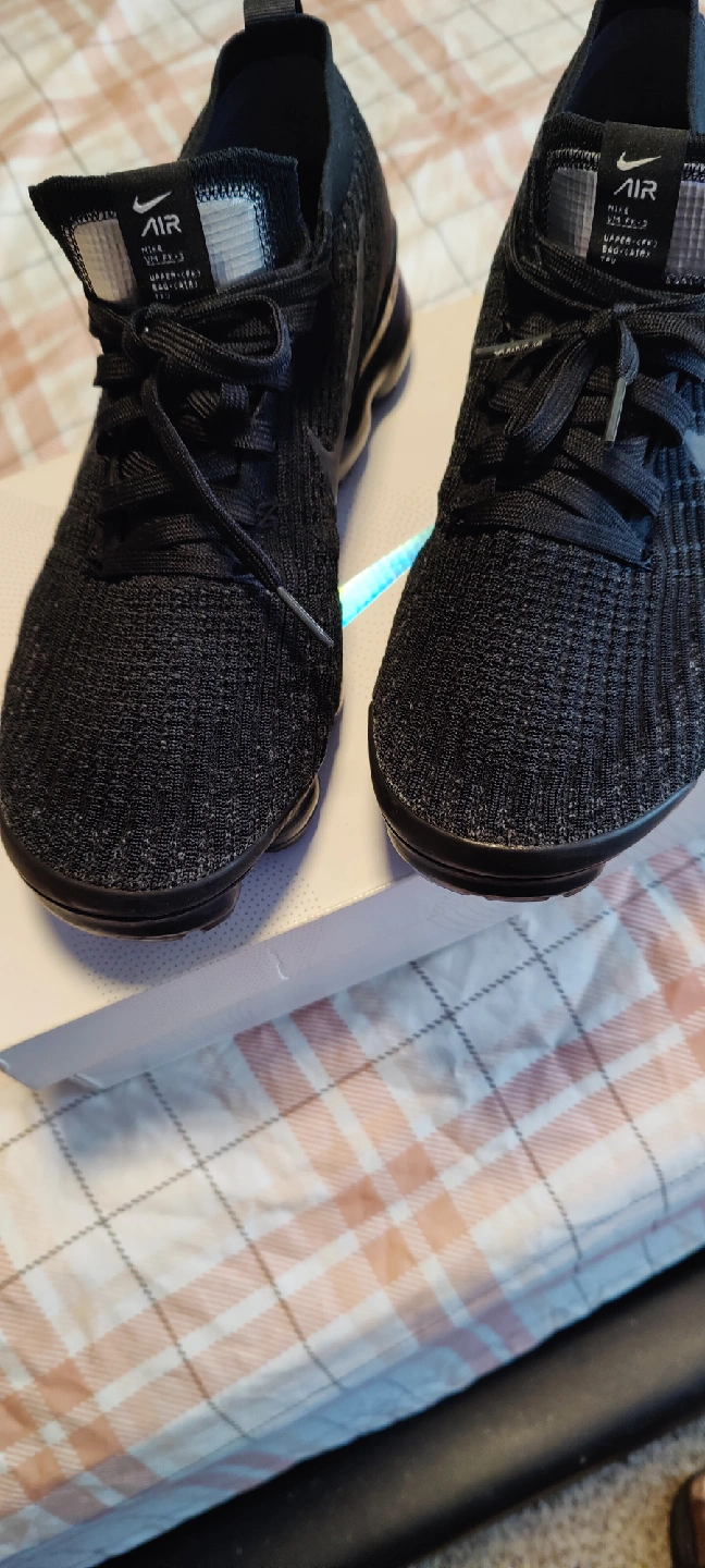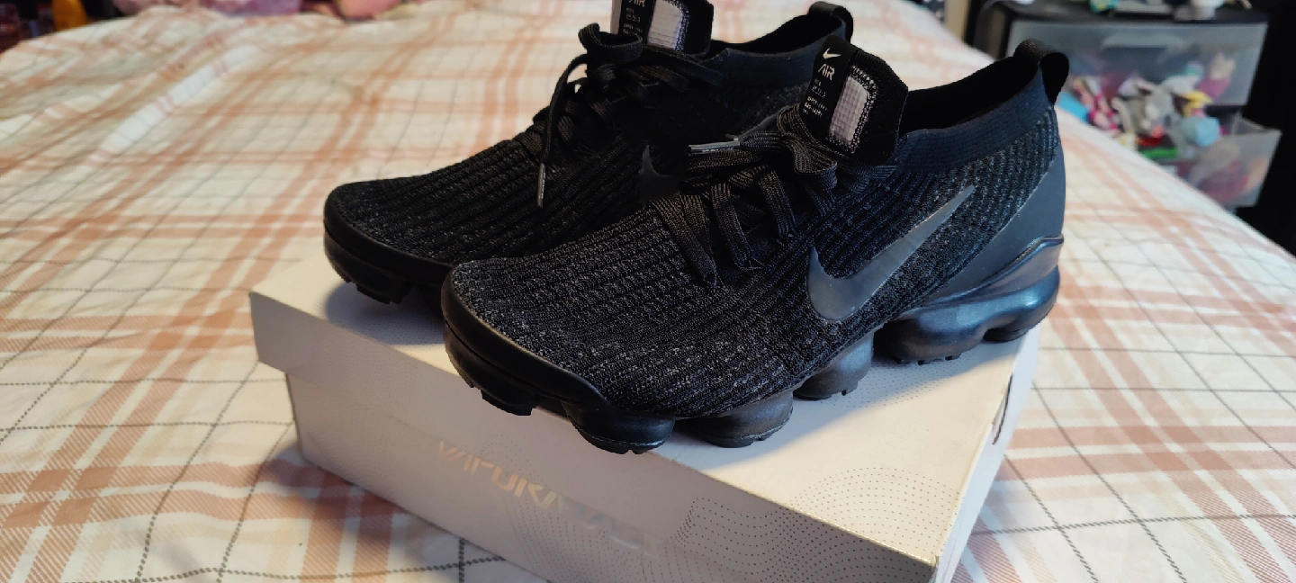 Selling a pair of Nike Air Vapormax Flyknit 3 in black. The shoes come with the original box. They are lightweight and portable!
