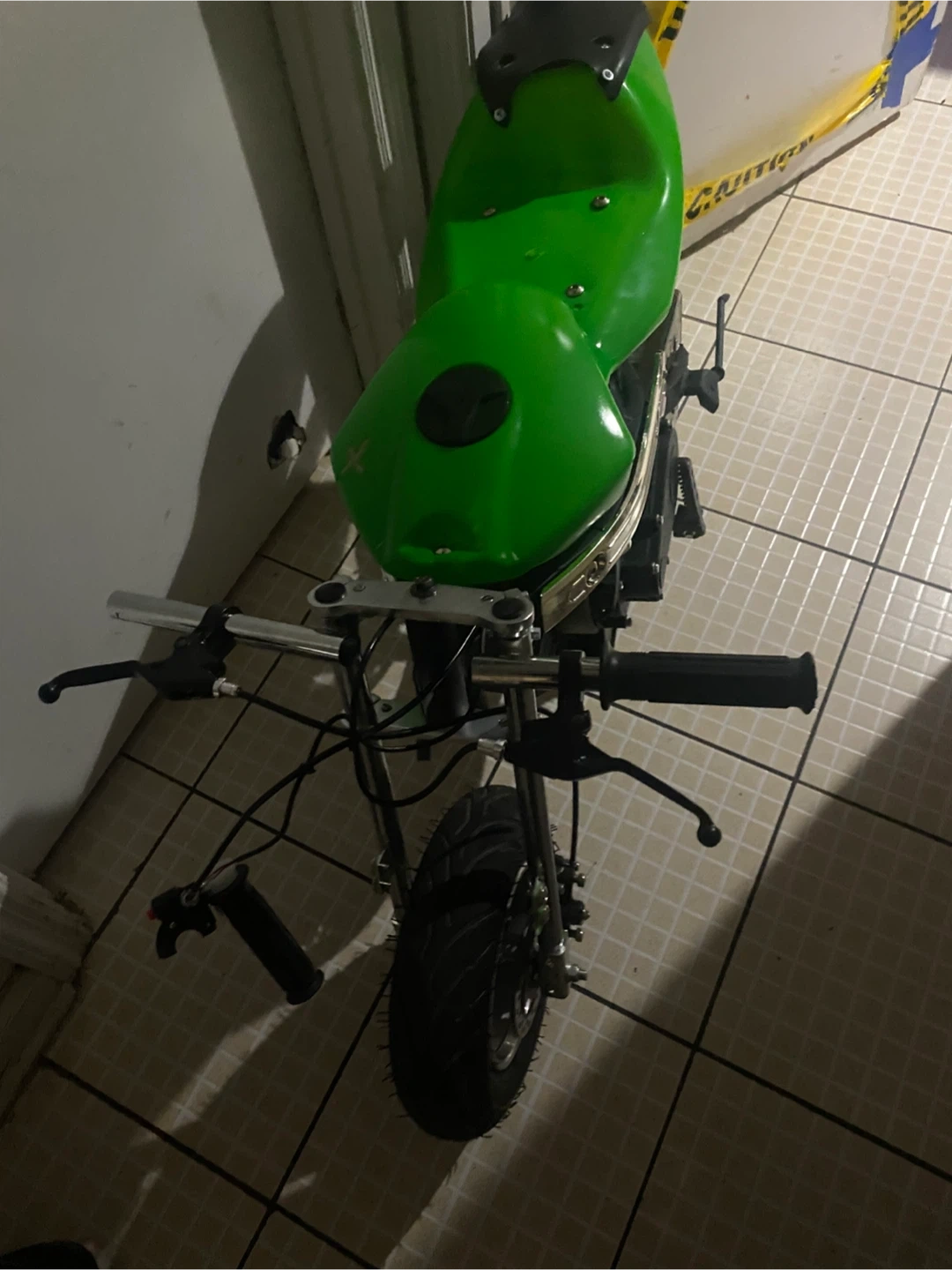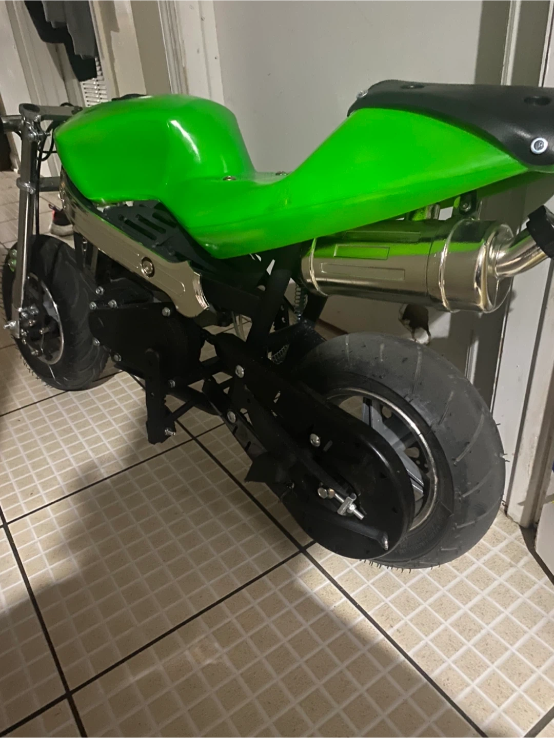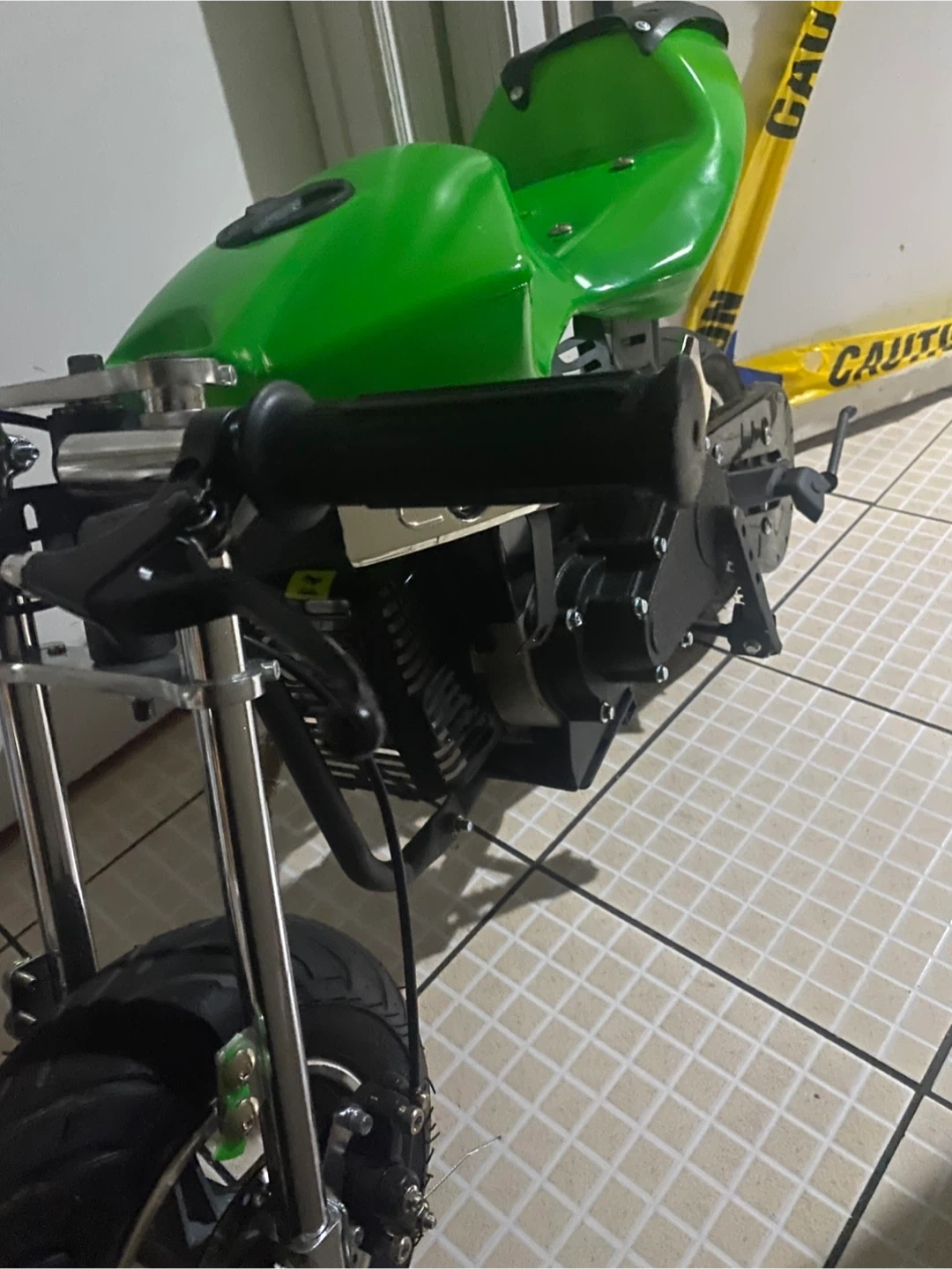 Selling a green pocket bike. It's in good condition besides the throttle is broken and kill switch it got a full tank of gas so it’s ready to ride as soon as you get the part it costs like 12 to 15 bucks on Amazon and as you can see the black part of the seat is off and at the top I just need it gone tbh