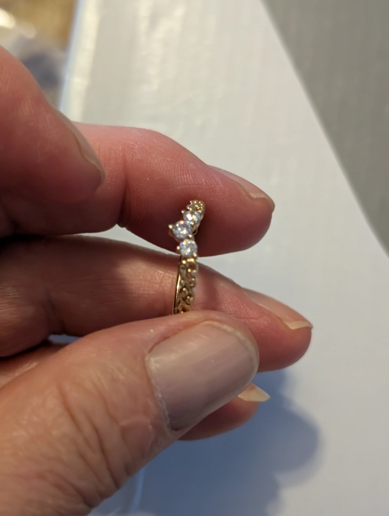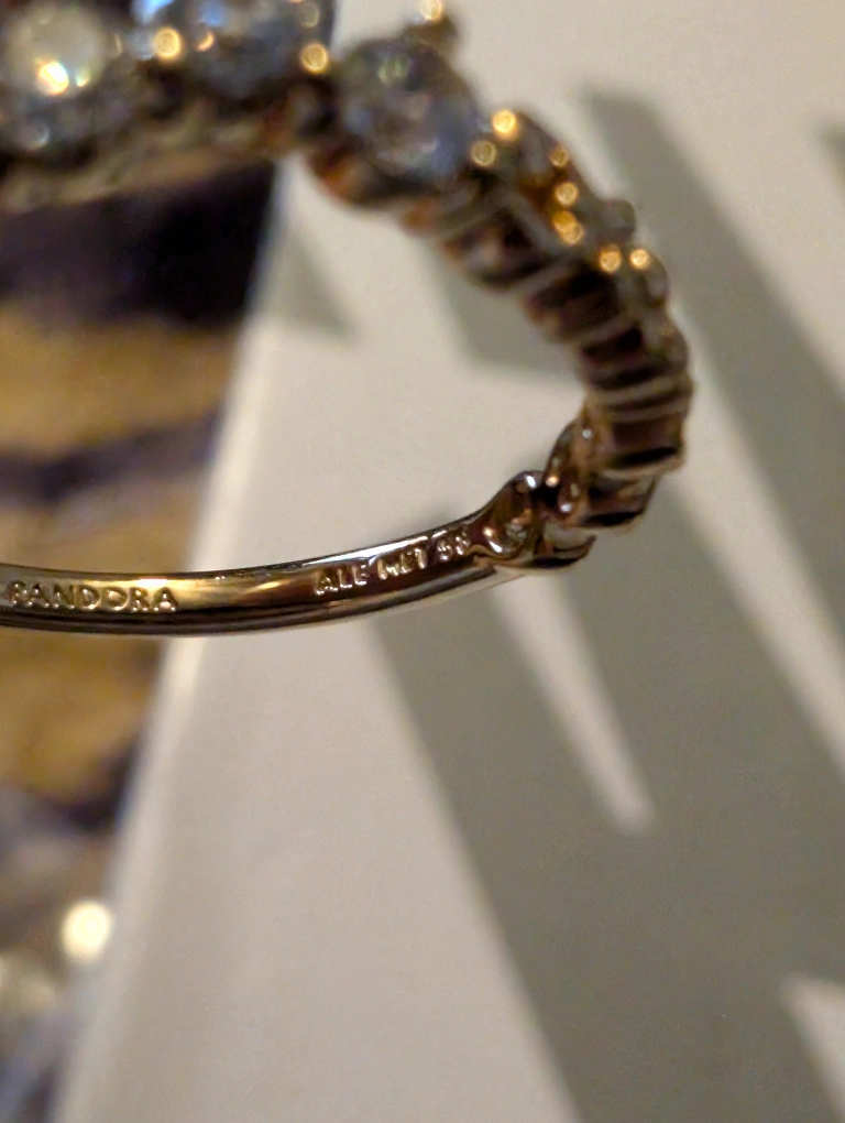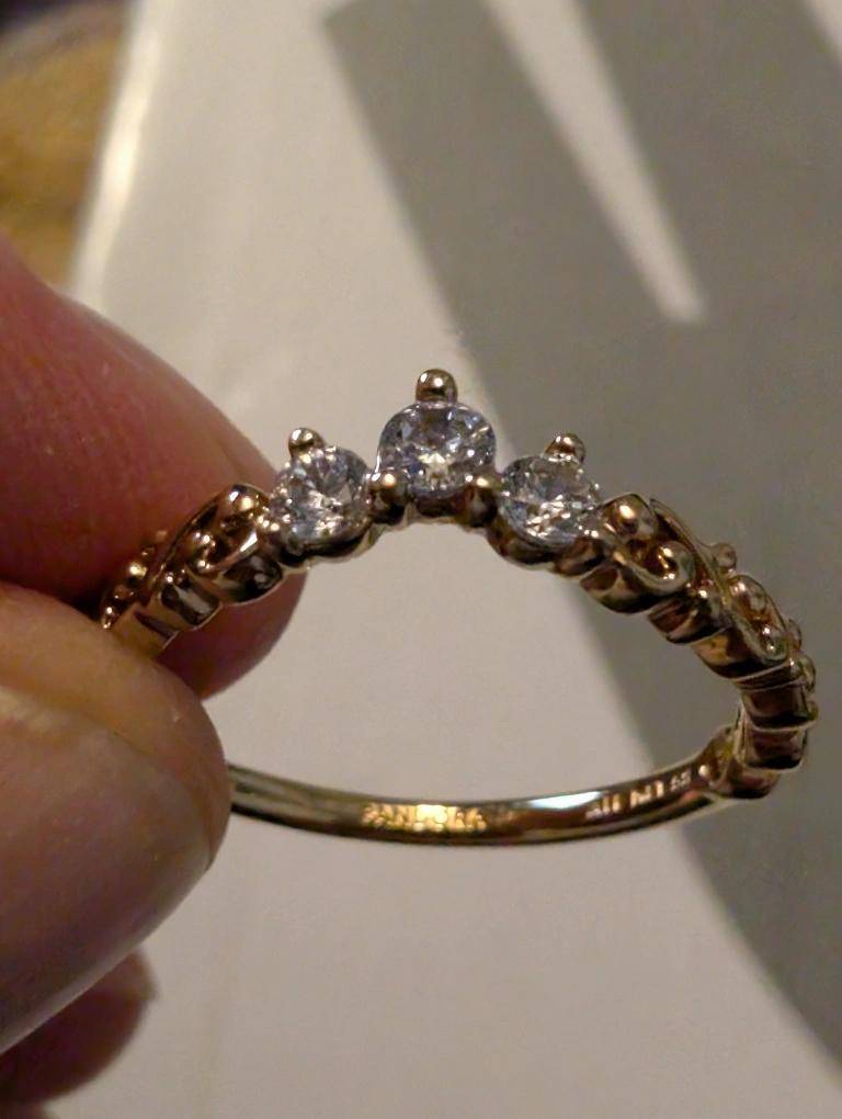 Selling a beautiful Pandora Regal Swirl Tiara ring crafted with a 14 k gold plating this aristocratic piece features a tiara decorated with thri sparkling stones and swirling filigree.