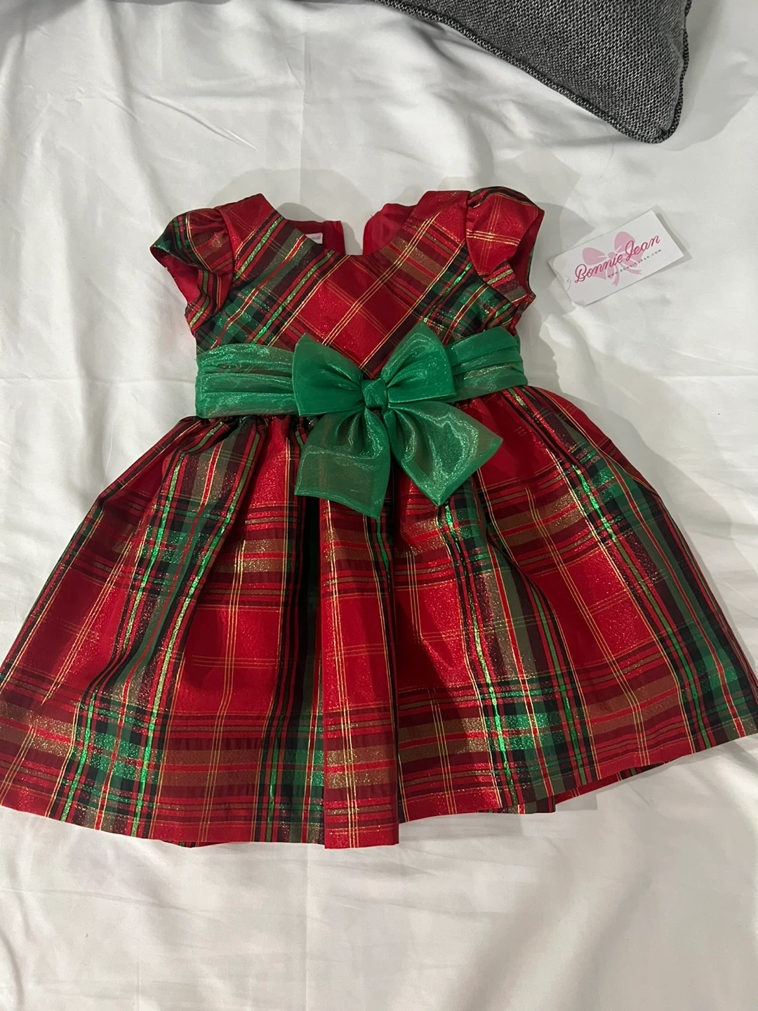 This adorable Beanie & Jean dress is perfect for the holidays! It features a classic plaid pattern in red, green, and gold, complete with a green bow. The dress is a size 2T.
