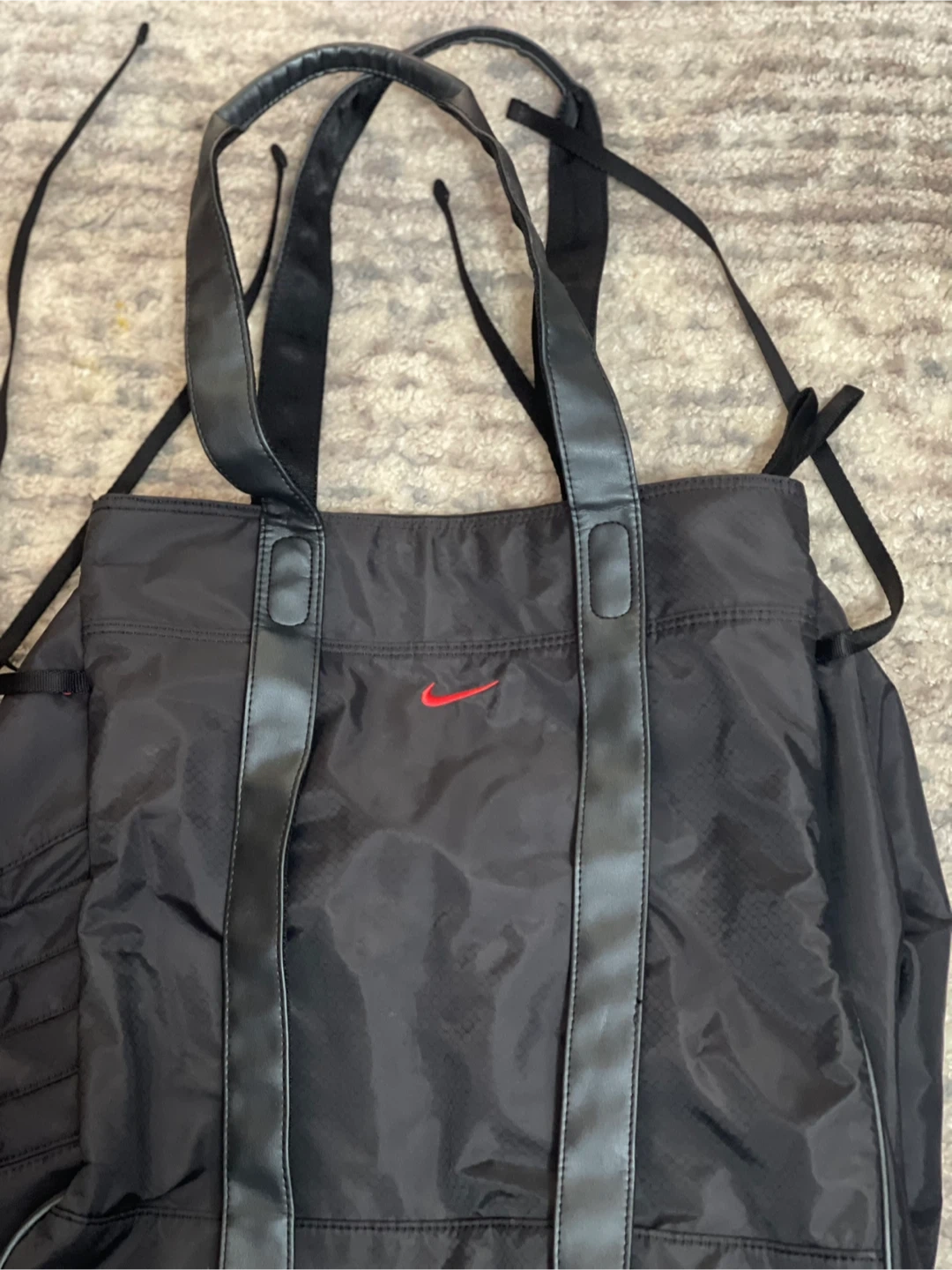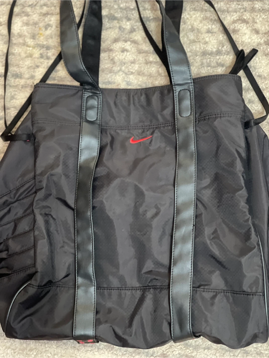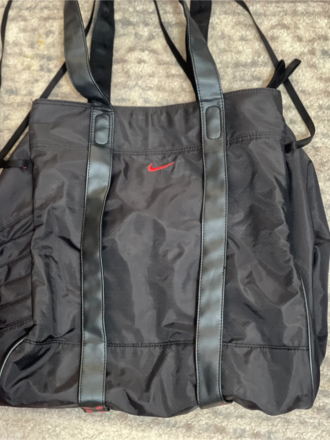 Selling a black Nike tote bag! It's in great condition and perfect for carrying your essentials. The interior is a vibrant red color