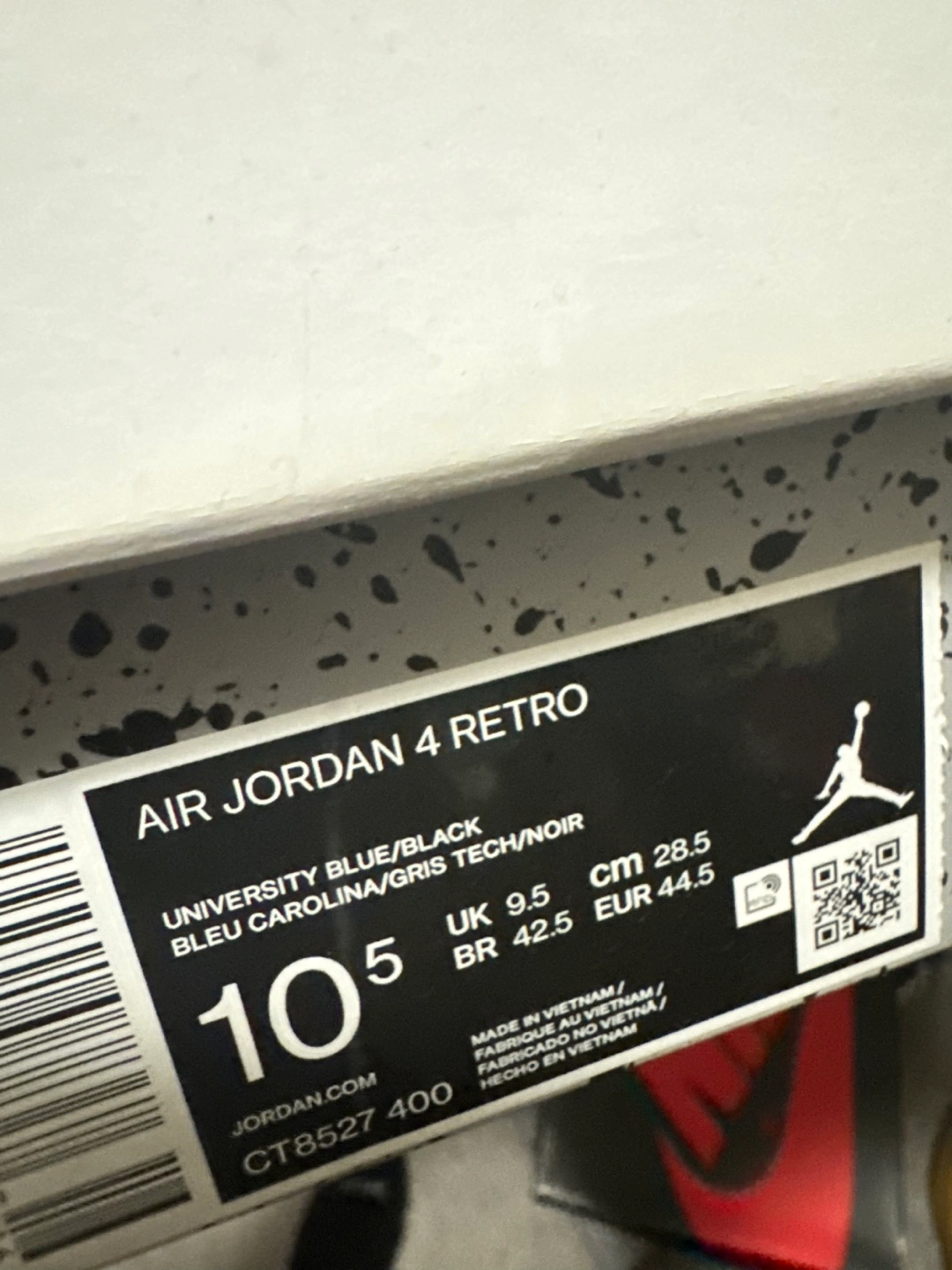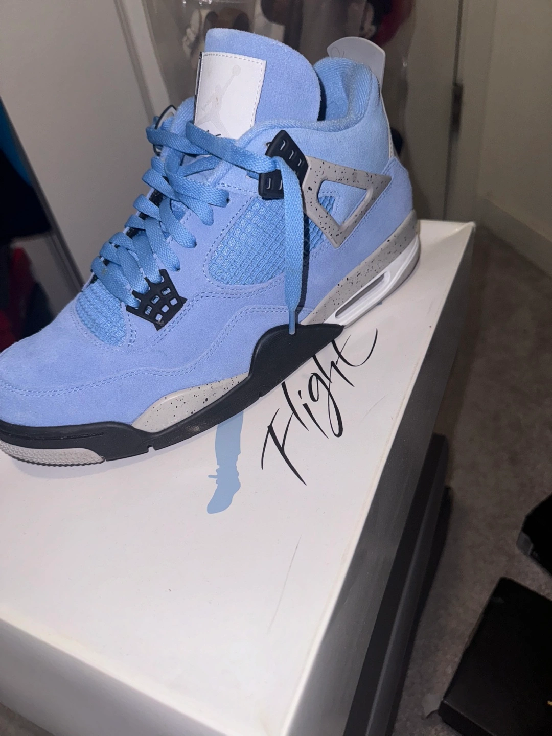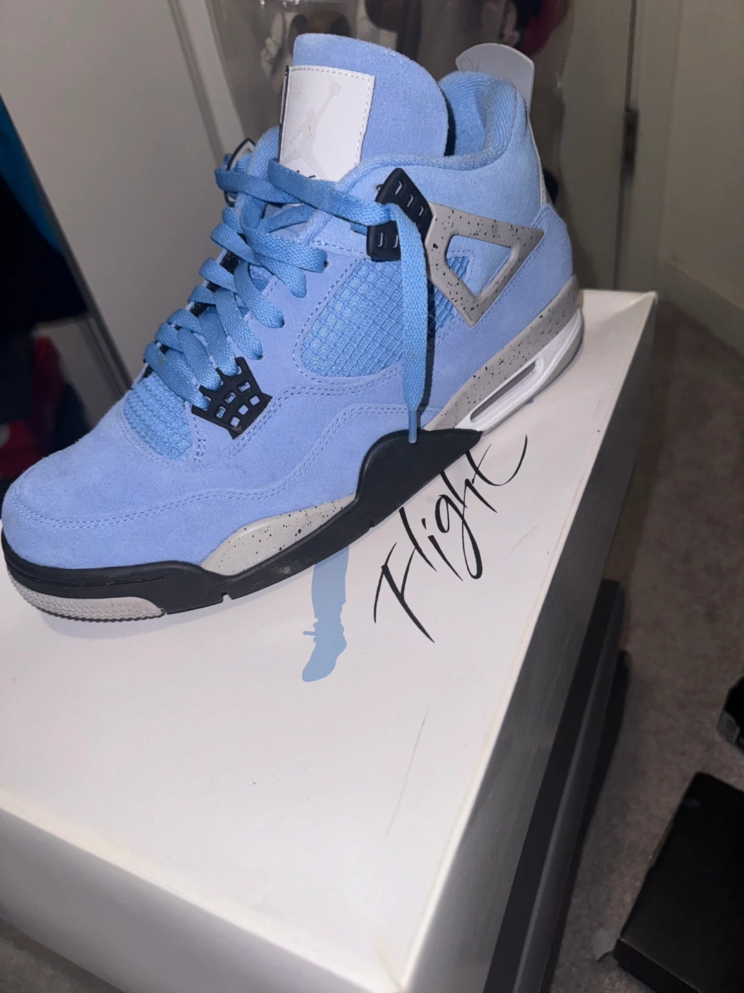 Selling a pair of Air Jordan 4 Retro in the University Blue colorway, size 10.5. These come with the original box. New