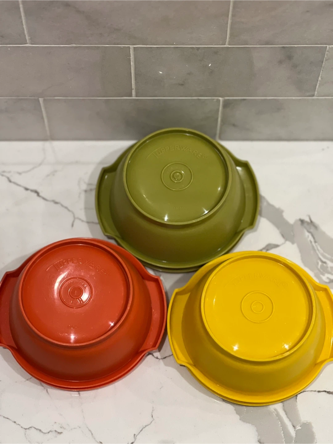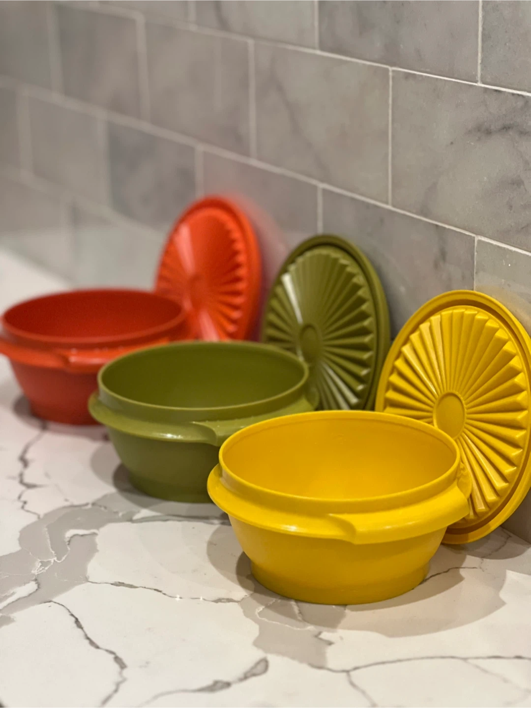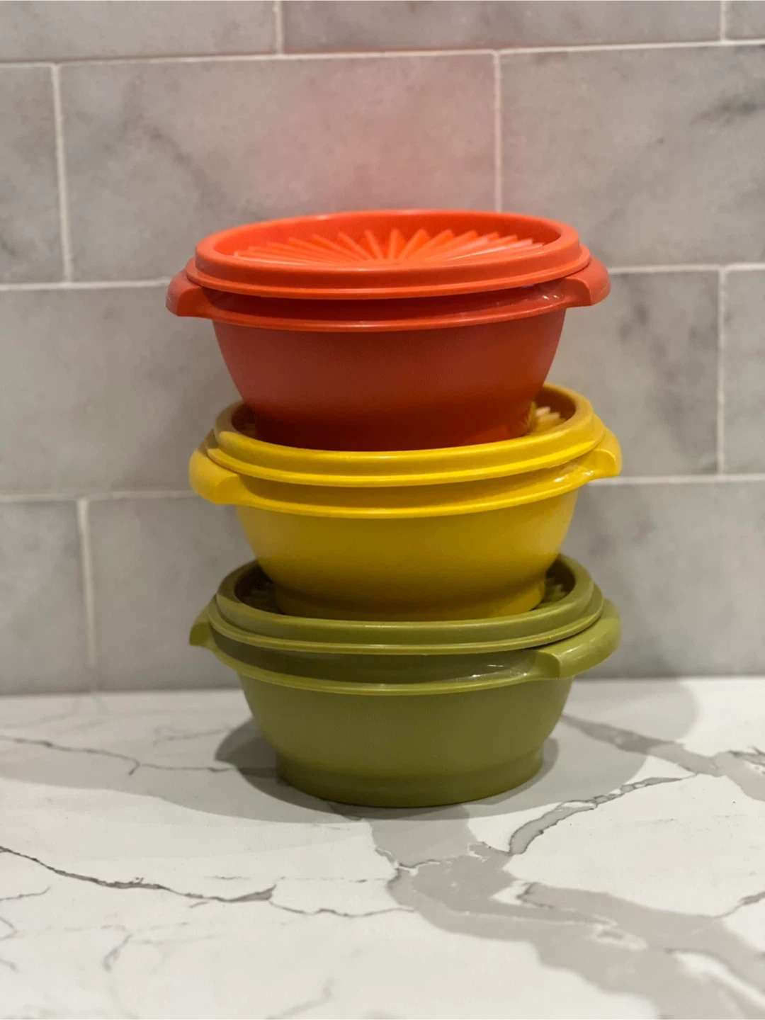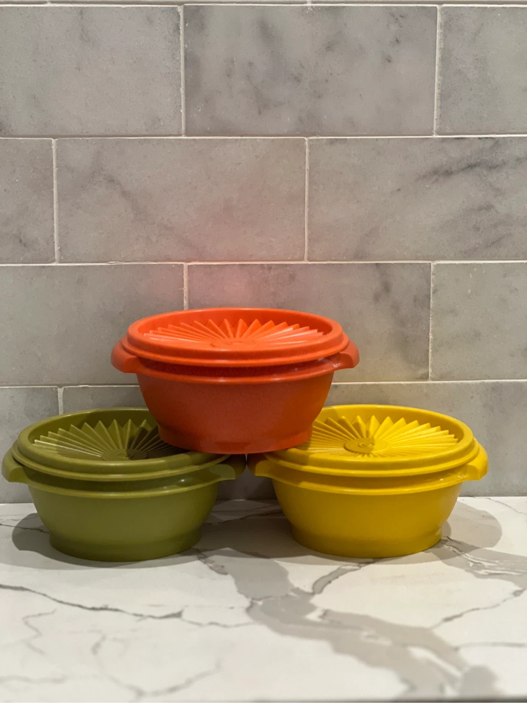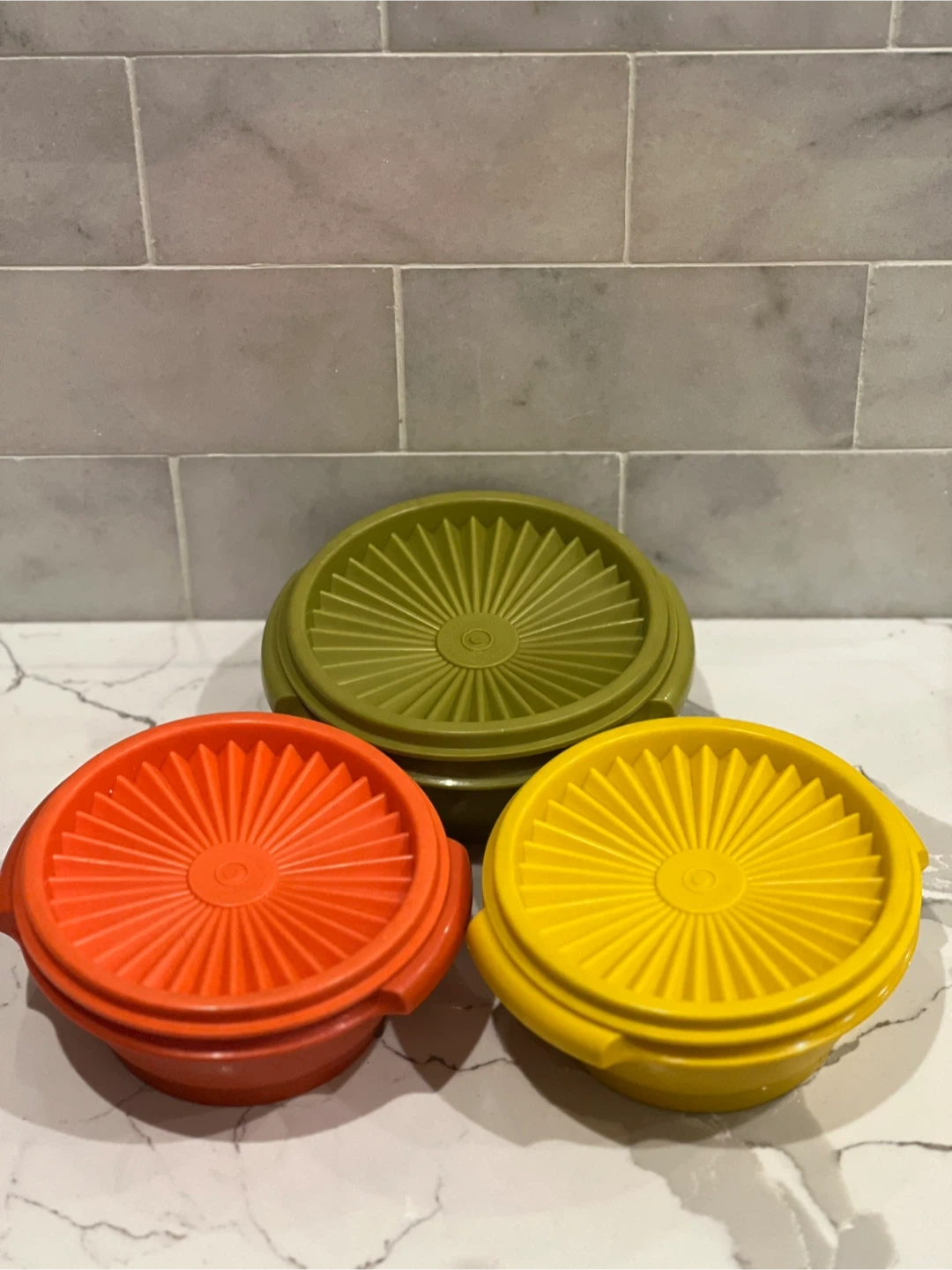 98Selling a set of vintage Tupperware Servalier stacking bowls! The set includes three bowls in vibrant orange, yellow, and green. They're perfect for storage or serving, and the lids have a unique sunburst design. Great for adding a pop of color to your kitchen!