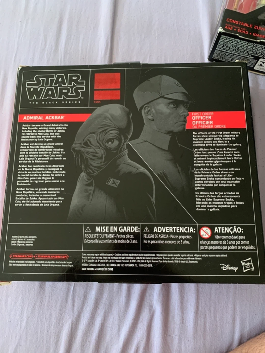 Selling a Star Wars The Black Series set featuring Admiral Ackbar and a First Order Officer. This set is perfect for any Star Wars collector or fan! The packaging is in great condition and includes both figures with their accessories