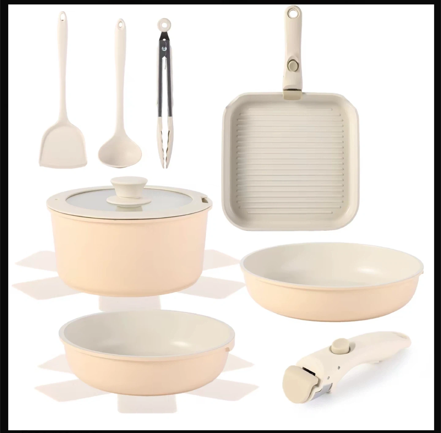 Selling a Chanyo Cook 12-piece pots and pans set in a lovely hazelnut color! This non-stick cookware set comes with a detachable handle and is oven safe. It's also PFOA and lead-free, making it a healthy choice for your kitchen. Great for all stovetops and RV cooking!