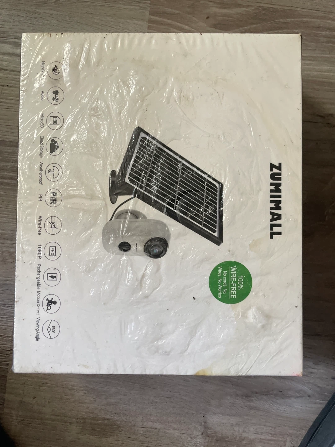 Selling a Zumimall wire-free security camera. It features 1080P resolution, motion detection, and a 130° viewing angle. It supports night vision, audio, Micro SD, and cloud storage. It's also weatherproof! New