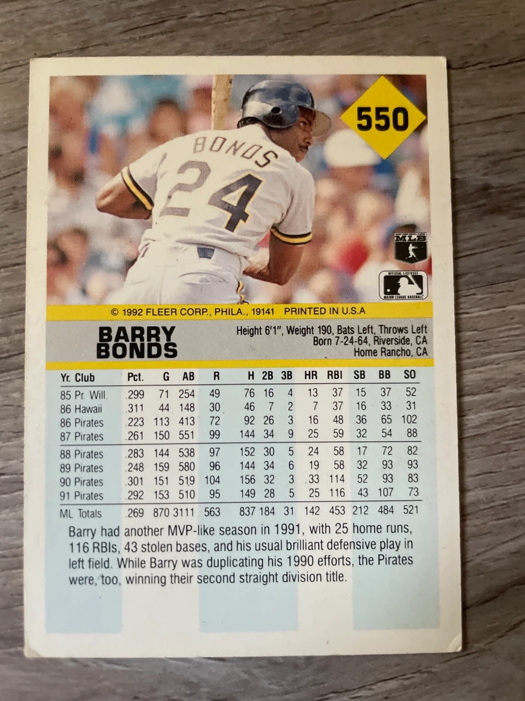 Selling a Barry Bonds Fleer '92 baseball card. It showcases Bonds as an outfielder for the Pirates. The back includes stats and biographical information. A great collectible for any baseball fan!