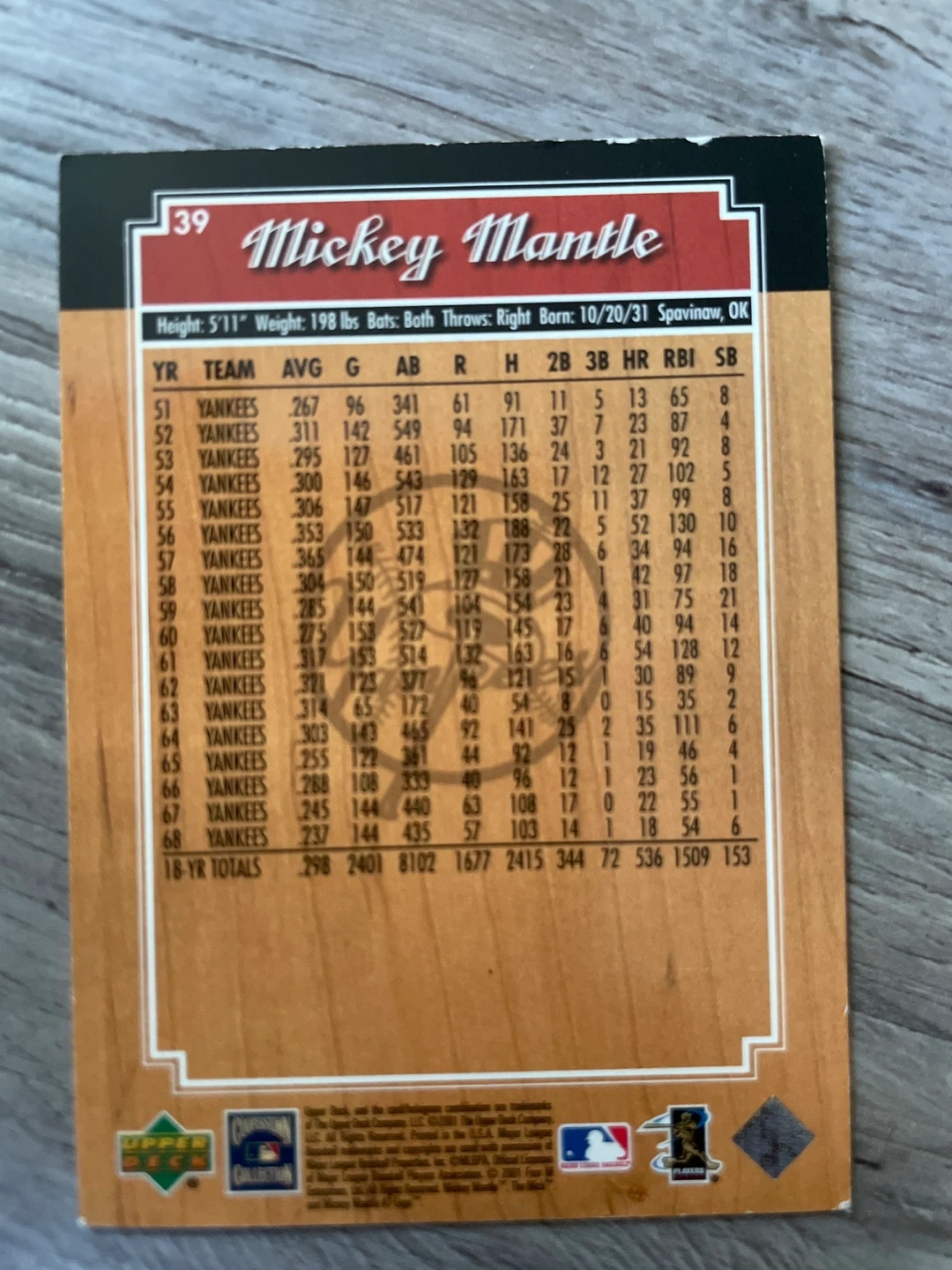 Selling a Mickey Mantle Upper Deck Legends baseball card. It's in good condition and features a classic design. A great addition to any sports memorabilia collection!
