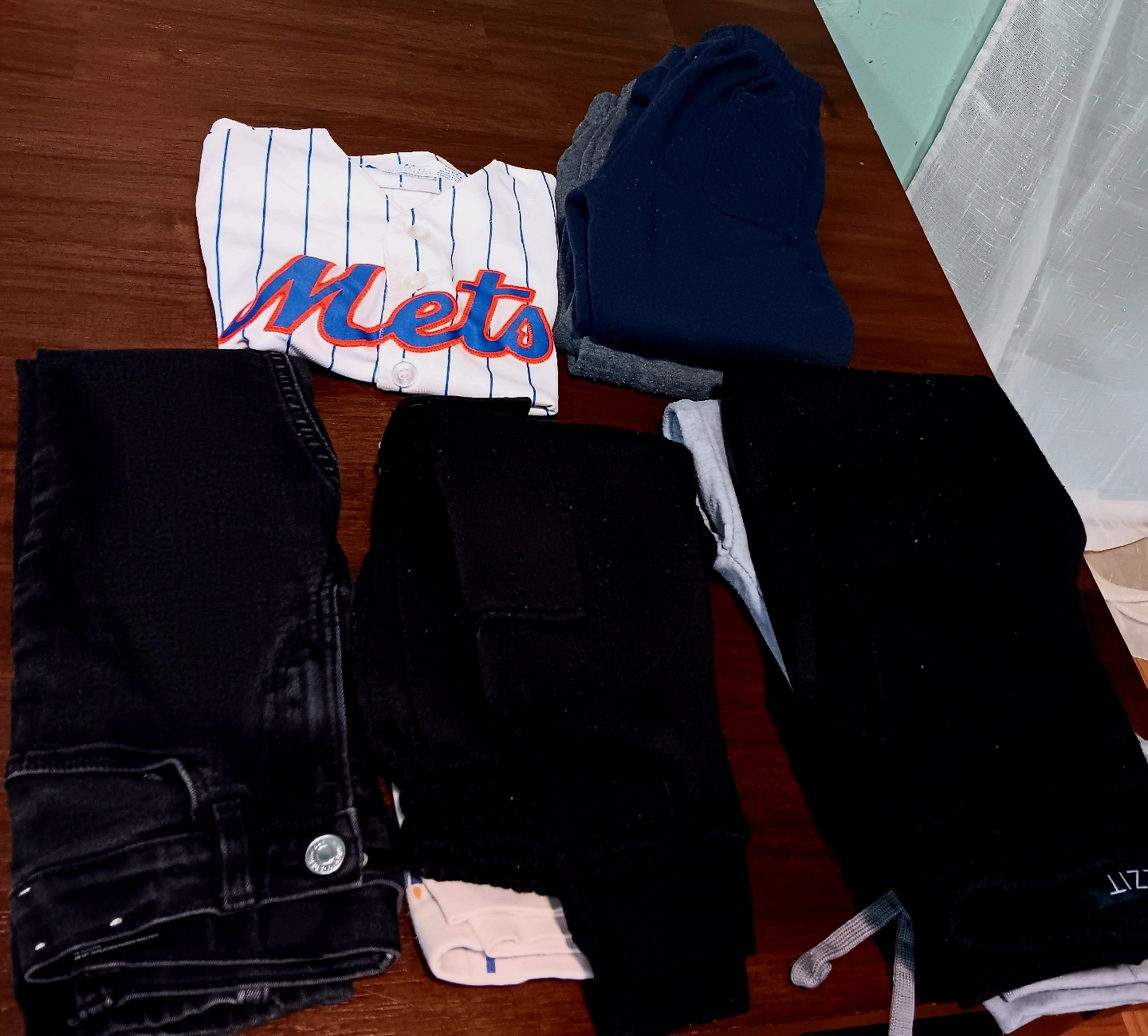 Selling a bundle of assorted clothes. Includes a Mets baseball jersey, a pair of black jeans, and some other items. Great for anyone looking for a variety of clothing!